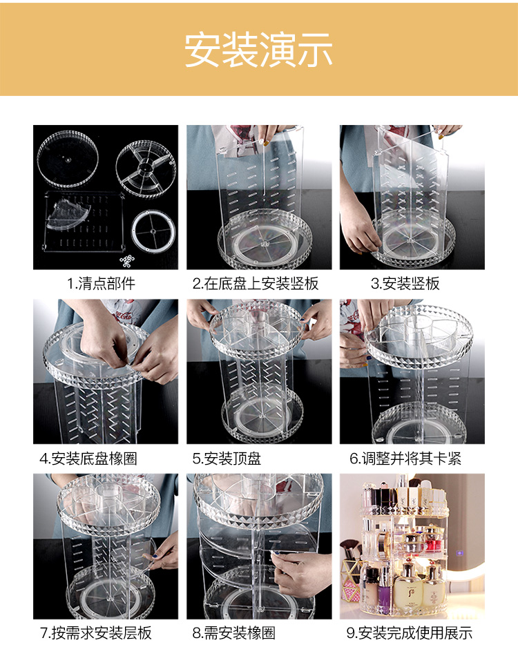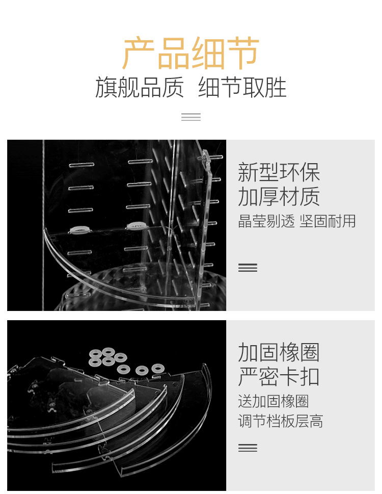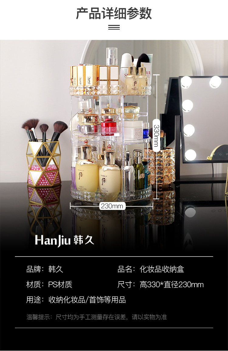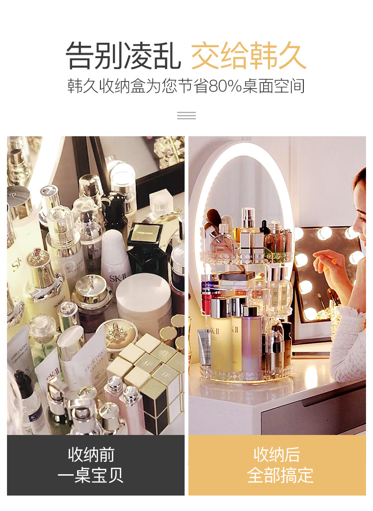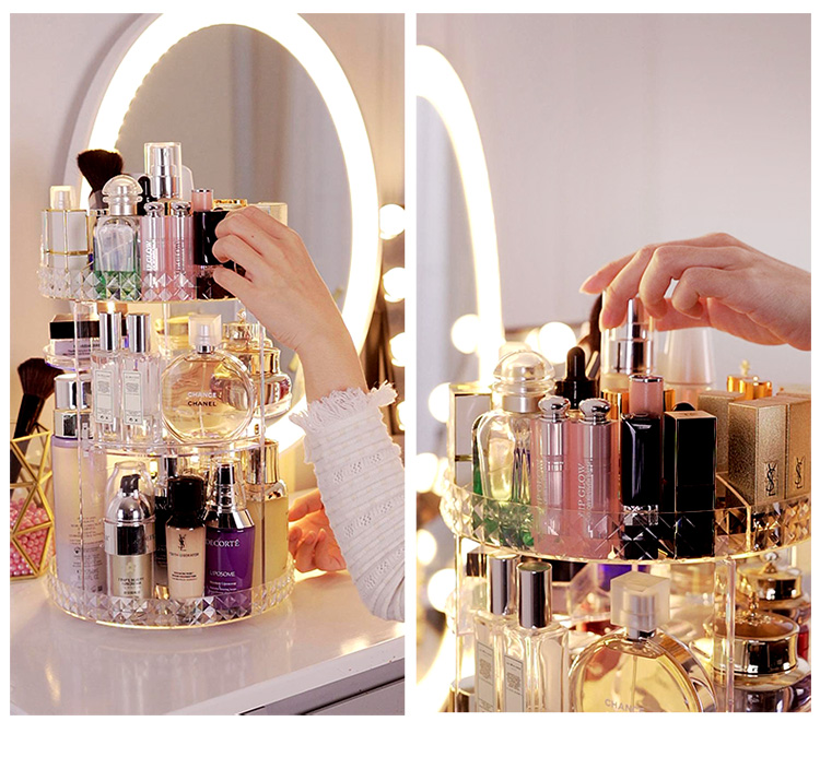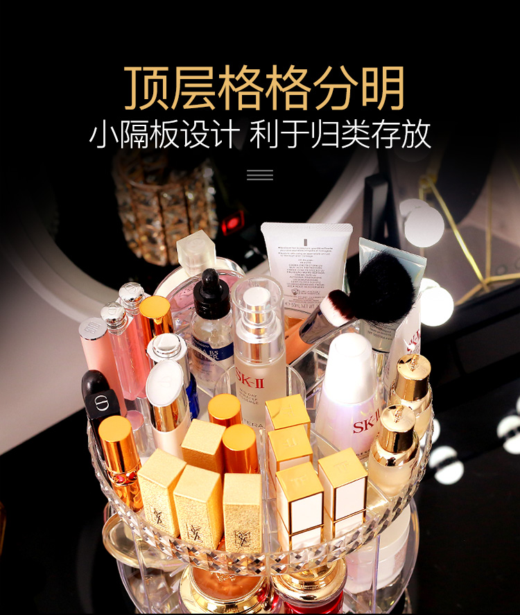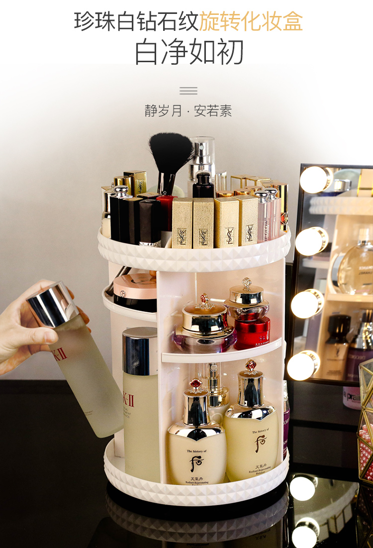 抖音网红爆款,推出360°旋转钻石纹设计,超越99%同类产品!八档层高自由调节,超大容量随转随取。环保加厚亚克力,美观实用,女神必备!
