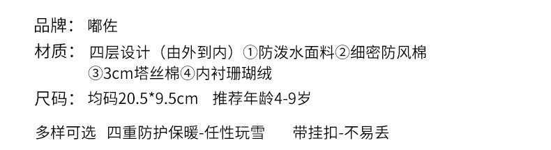 【嘟佐旗舰店】儿童冬季外出保暖手套,加厚内里,带防丢绳防丢扣,卡通刺绣设计,柔软绒毛内衬,绒面细腻,手感柔软,舒适保暖,多种款式可供选择。
