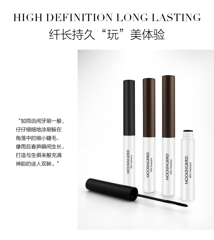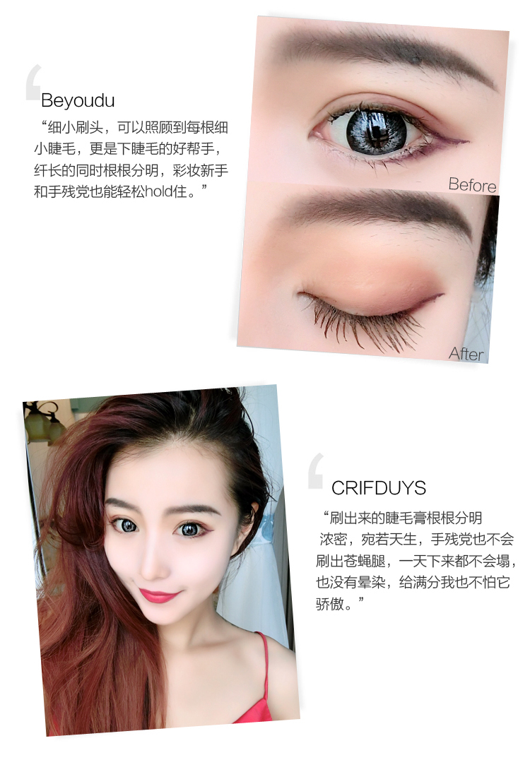 纤长卷翘睫毛一刷即现,含柔滑配方因子,精细小刷头,打造浓密美睫妆效,防水防汗持久持色,即刻让你拥有迷人电眼!
