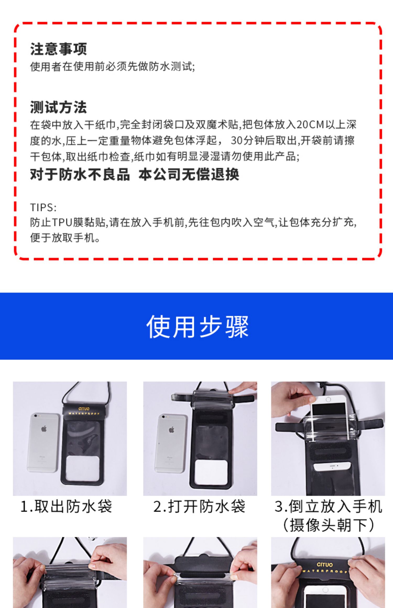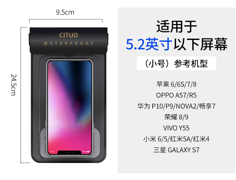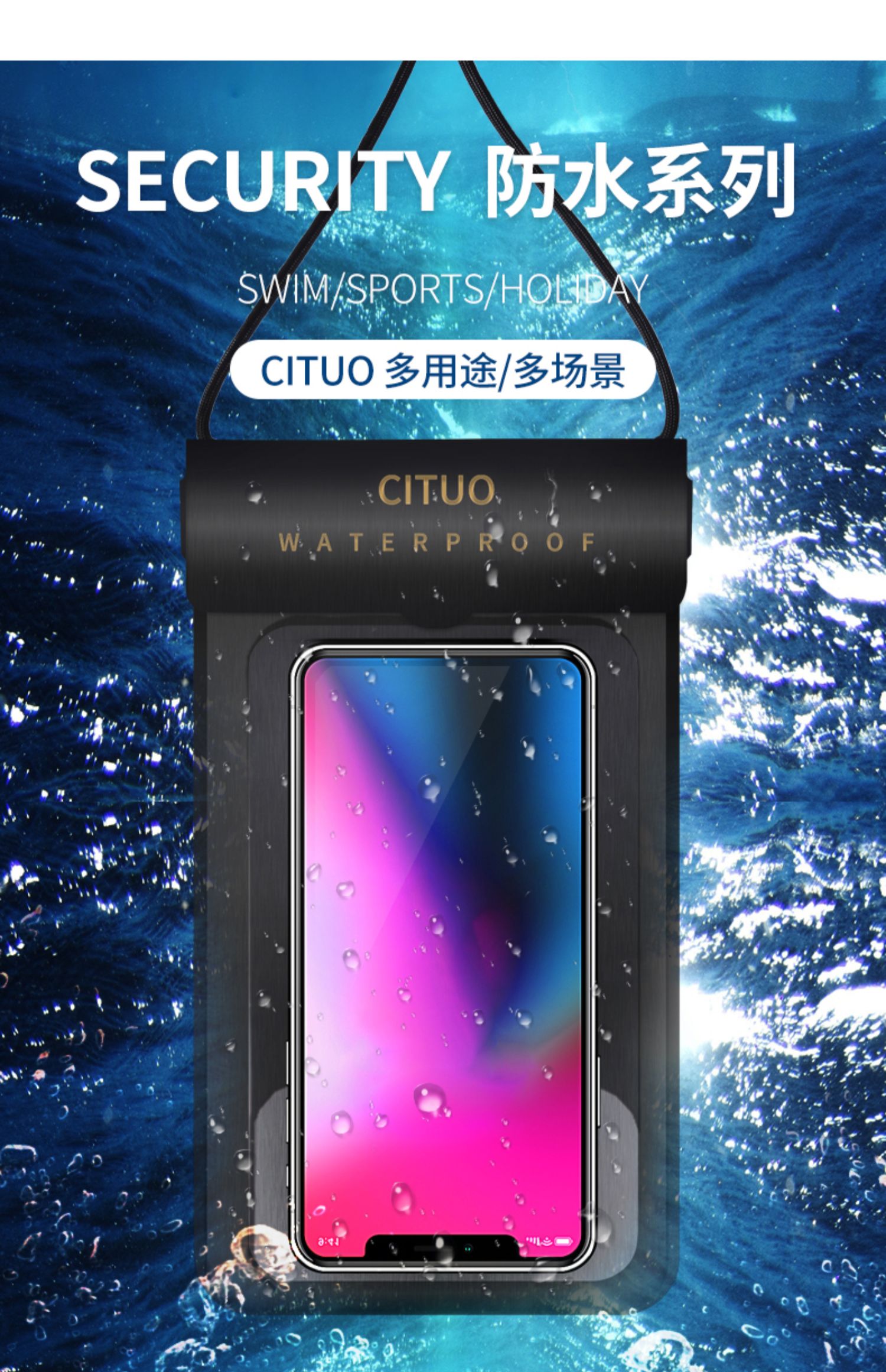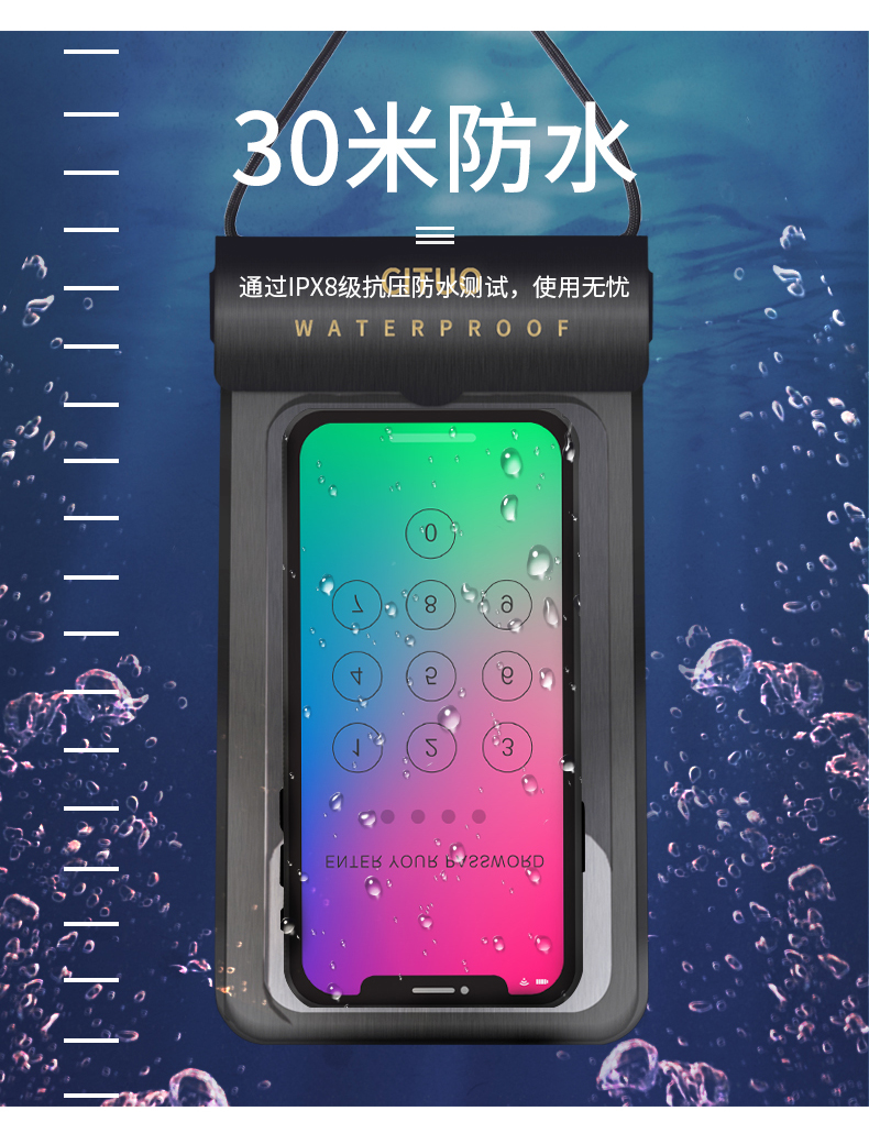 密封条魔术贴强力防护,触屏灵敏,可水下高清拍照、打电话、玩游戏、刷微博,防水抗压,水下30米也能高清拍照,多型号手机通用,玩水也能玩手机,让你的假期轻松惬意~