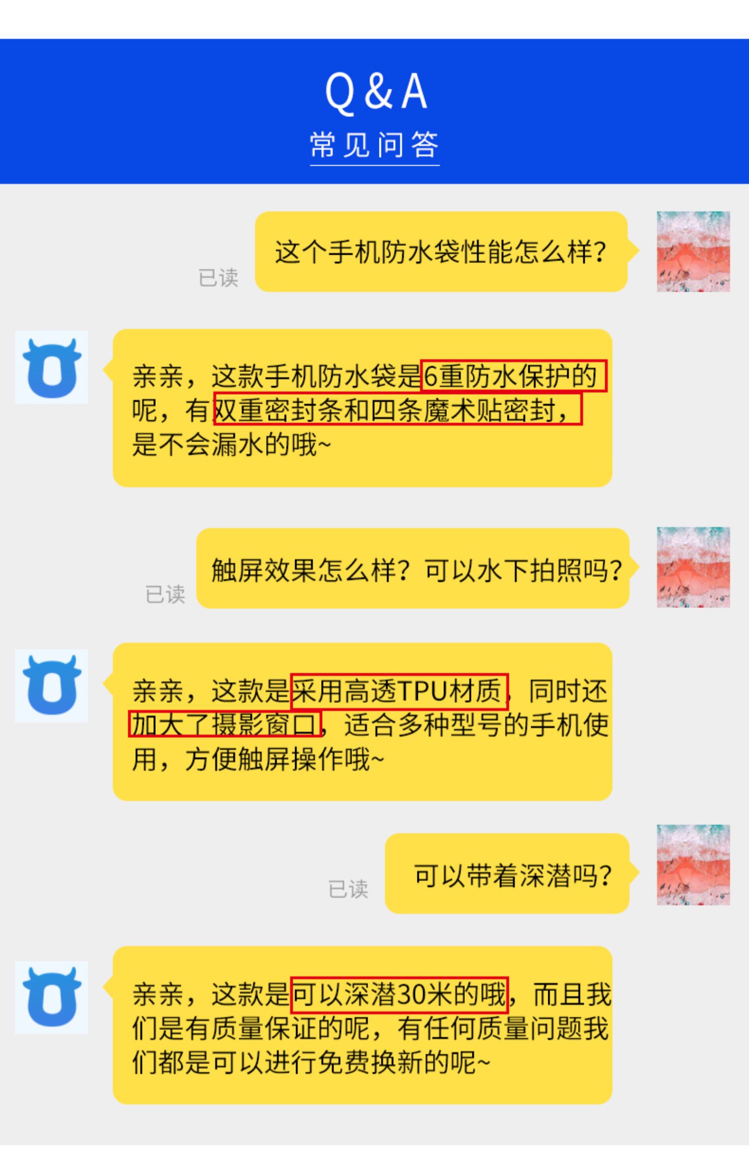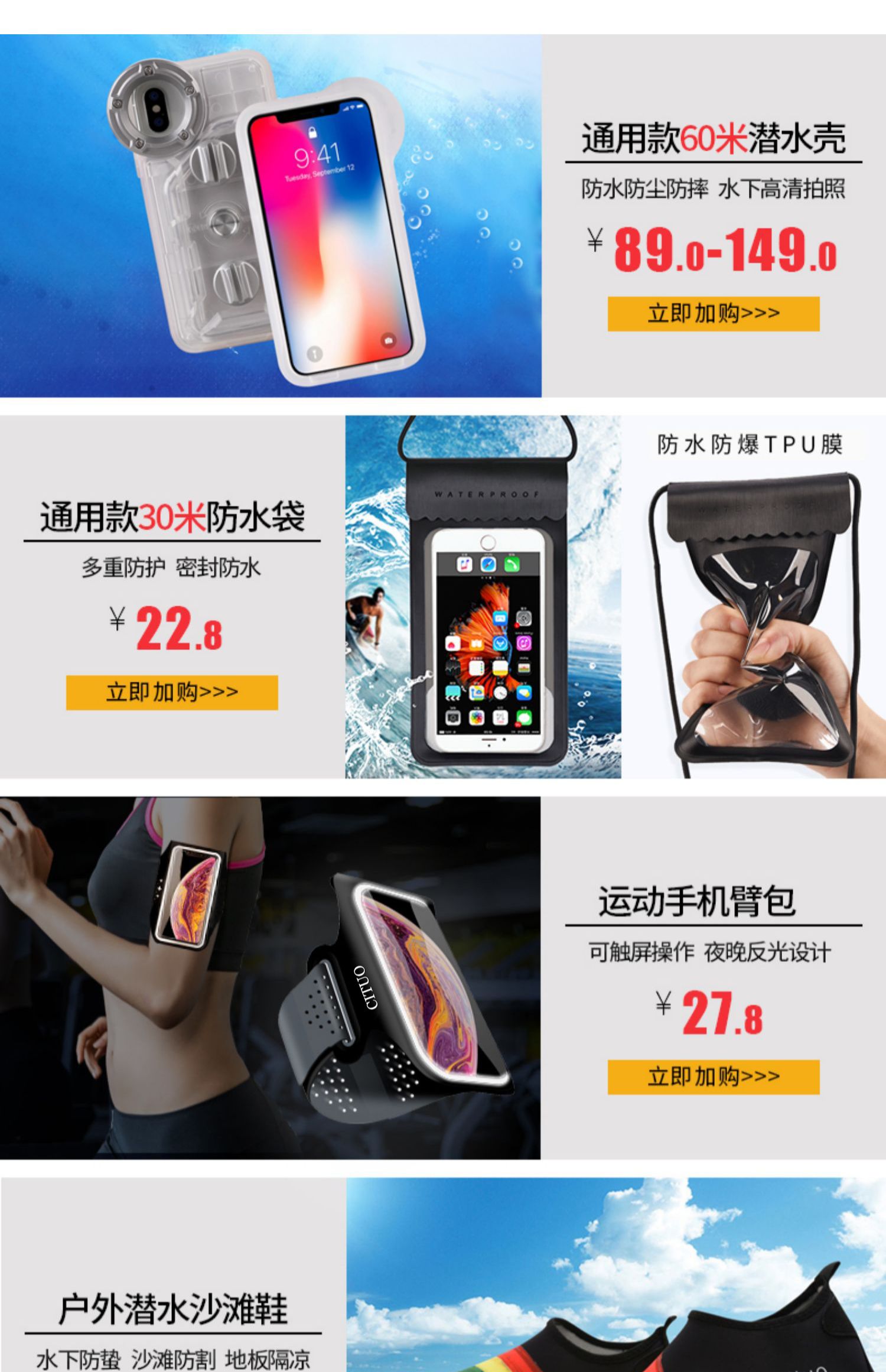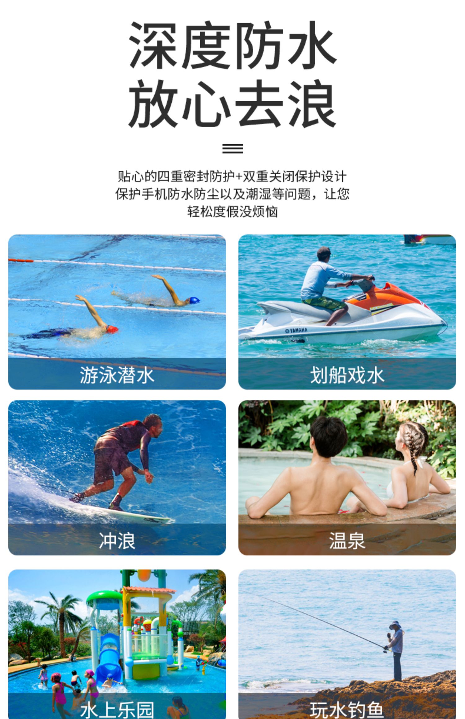 密封条魔术贴强力防护,触屏灵敏,可水下高清拍照、打电话、玩游戏、刷微博,防水抗压,水下30米也能高清拍照,多型号手机通用,玩水也能玩手机,让你的假期轻松惬意~