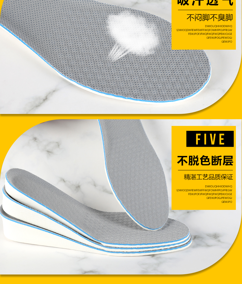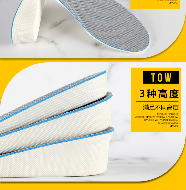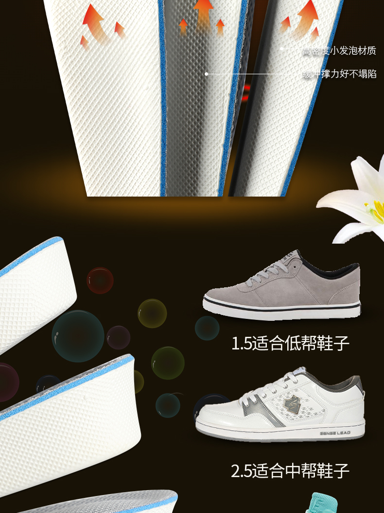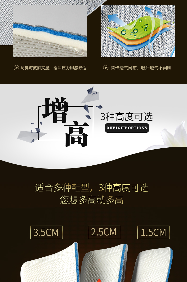 减震片设计,缓震减压,3种高度可选!不易变性,平衡足部受力,吸汗防臭,抗菌防滑不臭脚,舒适新体验,走路不累脚,可循环使用,有高度更自信!