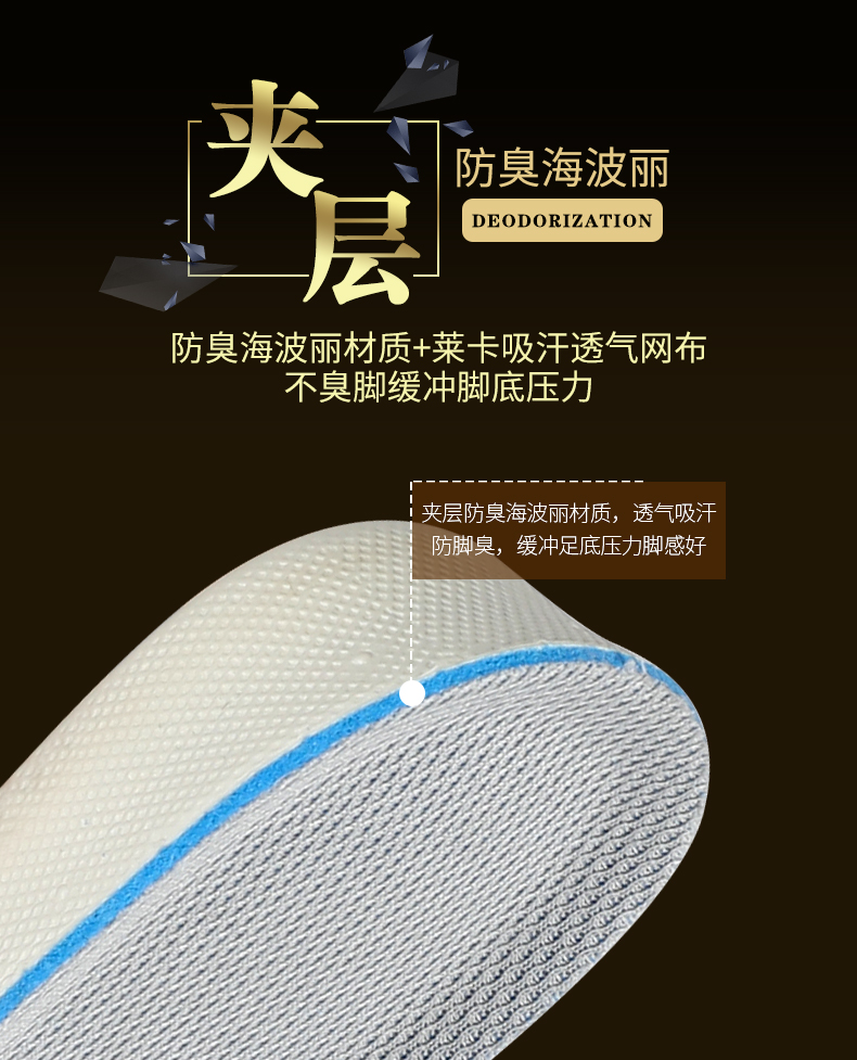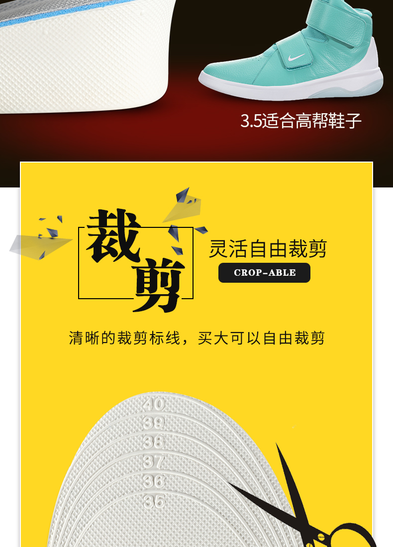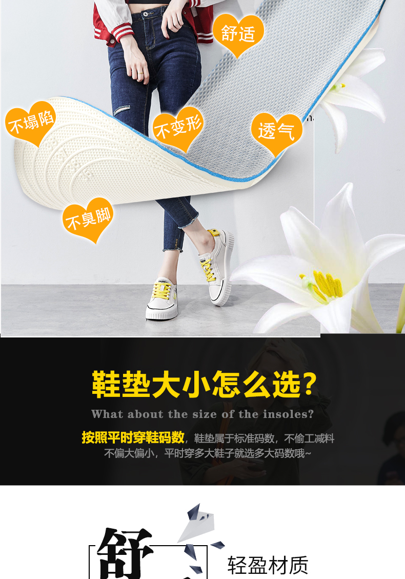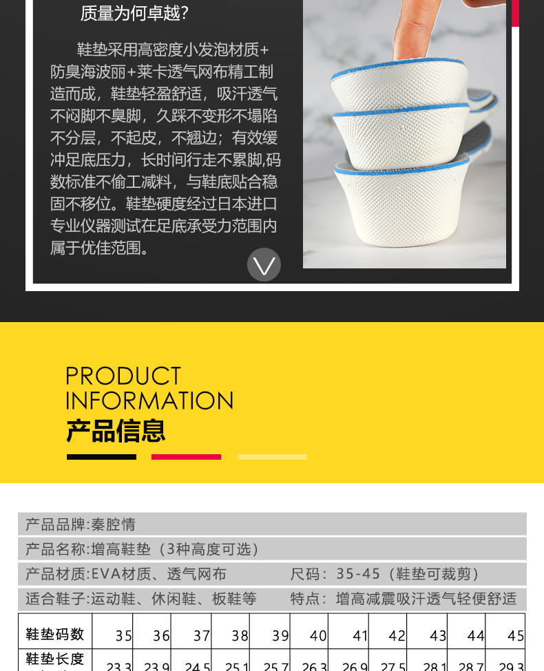 减震片设计,缓震减压,3种高度可选!不易变性,平衡足部受力,吸汗防臭,抗菌防滑不臭脚,舒适新体验,走路不累脚,可循环使用,有高度更自信!
