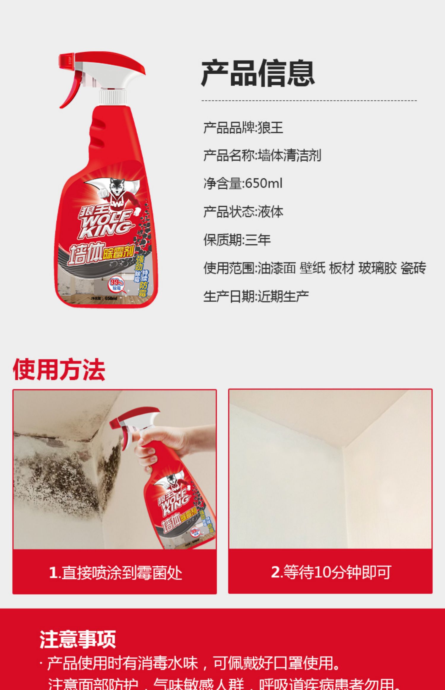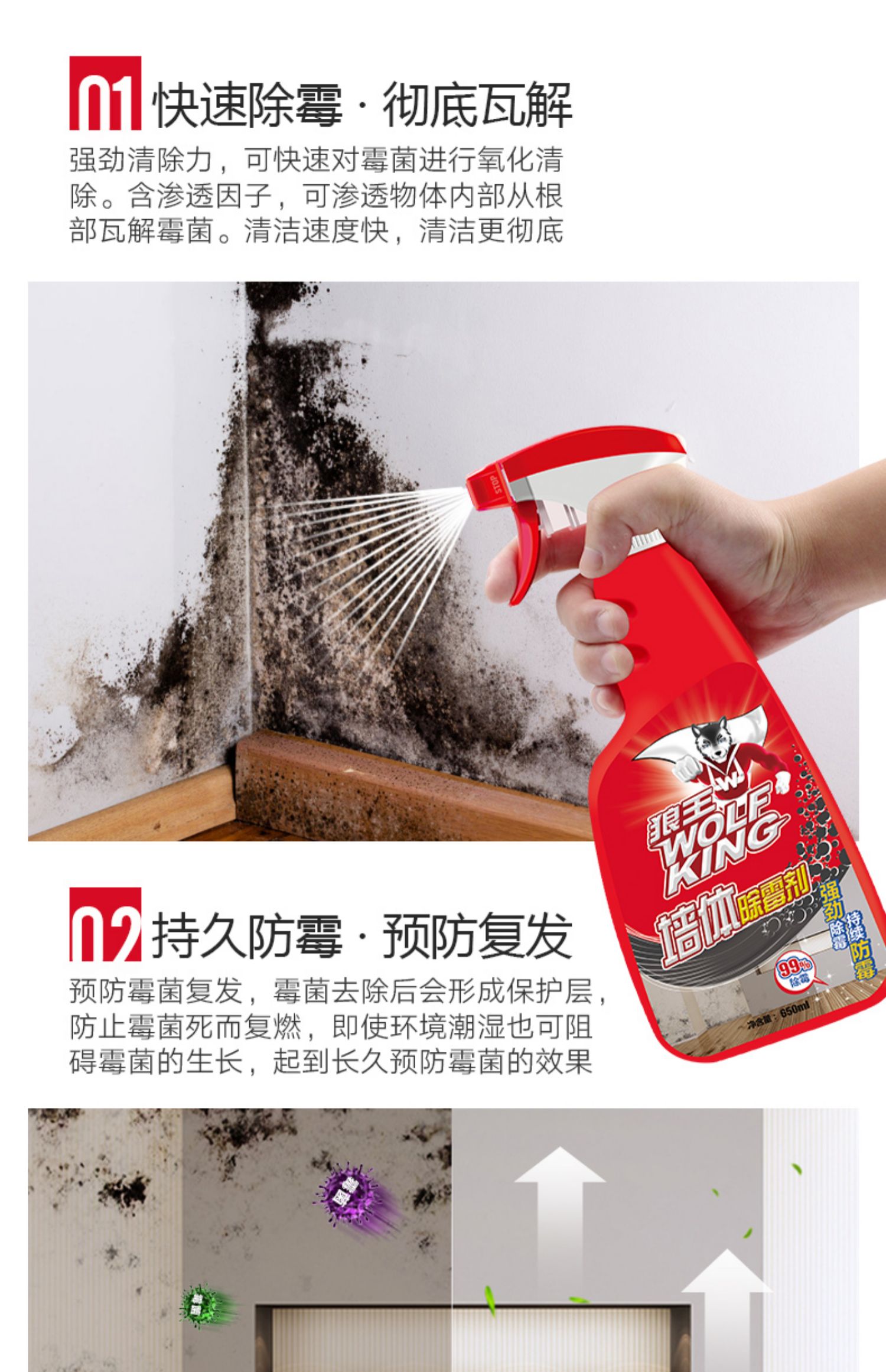 【狼王官方旗舰店!买2瓶送1瓶!更划算!除霉能力超强,喷上去之后擦一下就干净了,像新的一样!房顶墙面,家具发霉,喷一喷,快速除霉五分钟,轻松告别霉菌困扰!