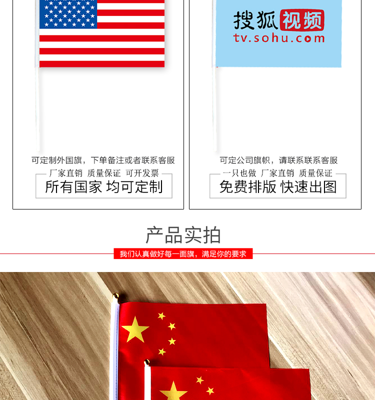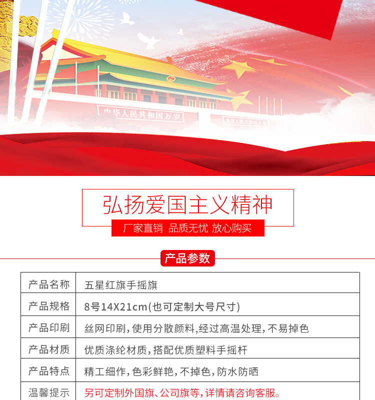 手摇小五星红旗,每一张红旗杆子都带有小金珠防走位,纯色包边,走线齐整,细节决定品质!丝网印刷工艺,图案清晰可见,防抽丝工艺,入水不脱色,下雨天照样飘摇!