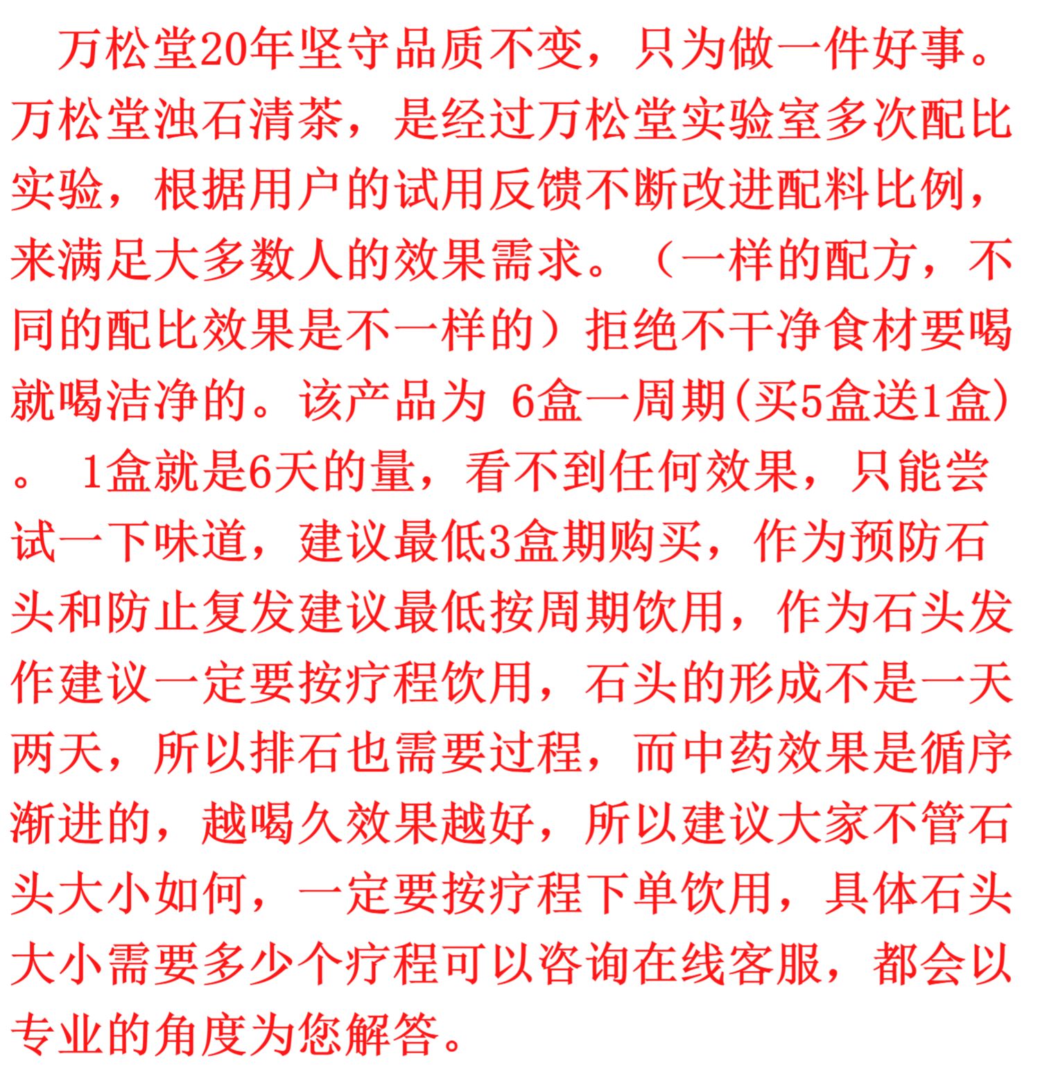正品保证,药食同源,健康茶饮,八种天然原材料萃取而成。草本原料产于神农架,高山雪水灌溉,阳光直晒,自然生长,手工采摘,店主亲测,去石成功。【赠运费险】
