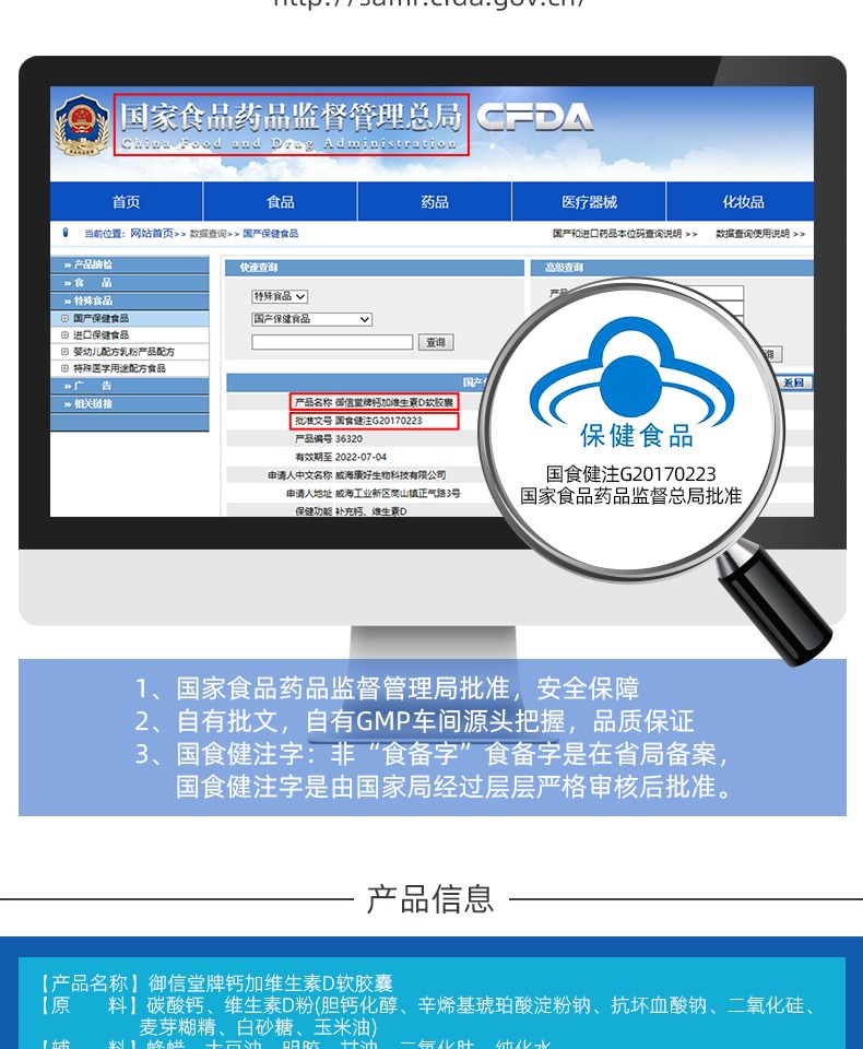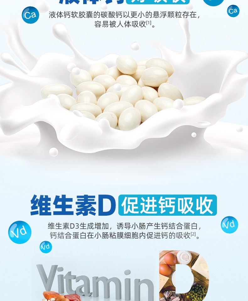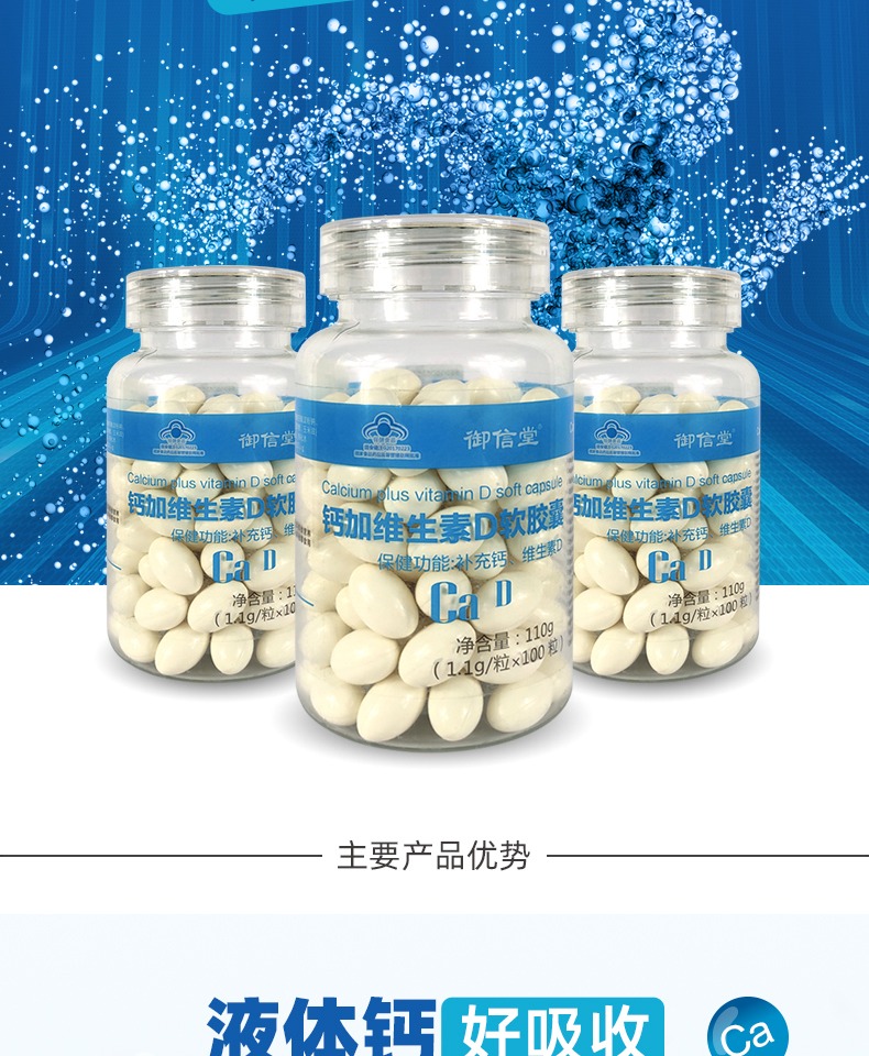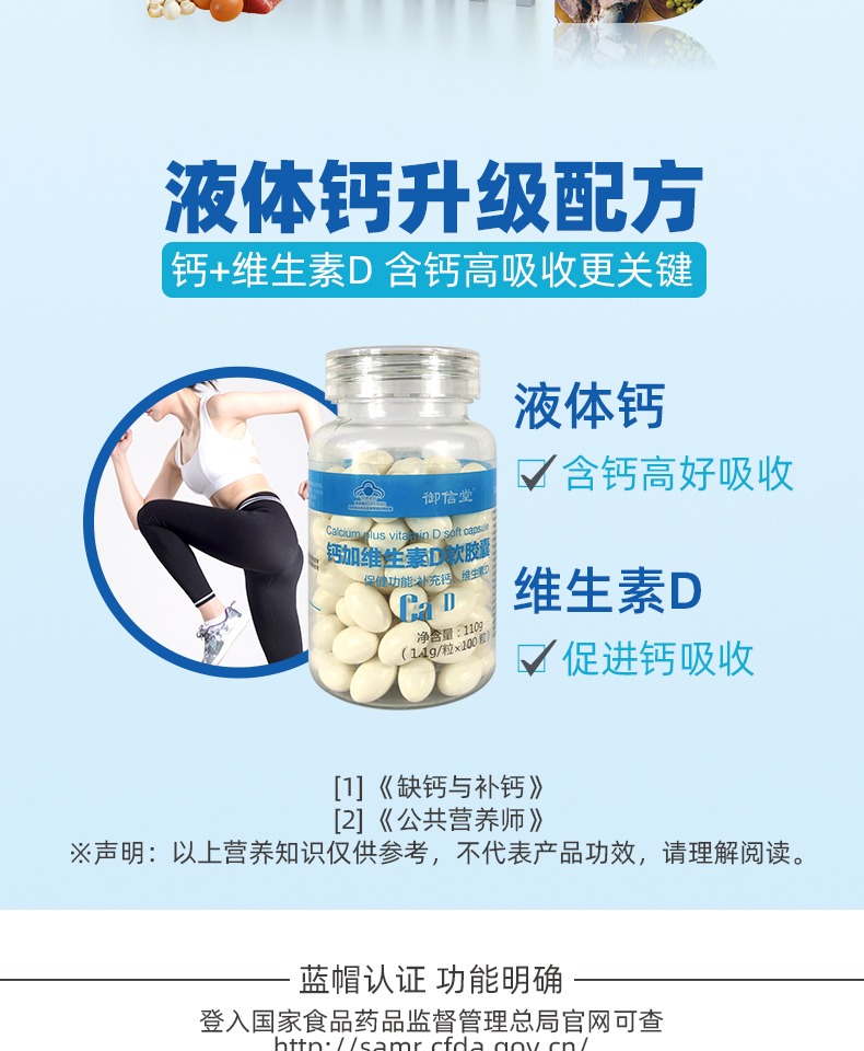 国家药监局认证产品有保障,钙加维生素D液体钙软胶囊~液体的钙质更好吸收,助力骨骼成长!增加骨密度,有效改善关节疼痛、骨质疏松,让家人走路更有劲!