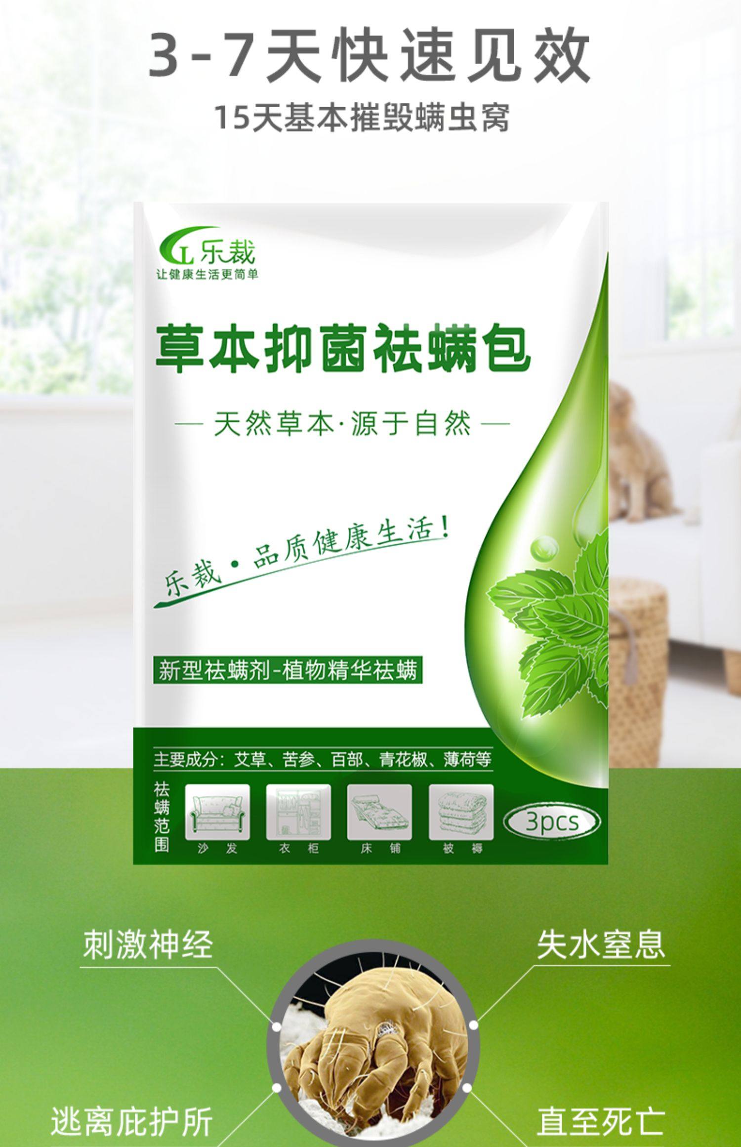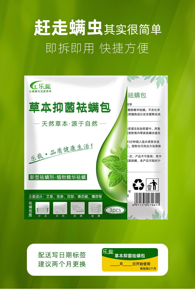 【买二送一】99.90%除螨,植物配方,有效除螨不伤人,1包就能持续2个月,超划算!清新不刺激,有助于睡眠,减少被褥,枕头体味,有效防止螨虫的滋生,天然安全。长效除螨,对您的家人孩子更深层的保护。