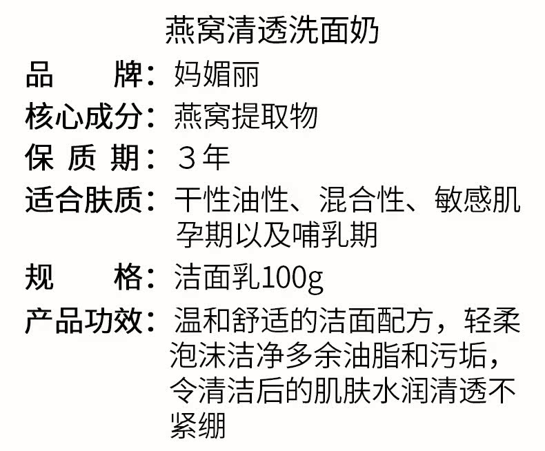 妈媚丽孕妇洗面奶,专为孕妈设计,添加燕窝成分,深层滋养肌肤,温和水润不紧绷,清爽不油腻,通过安全检测,健康更安心。