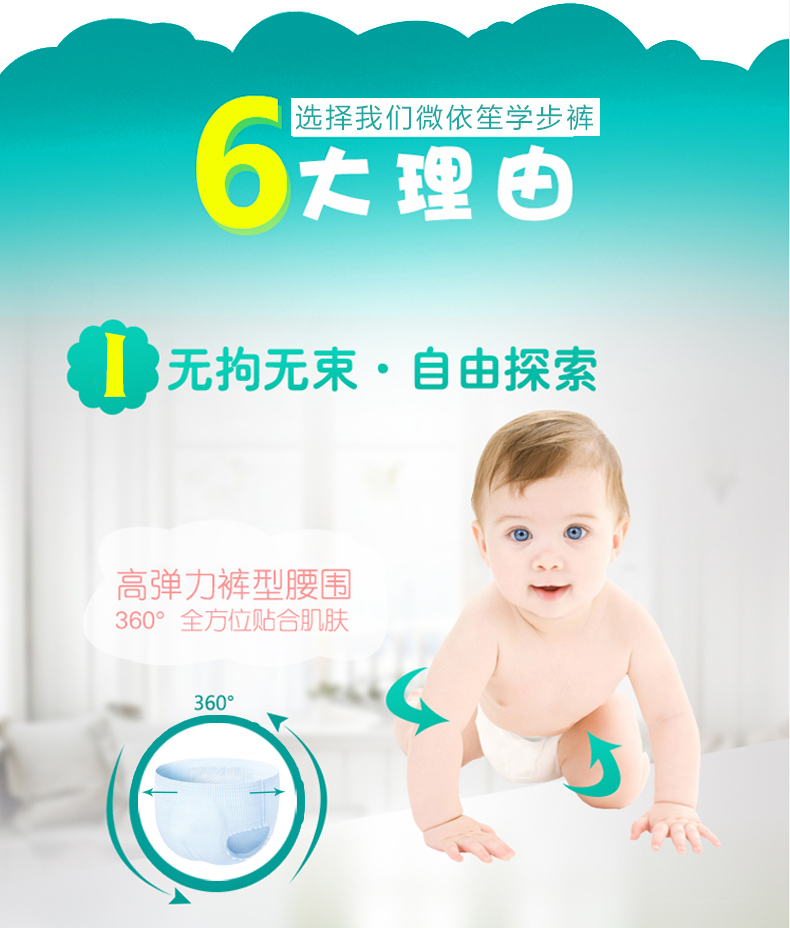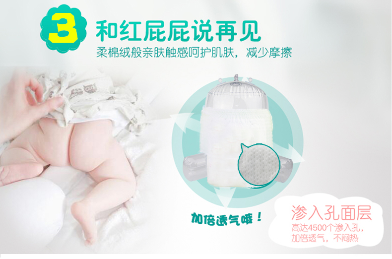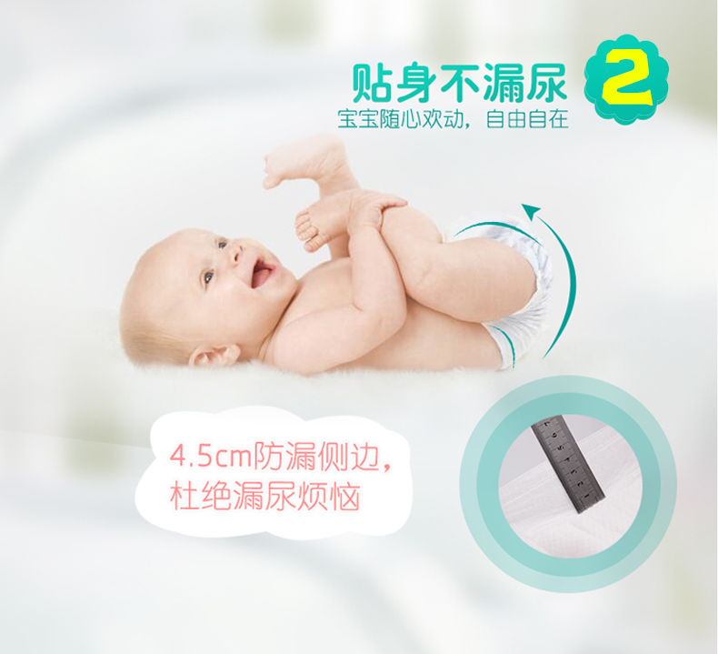 4.5cm防漏侧边,杜绝漏尿烦恼,高弹力裤型腰围,360°全方位贴合肌肤,柔棉绒般亲肤触感呵护肌肤,减少摩擦,呵护娇嫩小屁屁,并排除闷热湿气