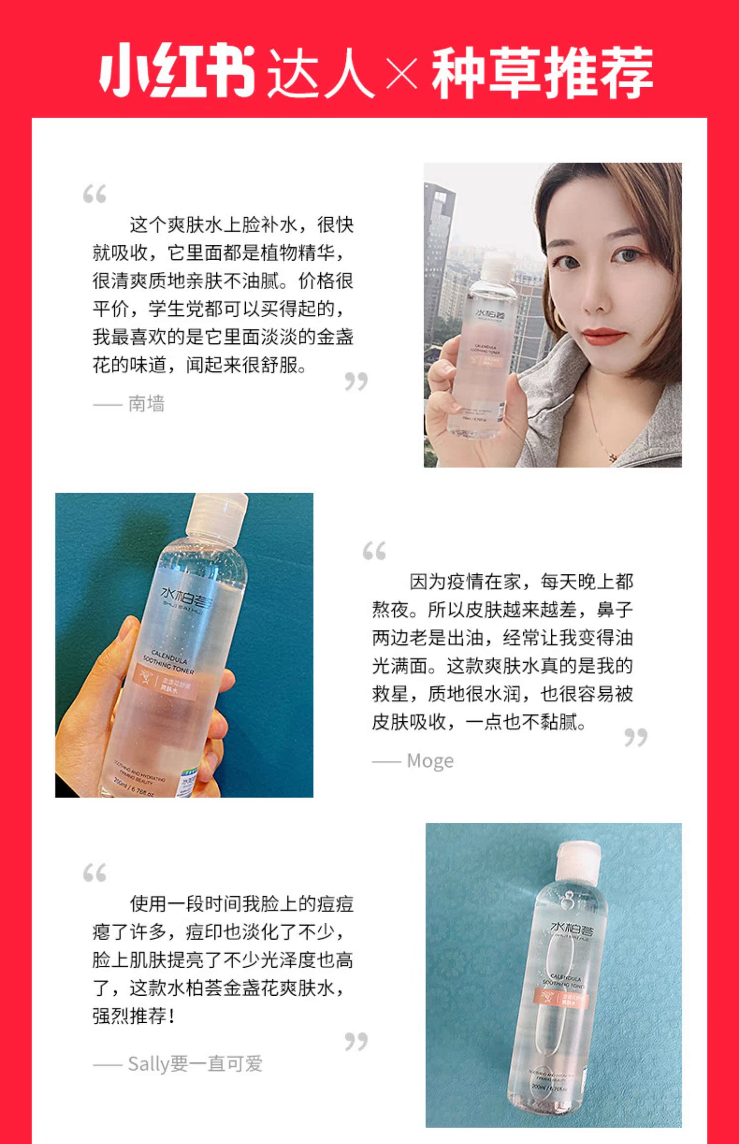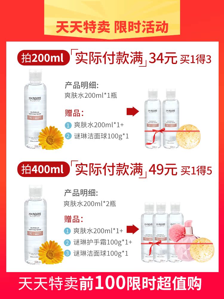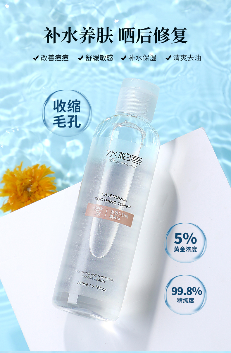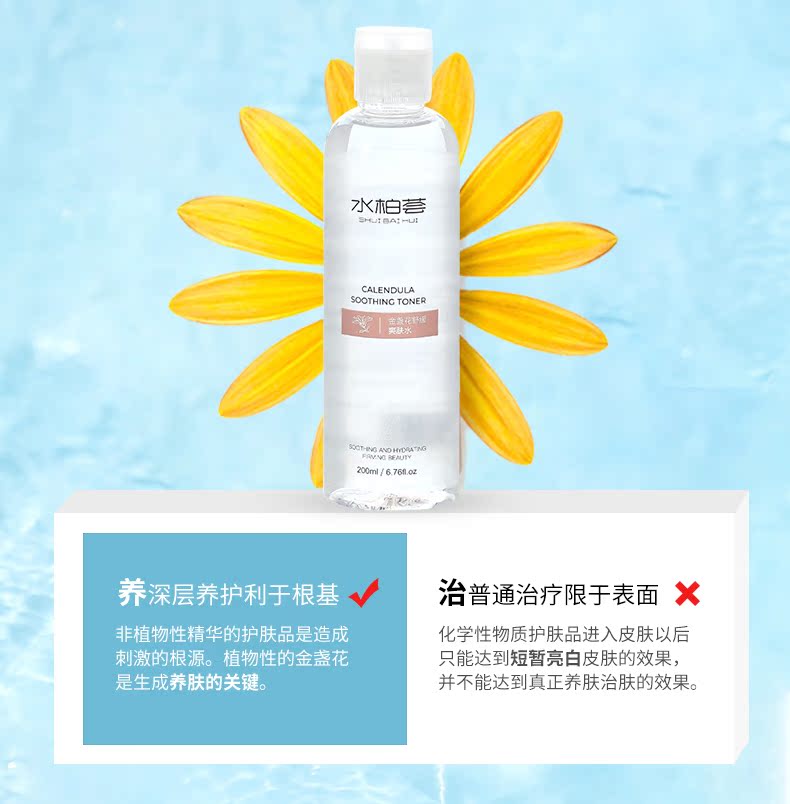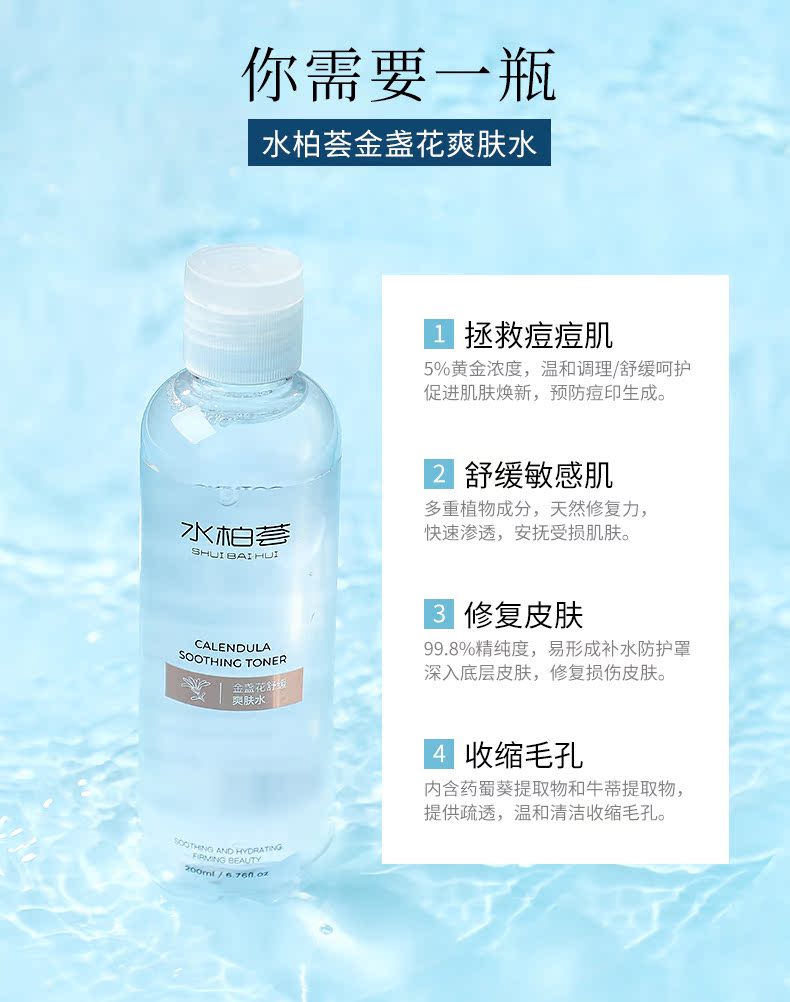 水柏荟金盏花爽肤水,纯植物提取温和透亮让您再现水光肌,只需一瓶,拯救痘痘肌,舒缓敏感肌,修复皮肤,质地清爽。