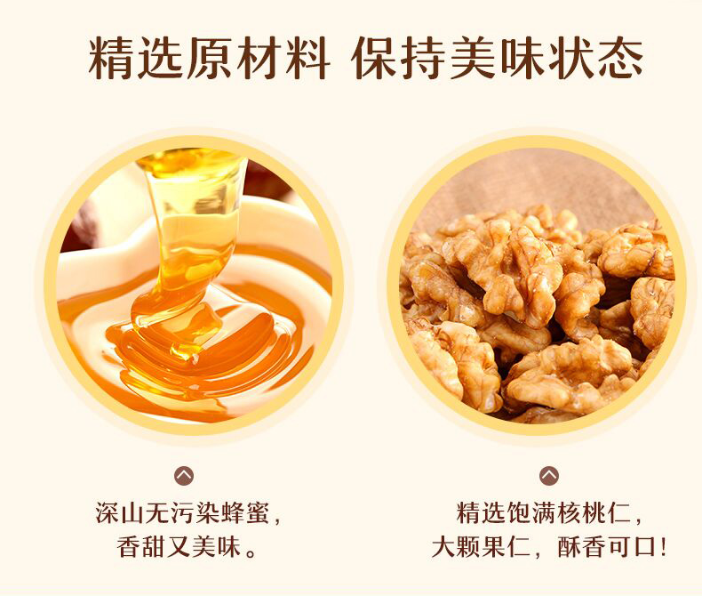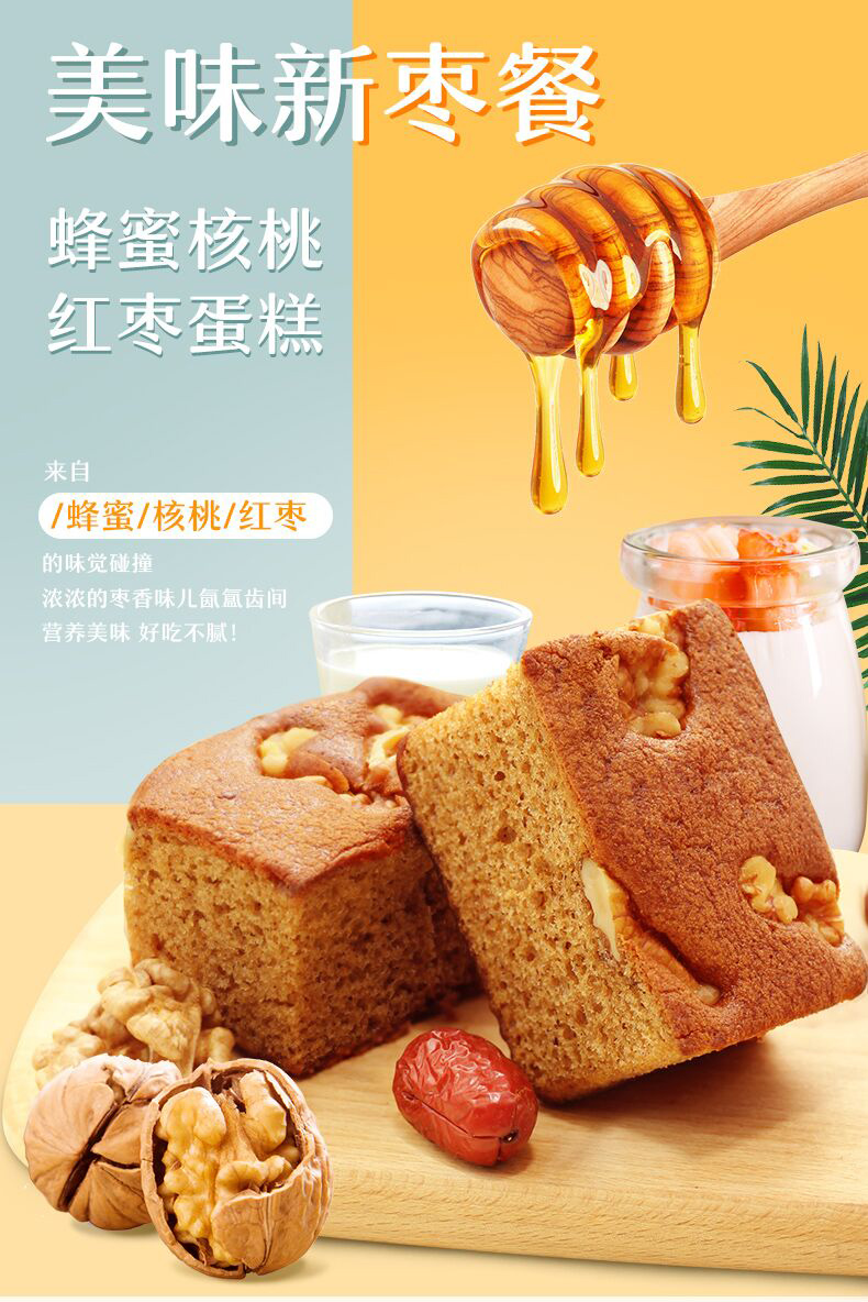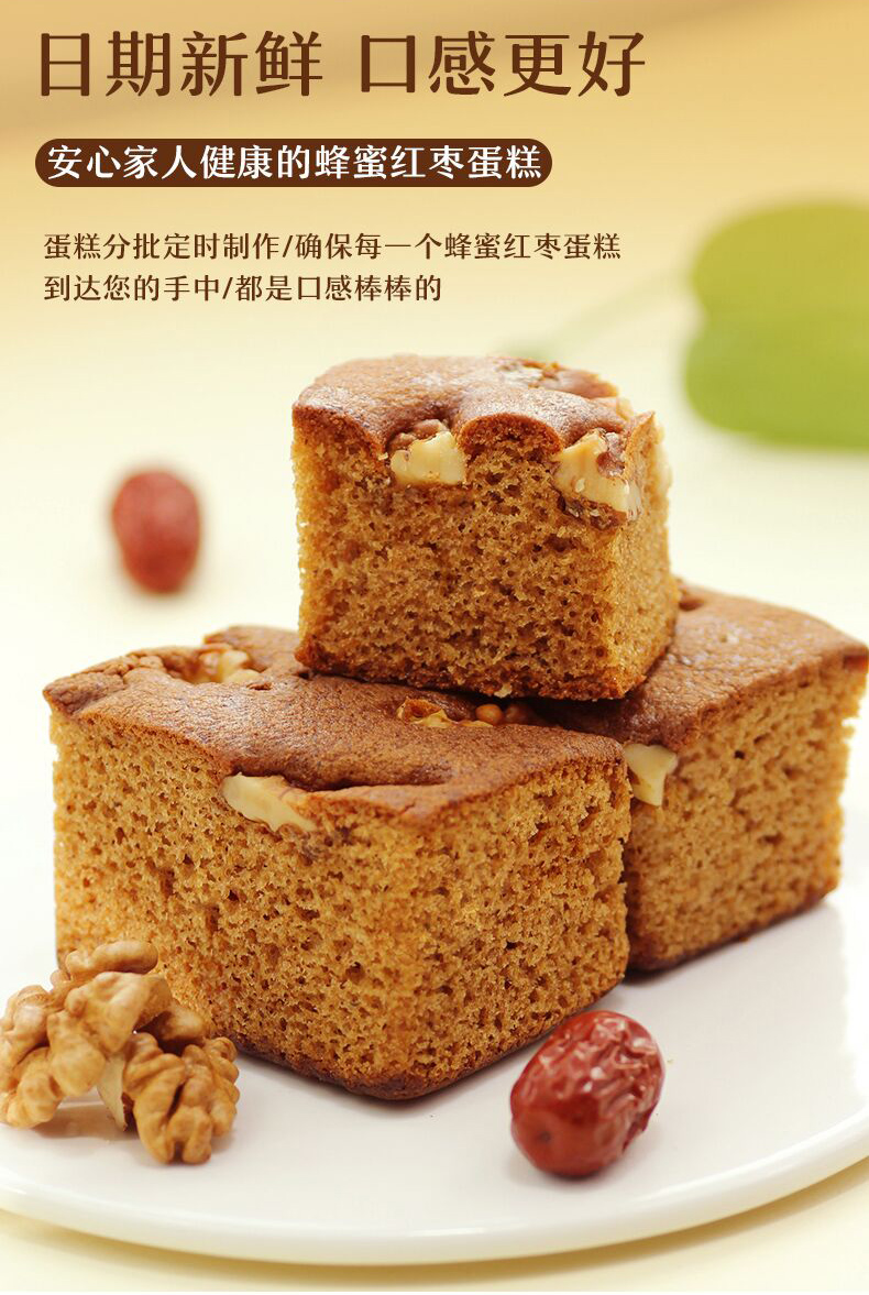 深山无污染蜂蜜香甜又美味,大颗饱满核桃仁,酥香可口,鸡蛋和面,更加香甜~ 整颗大蜜枣肉,精选小麦粉,咬一口满满的枣味,香甜松软,口感棒,当早餐也不错哟~立包装携带【赠运费险】