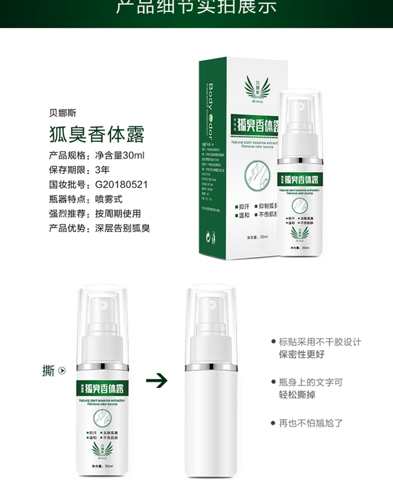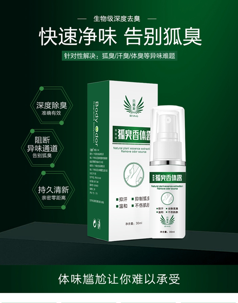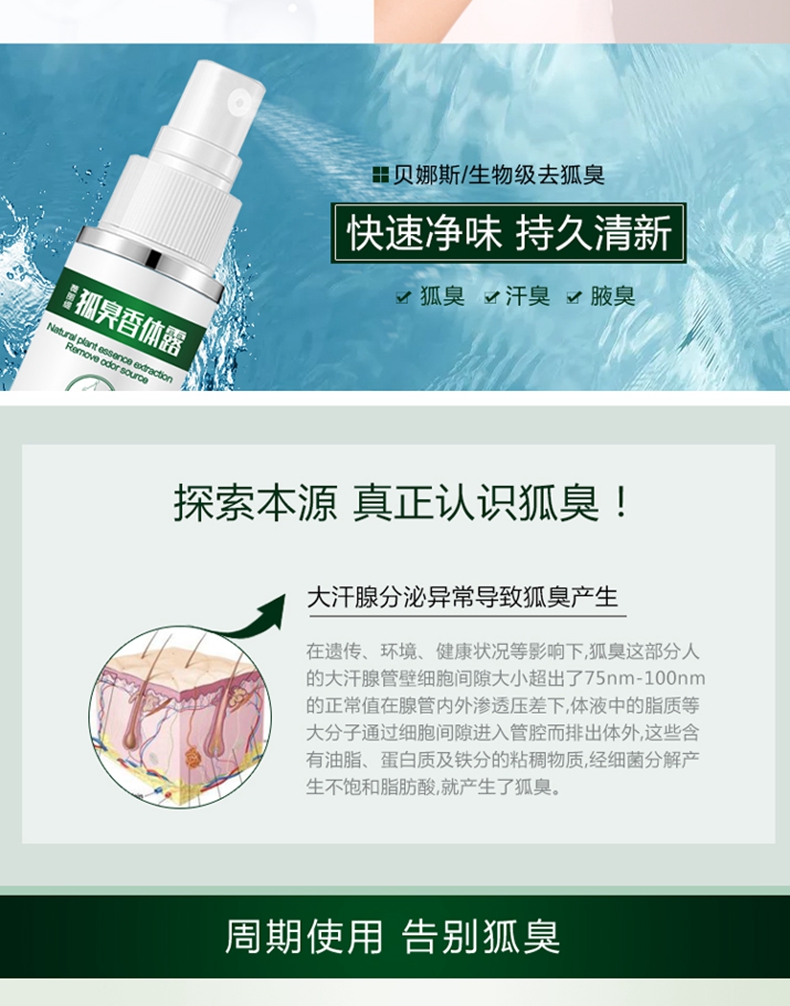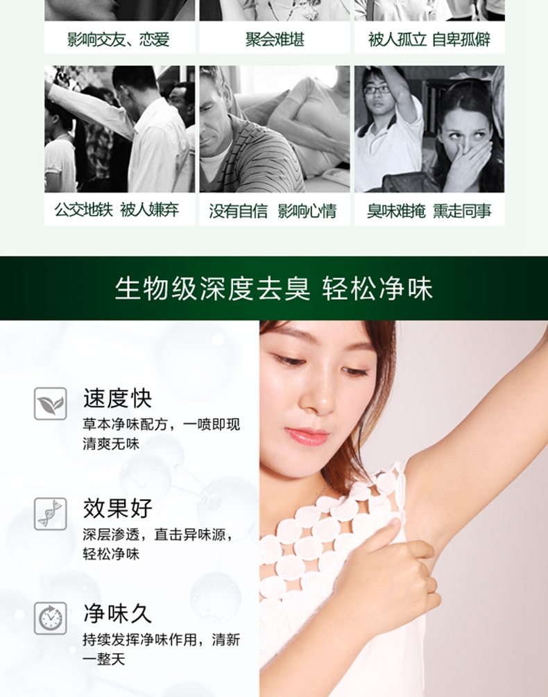 生物级深度去臭,草本净味配方,一喷即现清爽无味,深层渗透,直击异味源,快速净味告别狐臭,