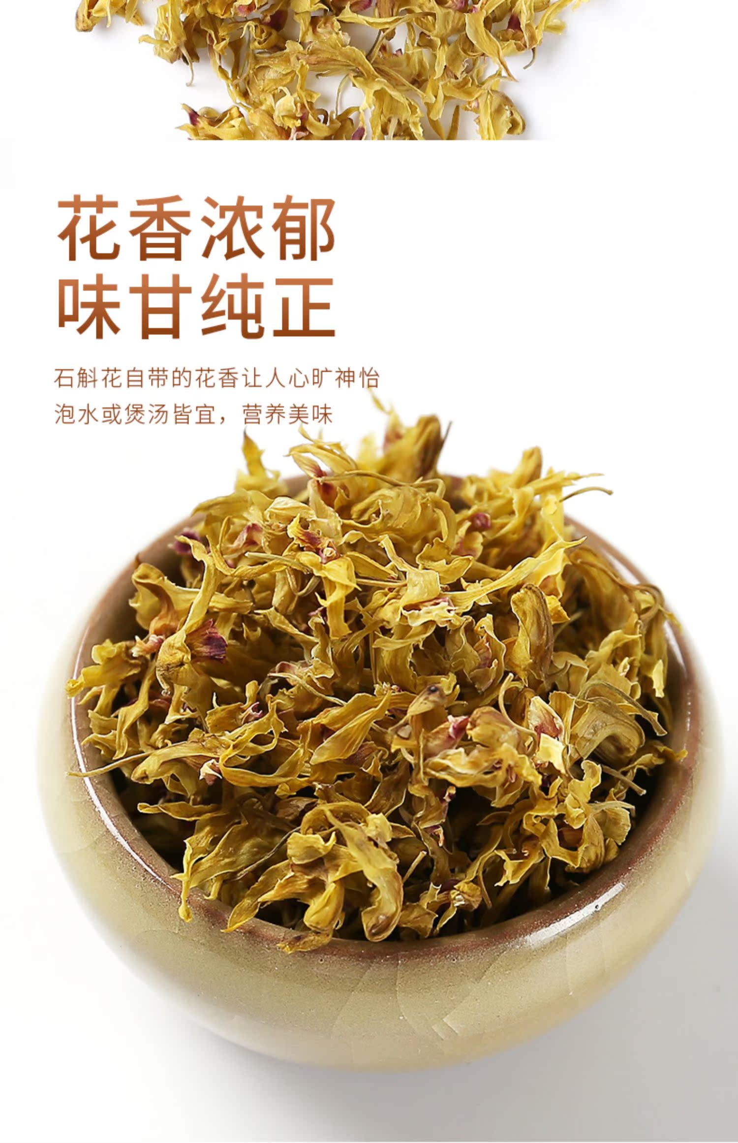 原生态石斛花,仙草下凡,花气清香,天然无添加,自然晒干,人工挑选!增强免疫,促进消化,护肝利胆,抗瘤明目,营养价值高,养生保健,滋补佳品!
