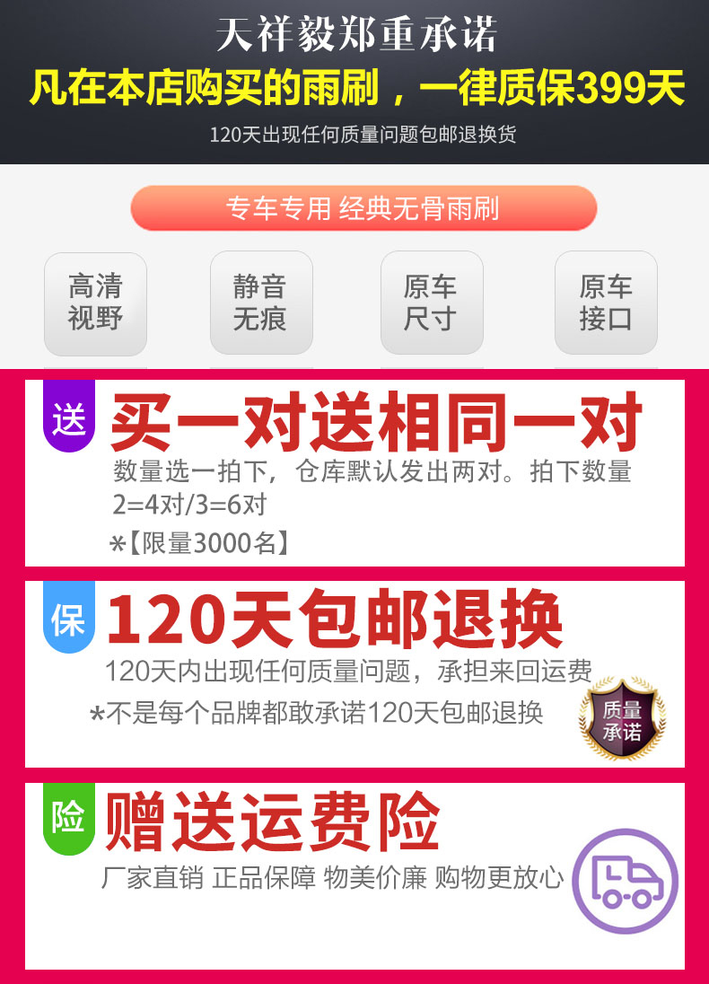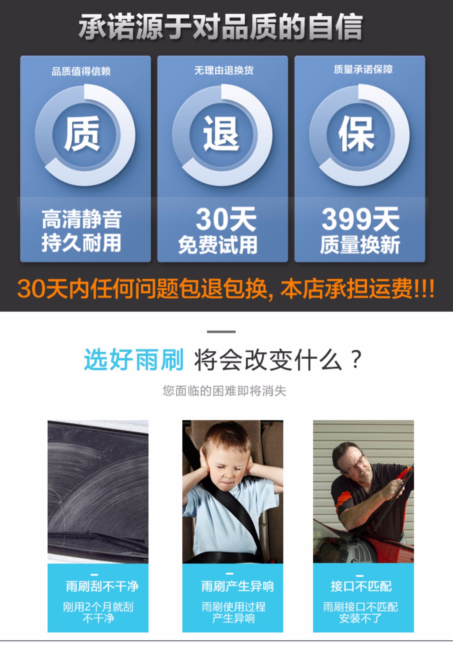 精品好雨刷,敢质保399天的雨刮器,88万次刮拭实验,告别频换更换雨刷的烦恼,高清静音耐用,老司机推荐!适合99%的车型,拍下务必留言车型和年份!