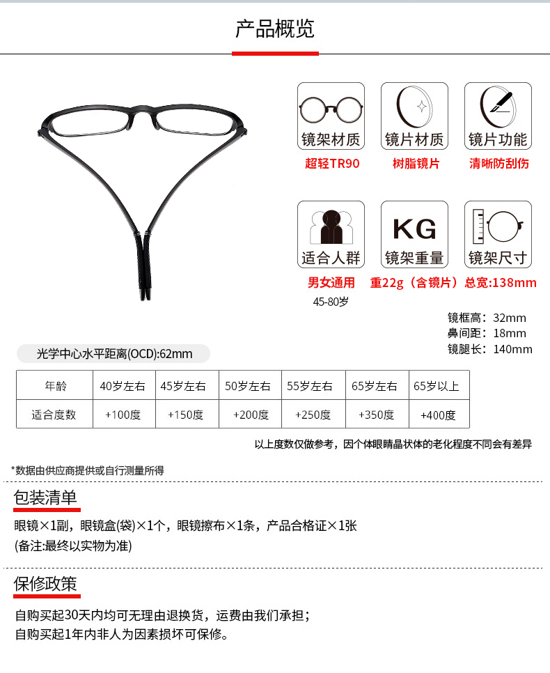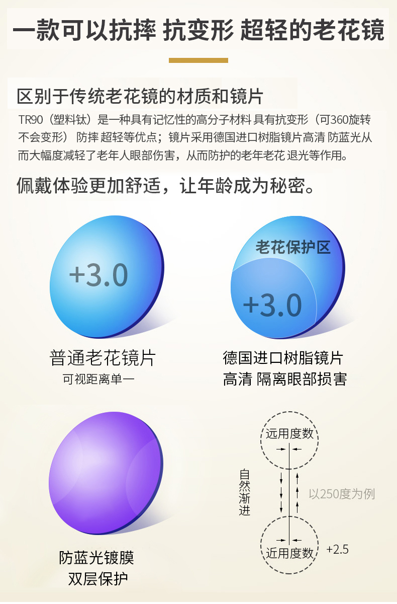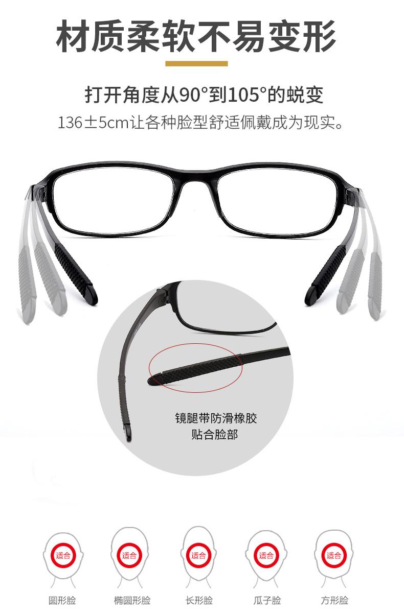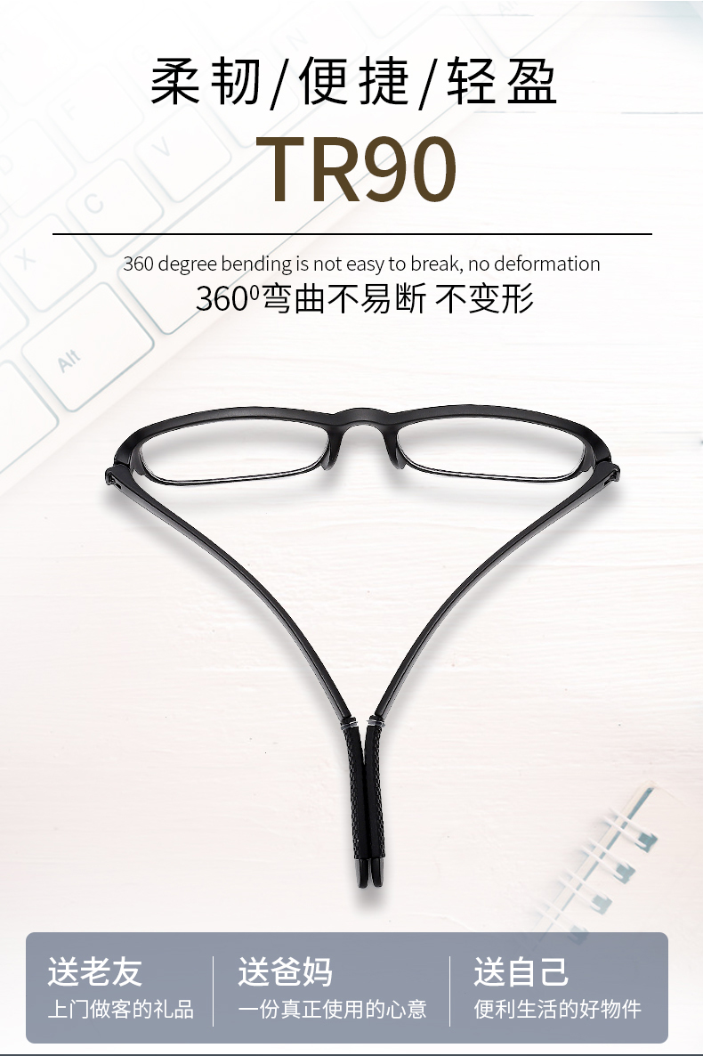 耐磨轻巧,360度不弯曲,佩戴舒适,不夹脸不压鼻,男女通用!防辐射,防蓝光,防紫外线,呵护老人健康,送爸妈送长辈很温馨!