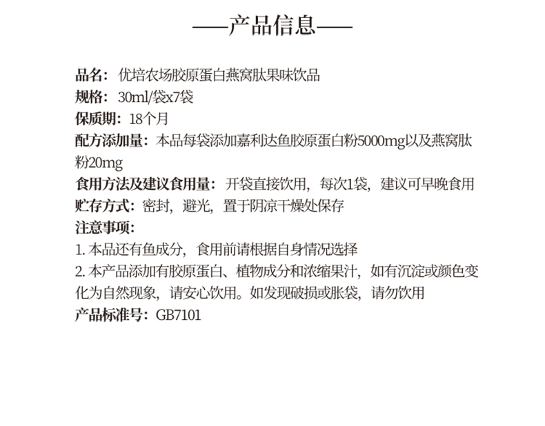 优培农场胶原蛋白,液态饮水解粉果味饮品,燕窝肽口服液正品30ml*7,每袋添加5000mg鱼胶原蛋白肽,东南亚燕窝