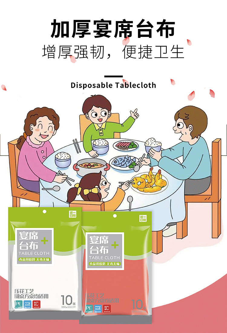 一次性桌布方形圆形,精选PE原料,无异味不含增塑剂,安全更放心。增加厚度撕扯不易破,适用于家庭聚会,饭店排挡,户外野炊,婚庆喜宴各种场合!【赠运费险】