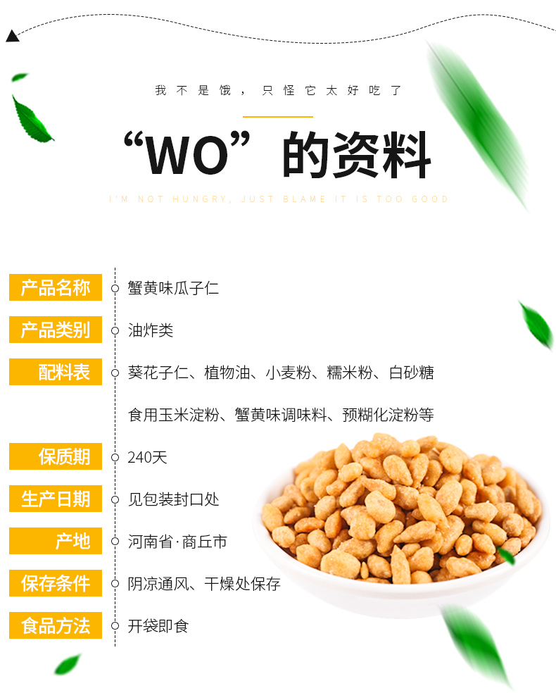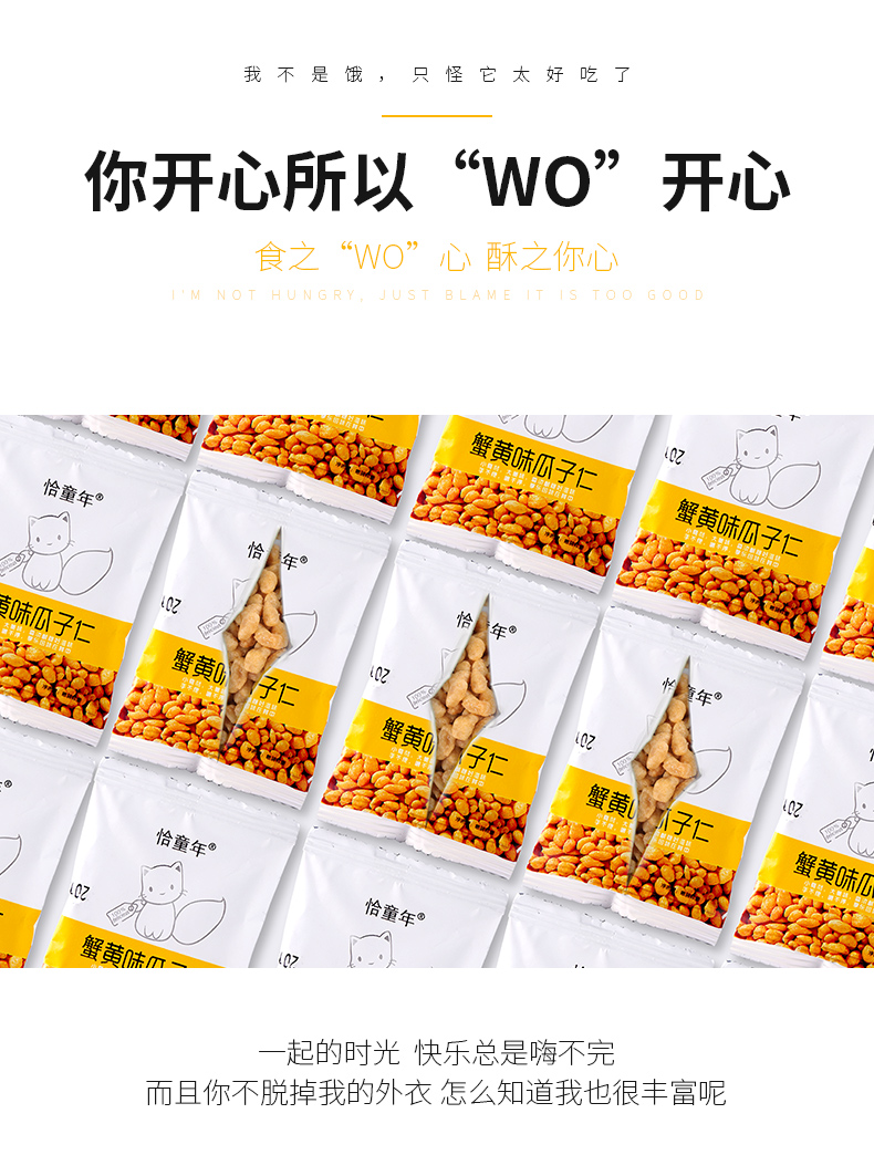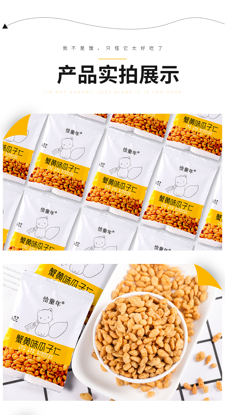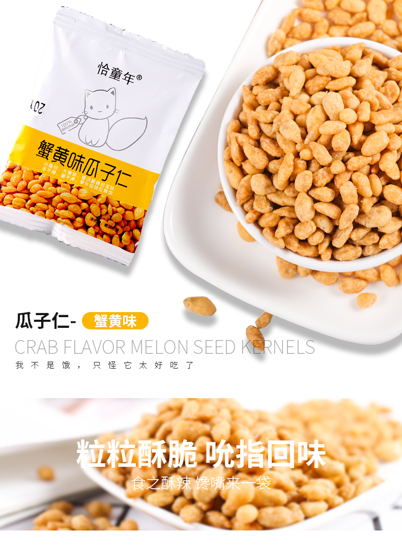 恰童年蟹黄味瓜子仁,优选原材料,入口酥脆香辣,好吃又不腻,看剧来一袋,办公室小零食,独立包装好吃又方便!鲜美好吃停不下来!速抢~