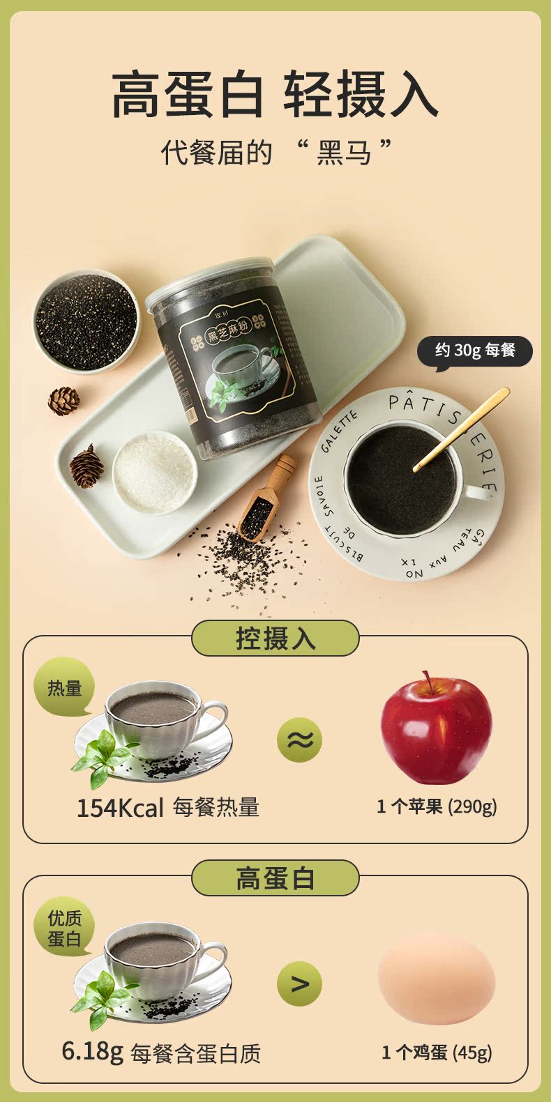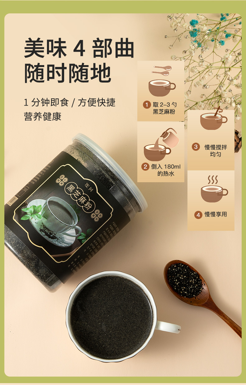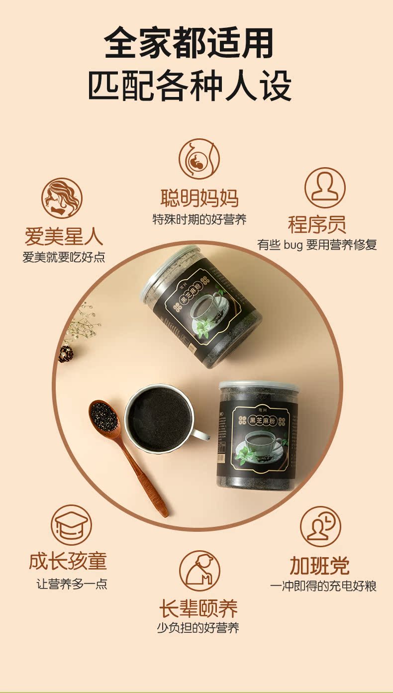 纯正黑芝麻,口感配方双重升级,口感细腻不粘牙,冲泡快捷方便,高于34%的黑芝麻,新疆薄壳核桃配方,品质有保证,亮黑你的发色。