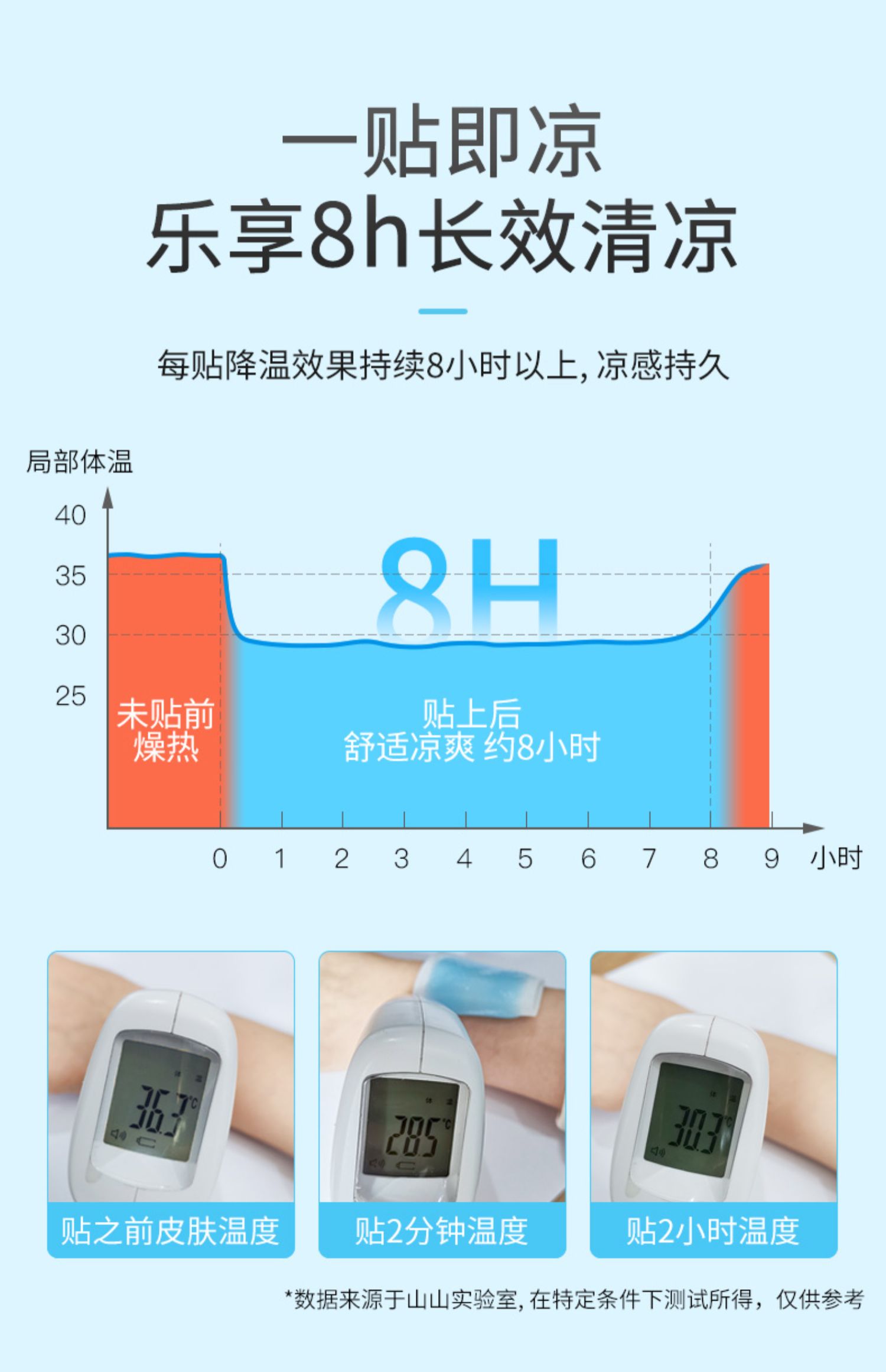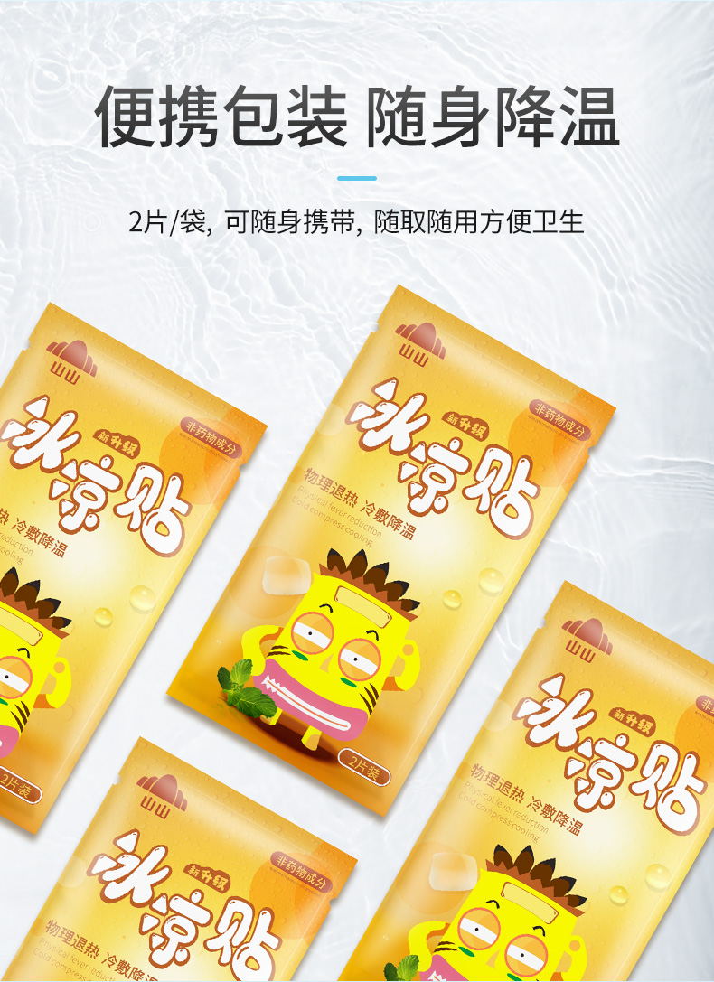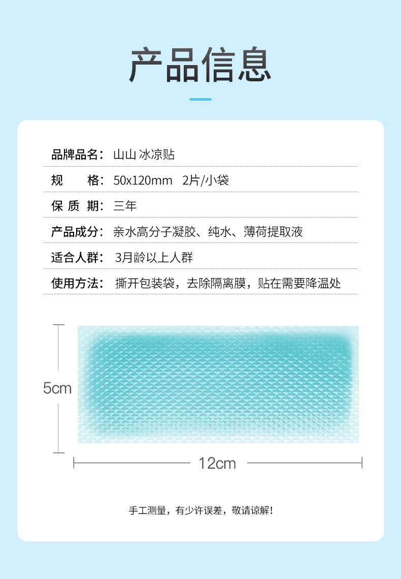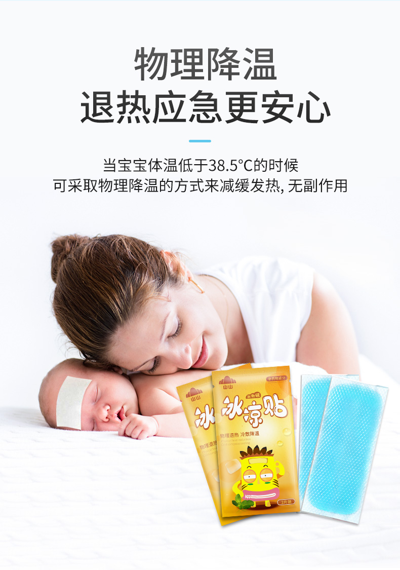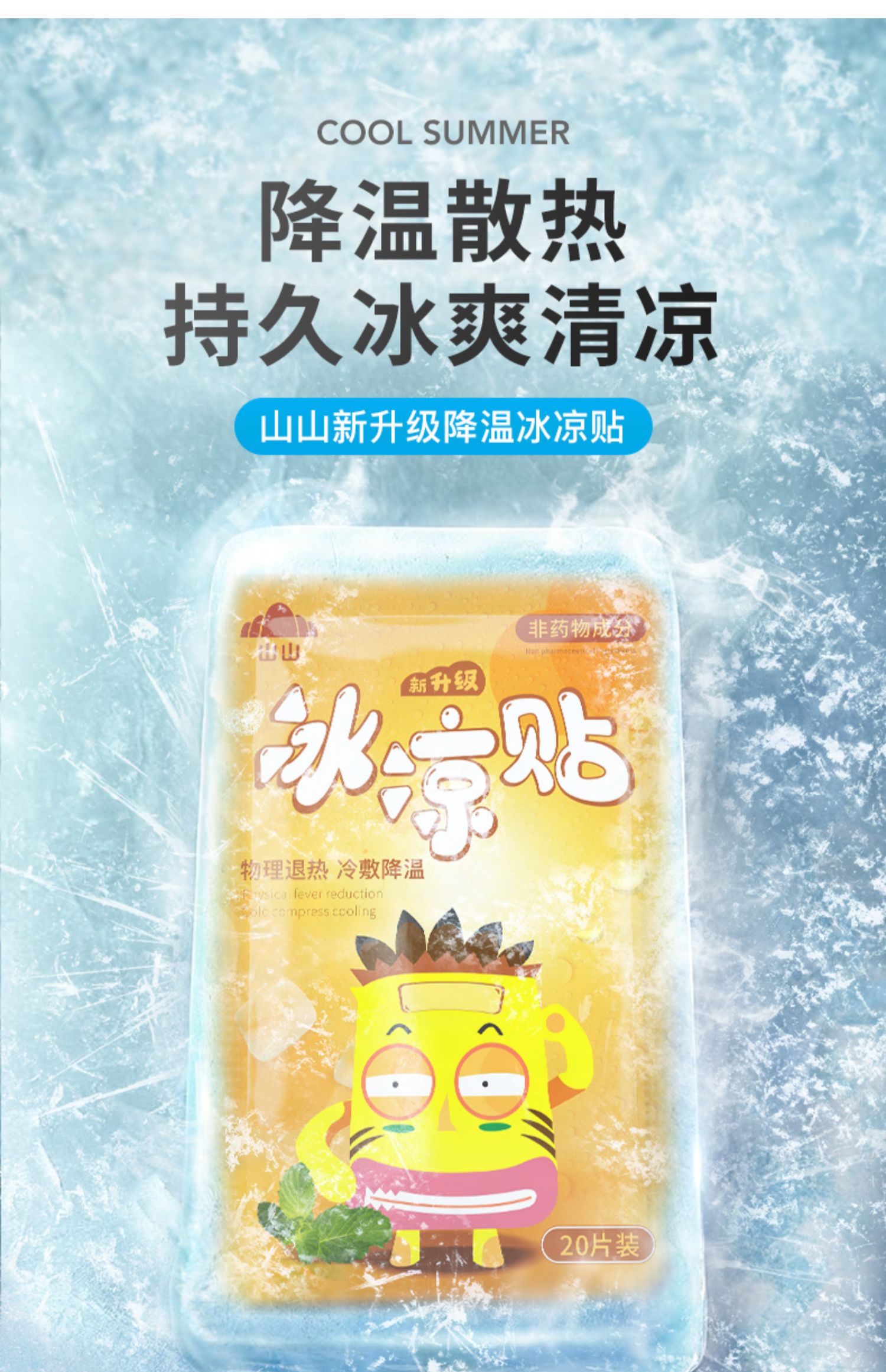 山山降温冰凉贴!采用清凉凝胶+薄荷精华,防暑、退热、降温,温和不刺激!清神醒脑,缓解疲劳,提高注意力;一贴即凉,乐享8H长效清凉~让你安稳的度过冰凉的夏天!