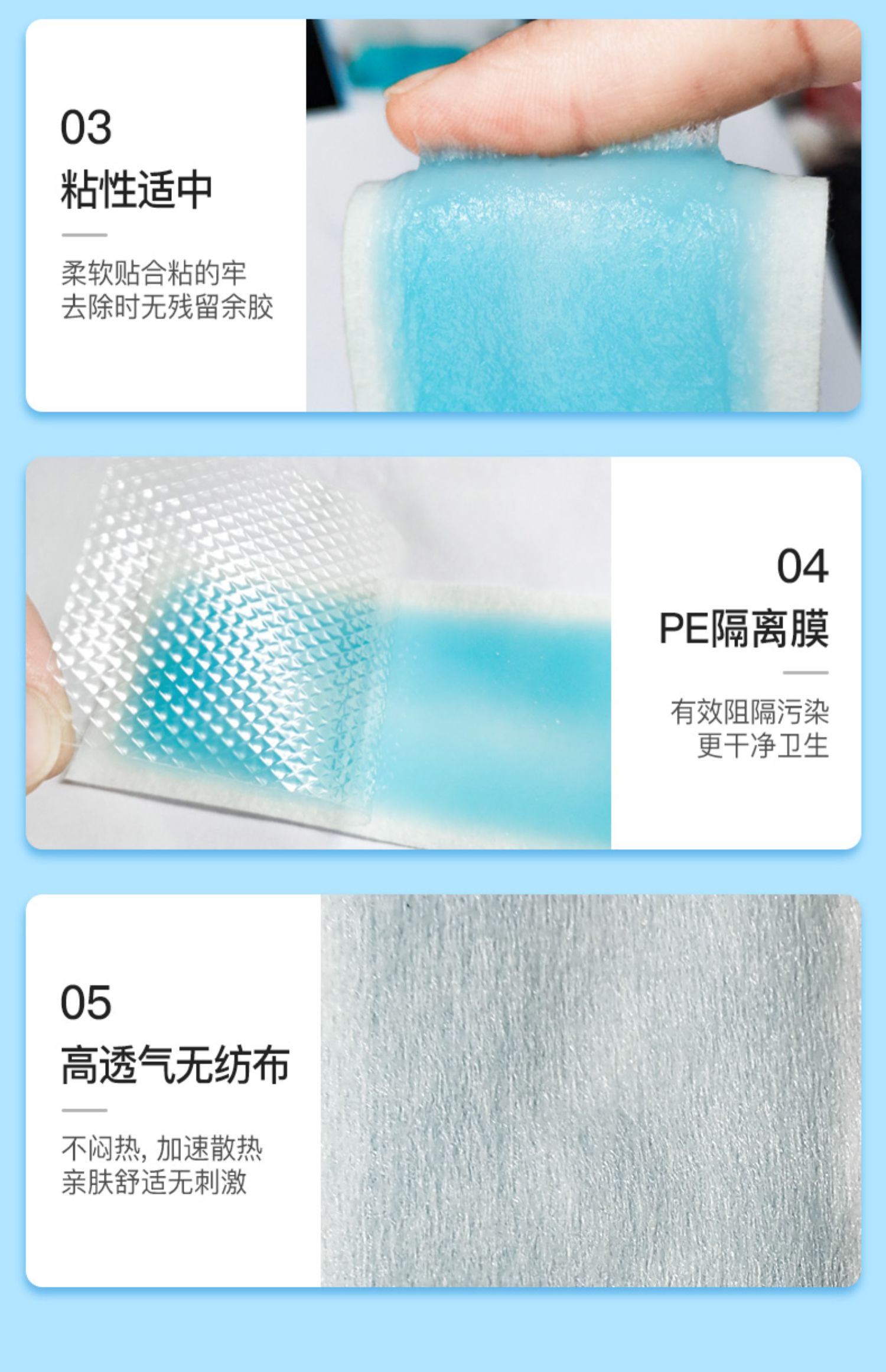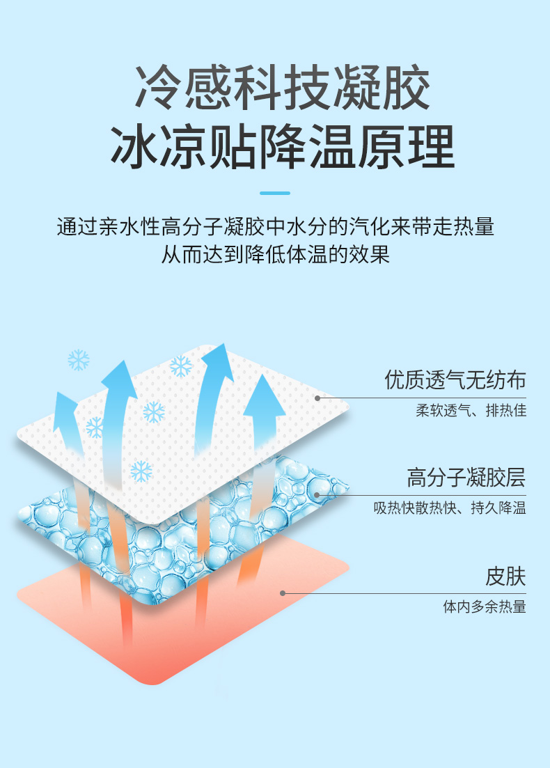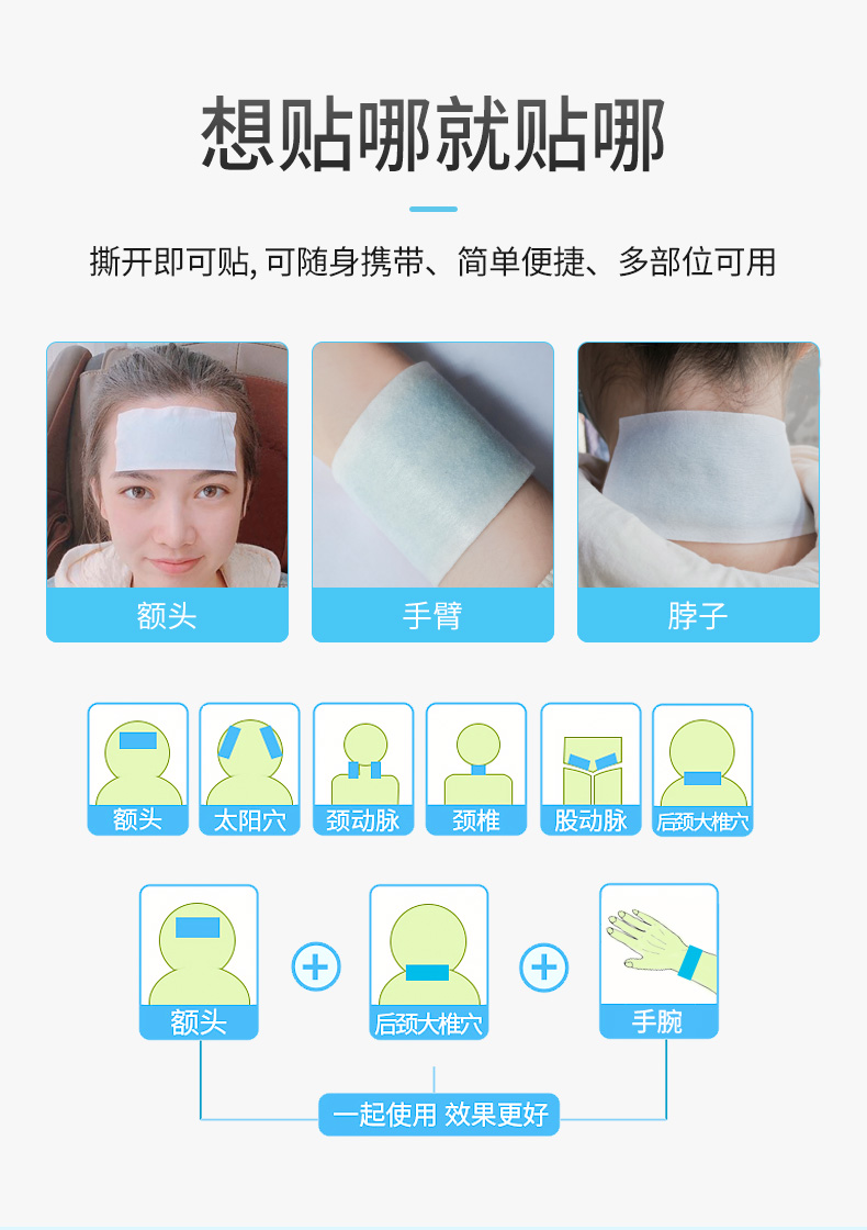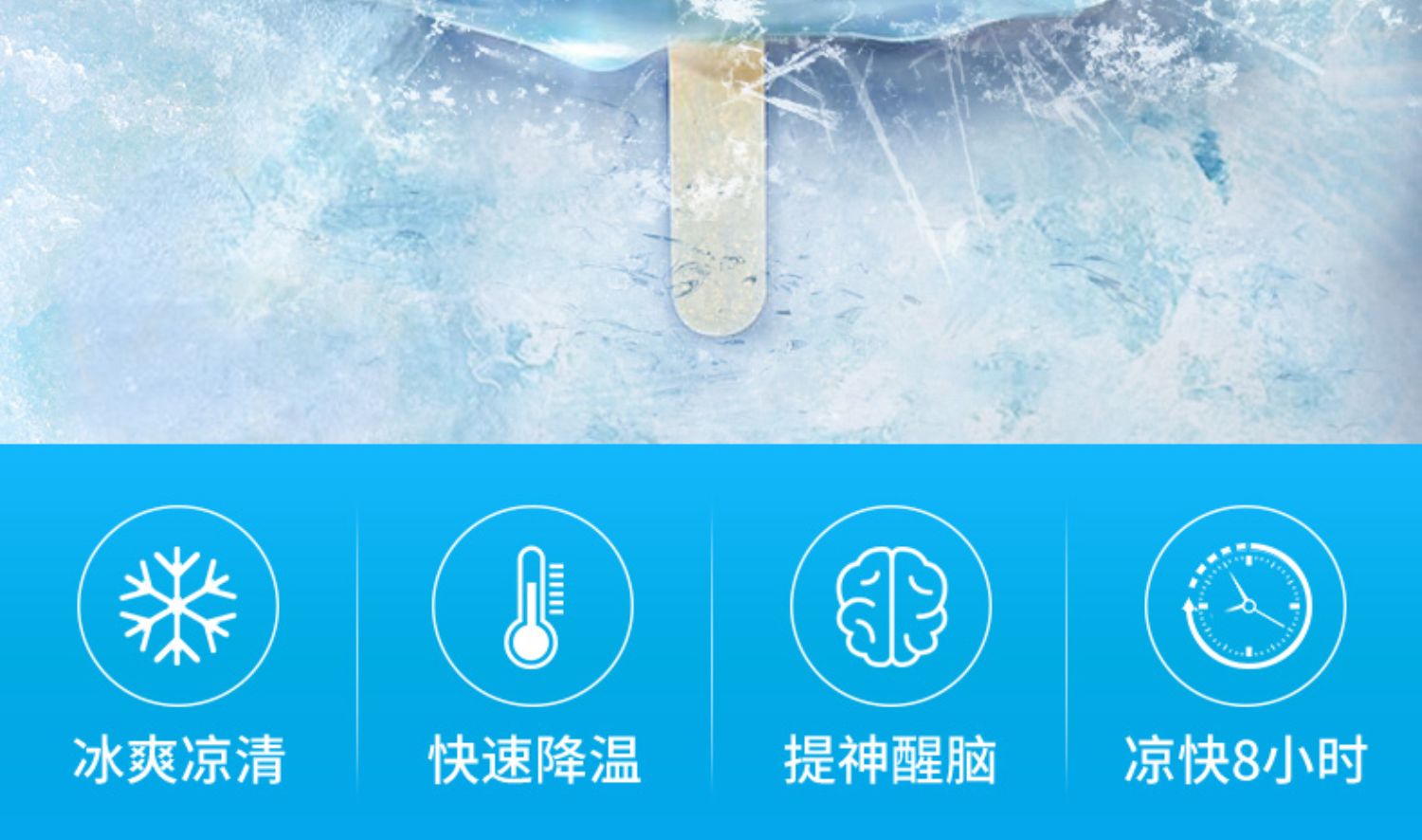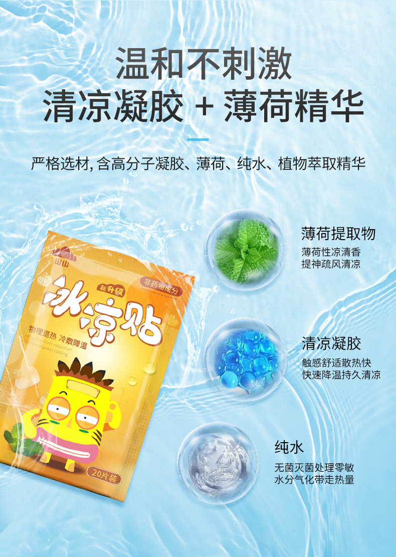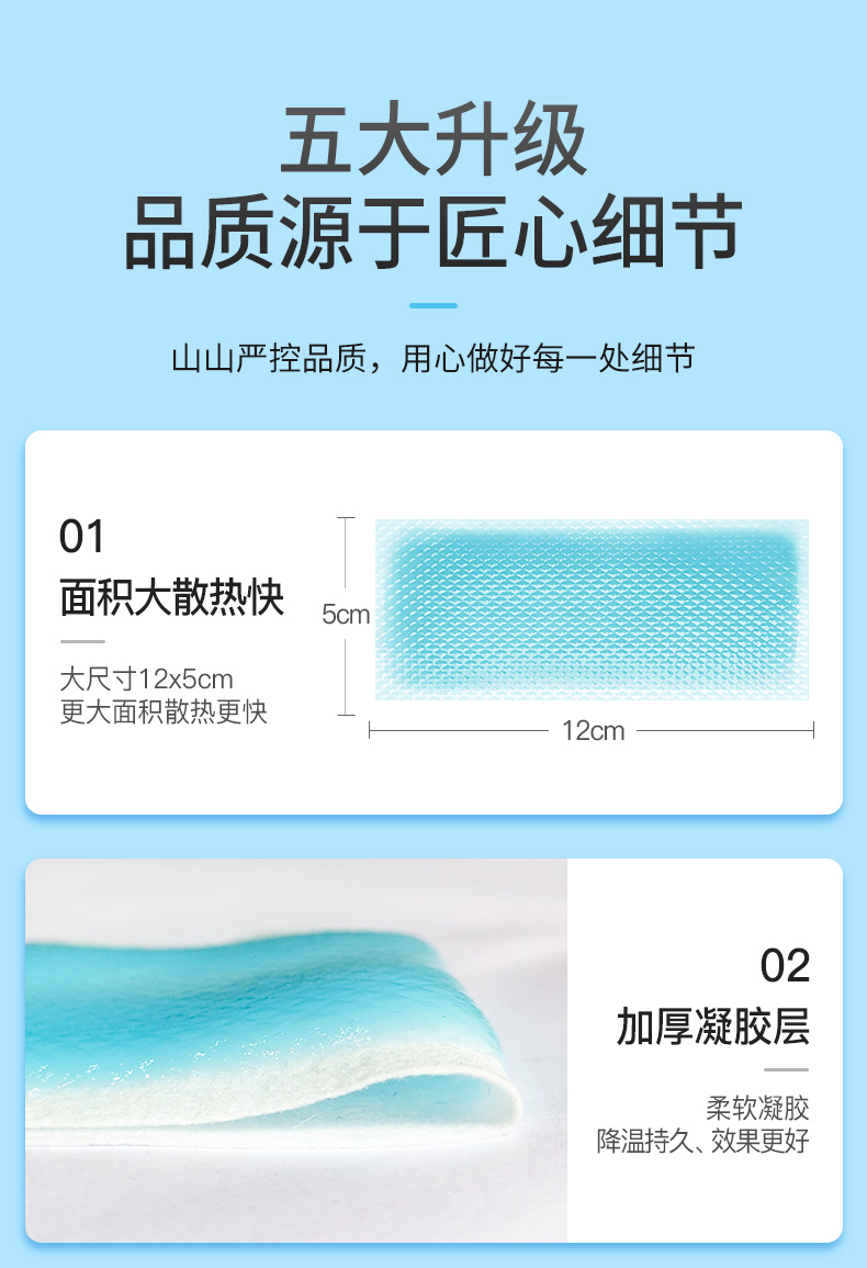 山山降温冰凉贴!采用清凉凝胶+薄荷精华,防暑、退热、降温,温和不刺激!清神醒脑,缓解疲劳,提高注意力;一贴即凉,乐享8H长效清凉~让你安稳的度过冰凉的夏天!