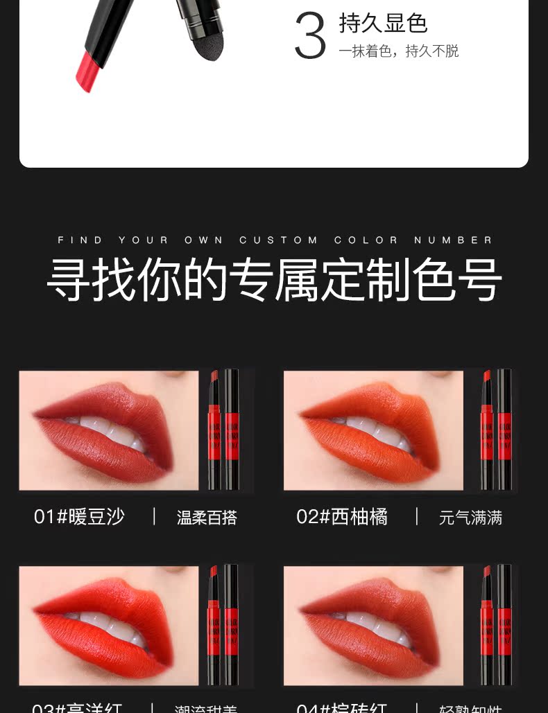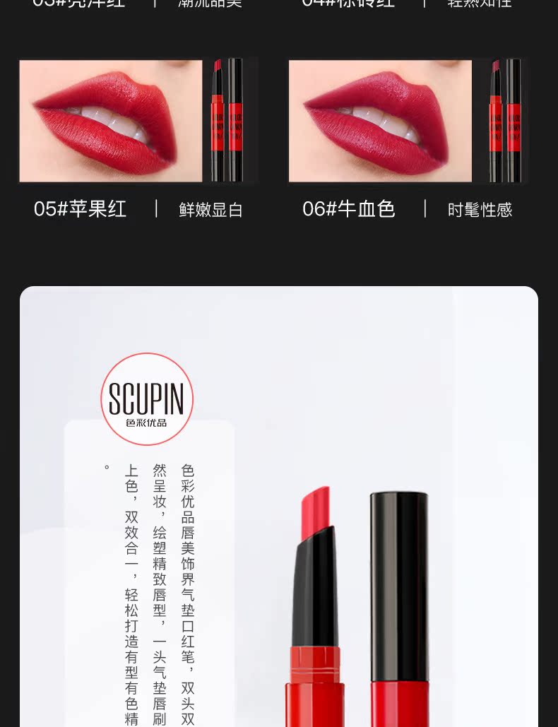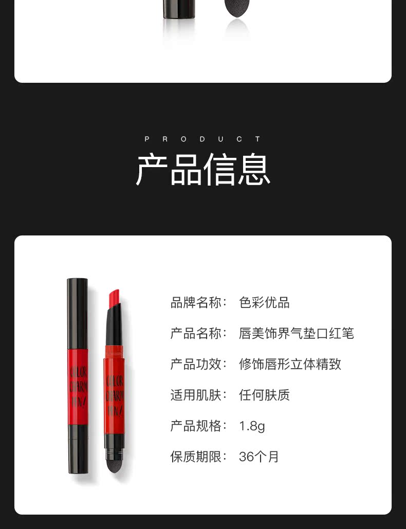 新款气垫口红笔,有型有色,双效合一,一头是口红,一头是气垫唇刷!滋润顺滑,持久显色,轻松打造精致唇妆!