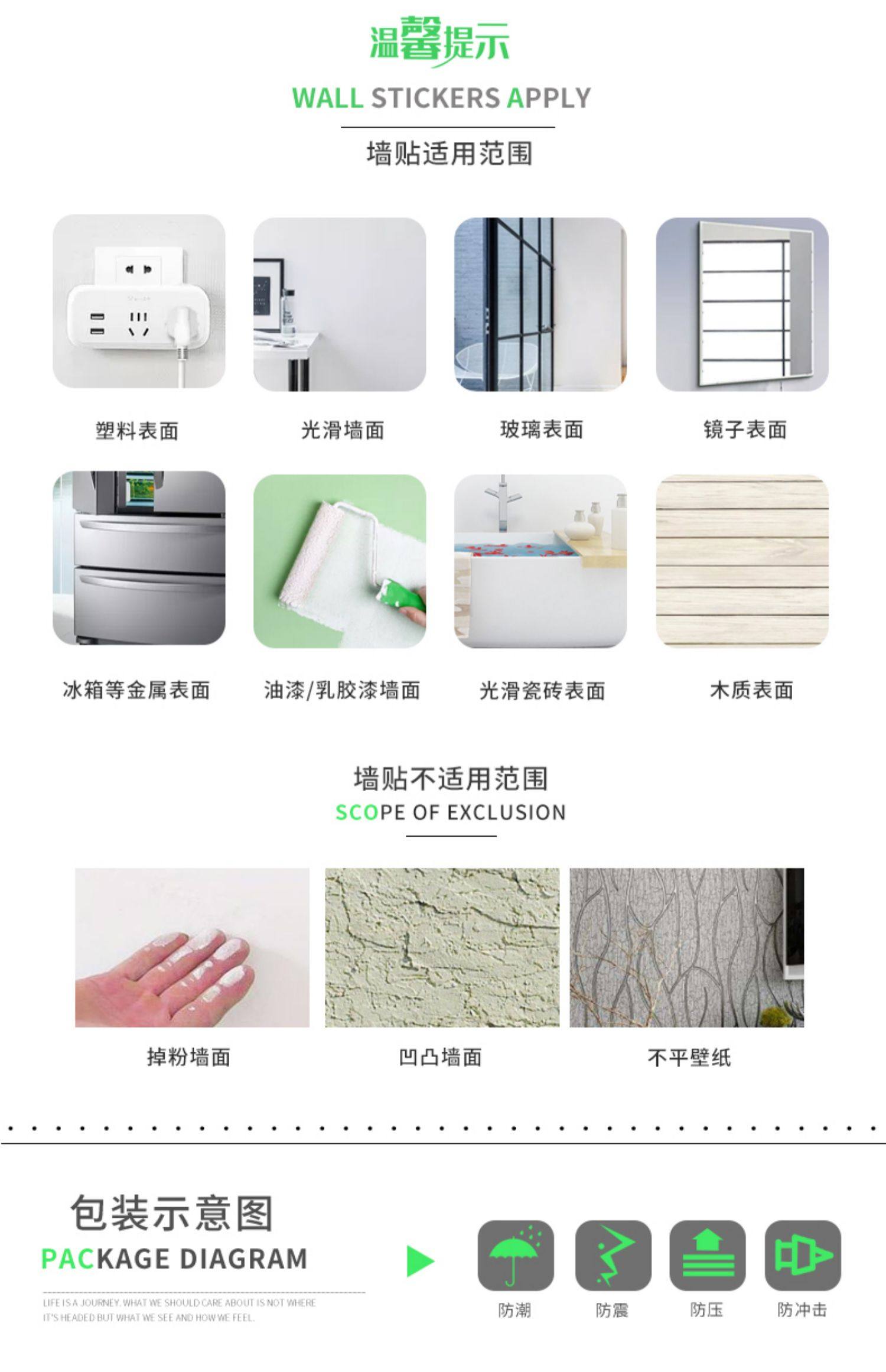 简约墙饰贴画,PVC材质,自带背胶,防水易粘贴,适用大部分墙面,无毒无味,清理简单不留痕迹,图画字体色泽饱满,多款可选,随意组合使用。