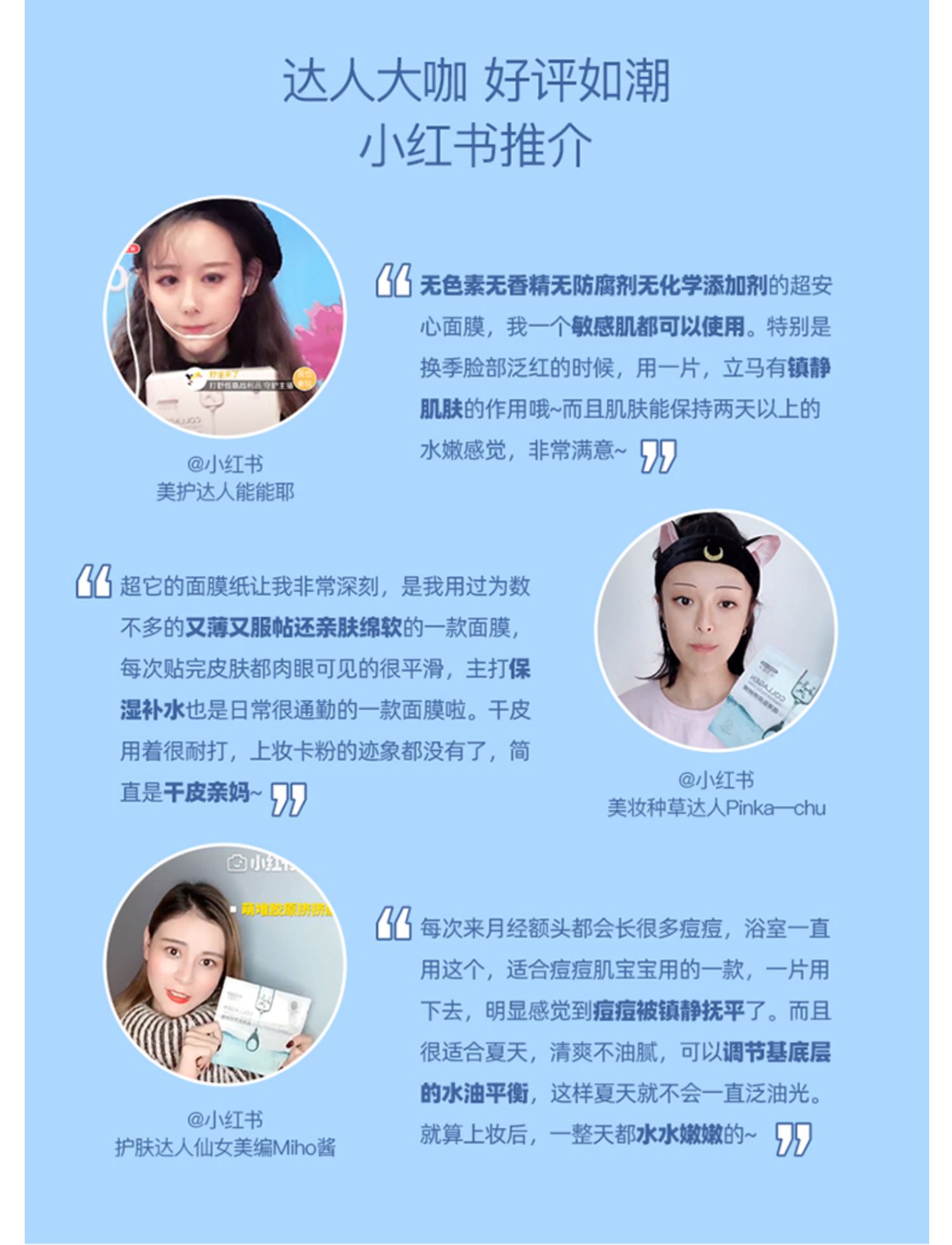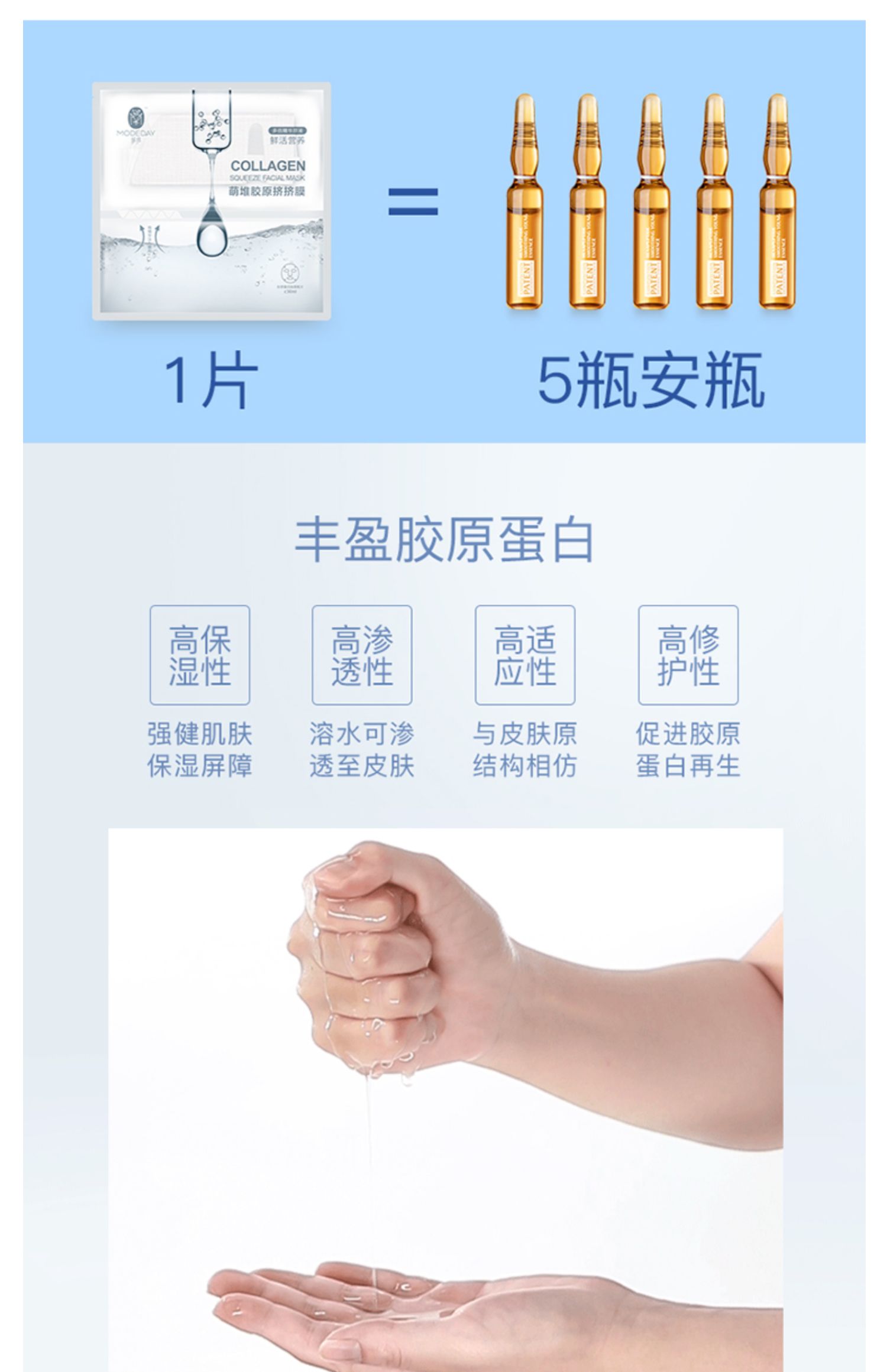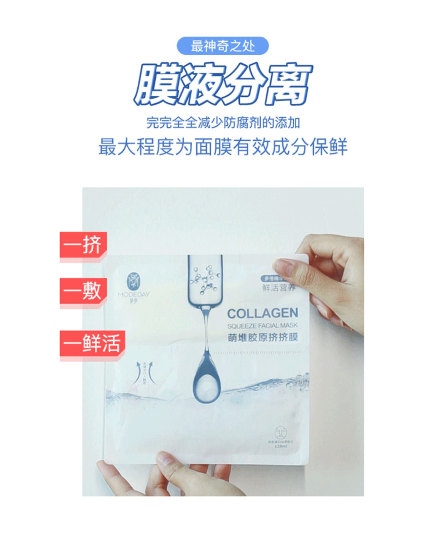 丰盈的胶原蛋白。高保湿性,促进胶原蛋白再生。膜布区与精华区独立密封,保持成分活度,给你美丽肌肤!