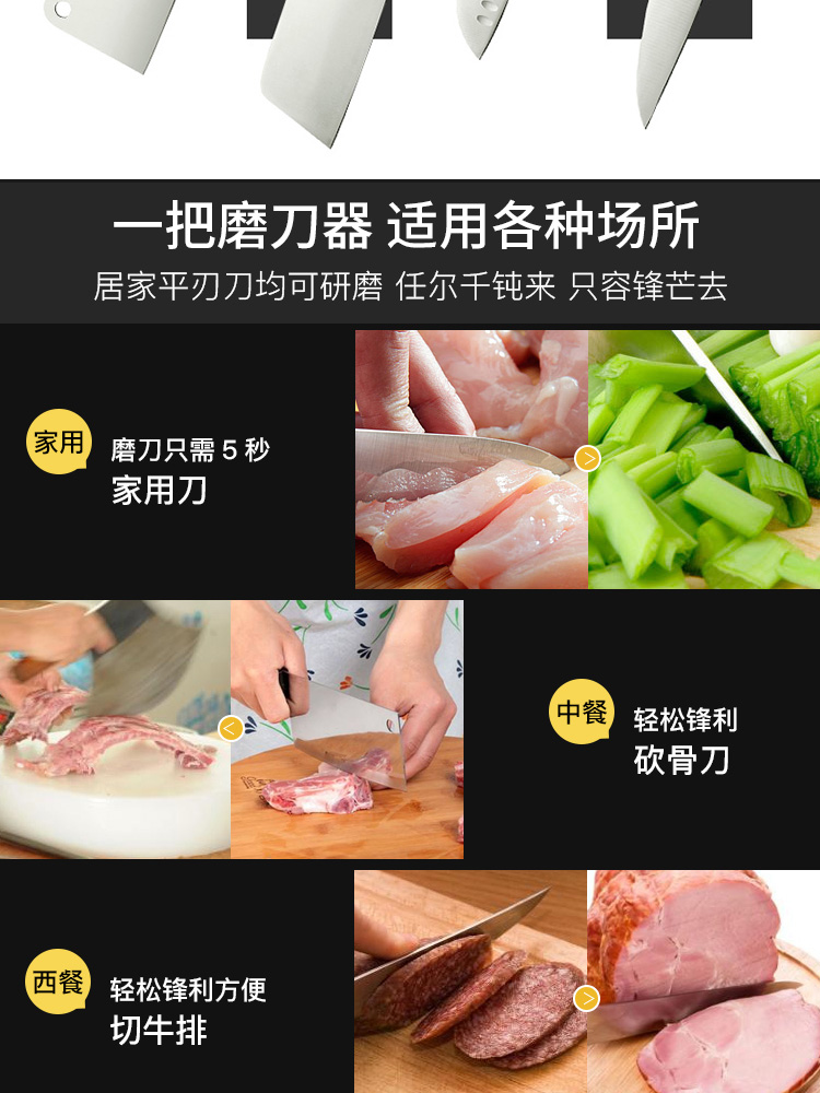 适用家中大小刀具,快速磨刀,操作安全简单方便,经久耐用。以前的刀切番茄都难,现在很锋利,切肉像切豆腐一样,买一次用好几年,太划算了!