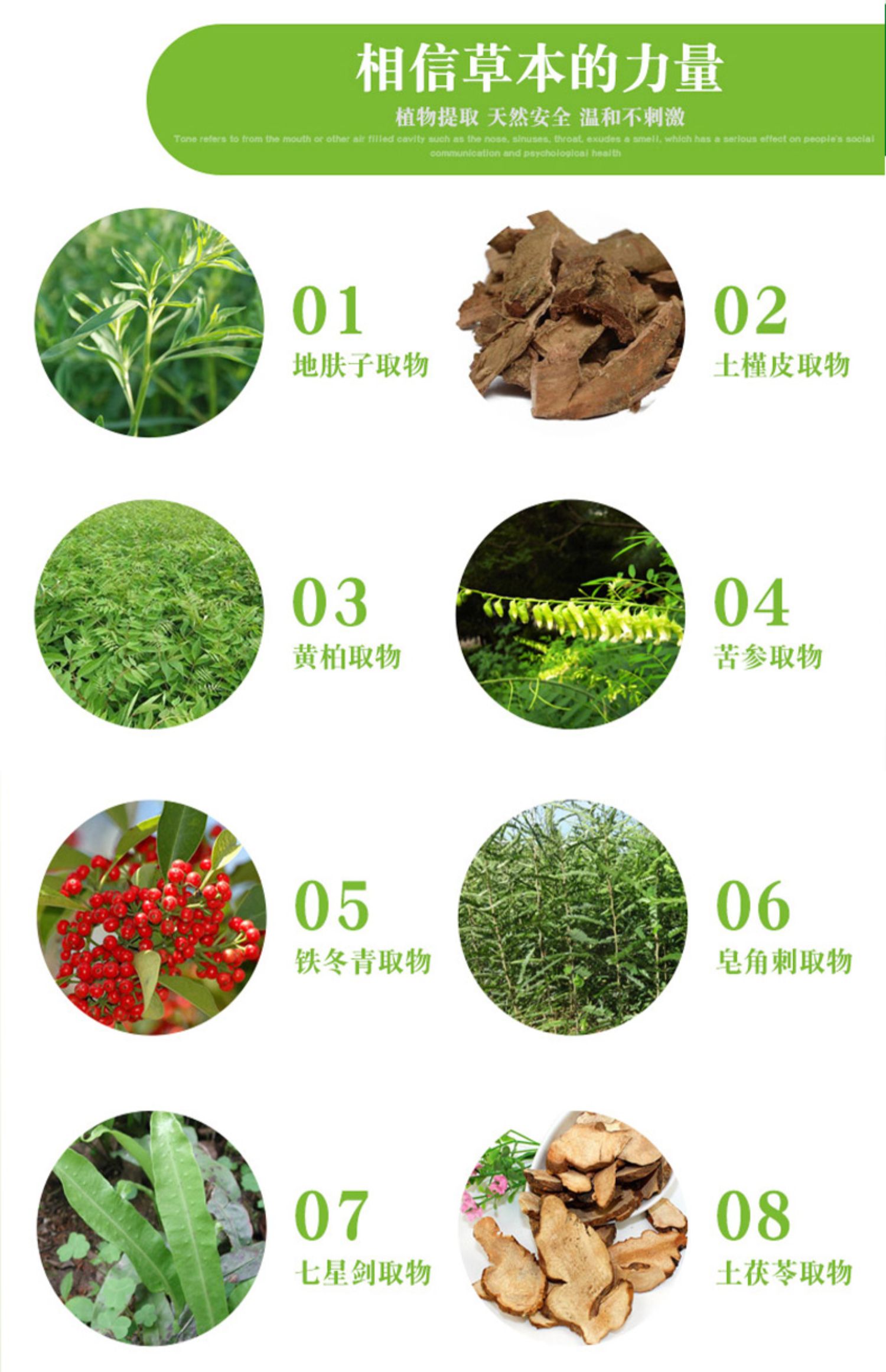 天然植物草本萃取,清凉抑菌,温和不刺激,抑菌止痒,快速起效,拒绝反复!