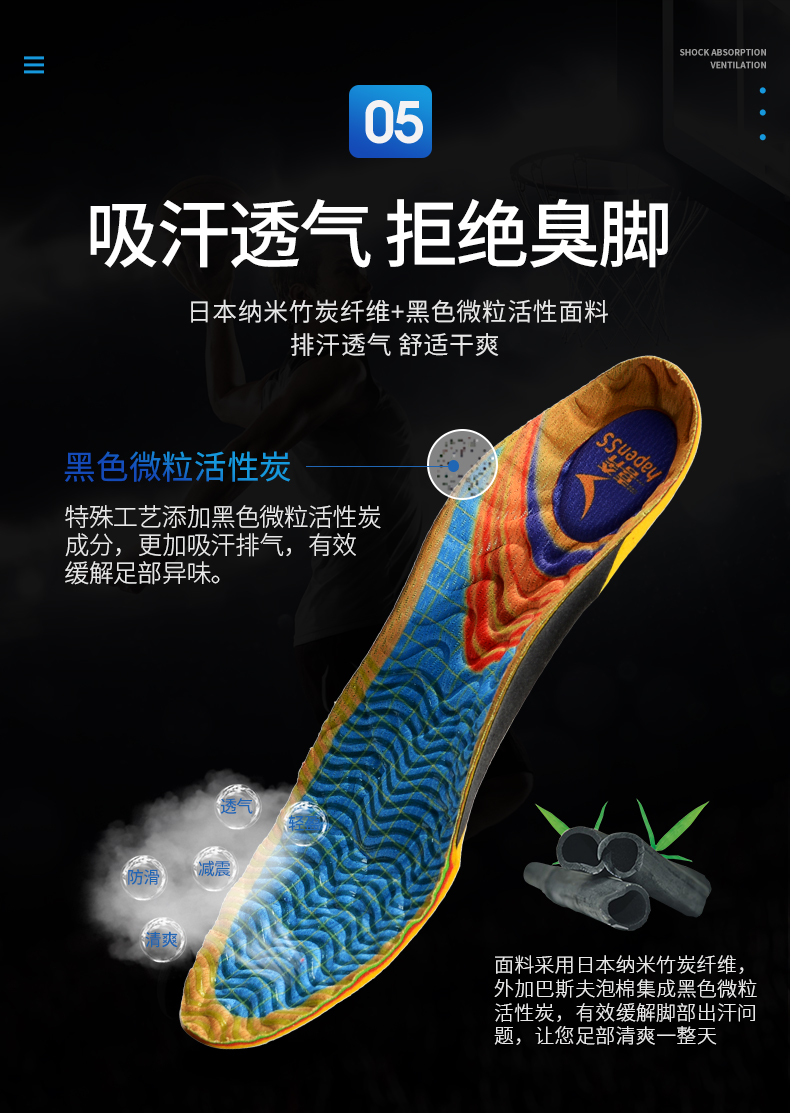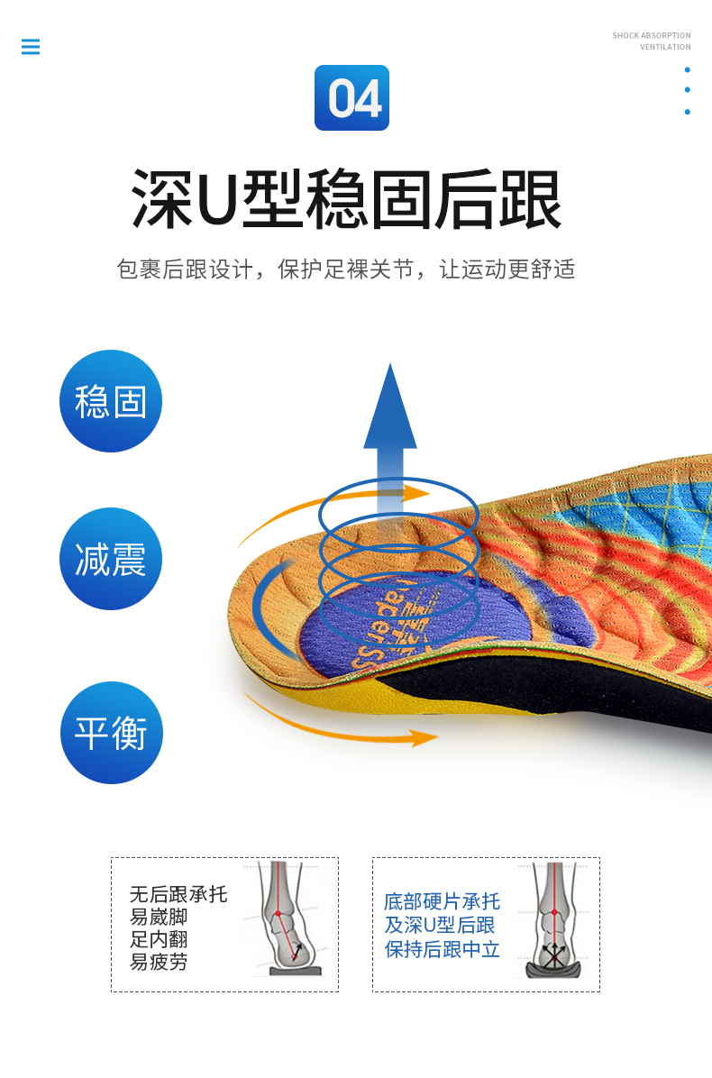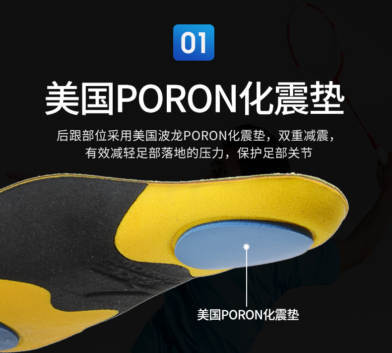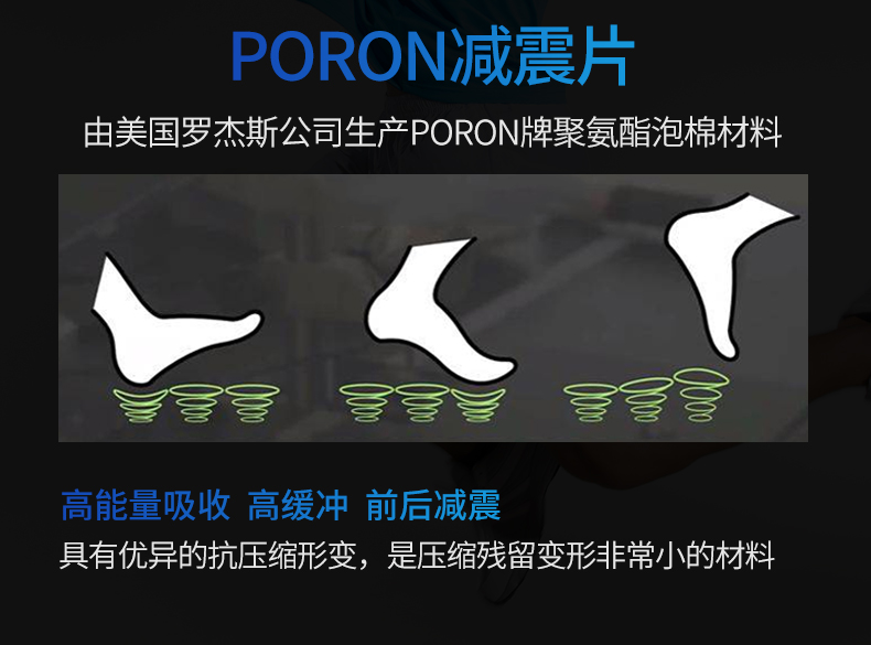 后跟部位采用美国波龙PORON化震垫,双重减震有效减轻足部落地的压力,保护足部关节,高能量吸收,高缓冲,前后减震,具有优异的抗压缩形変,是压缩残留变形非常小的材料。