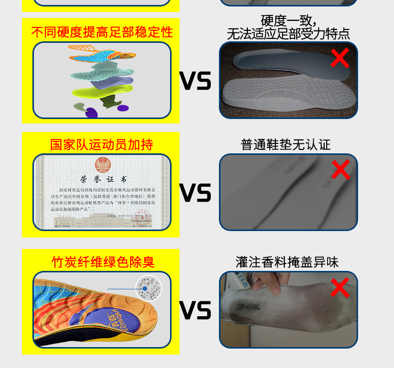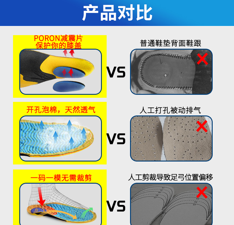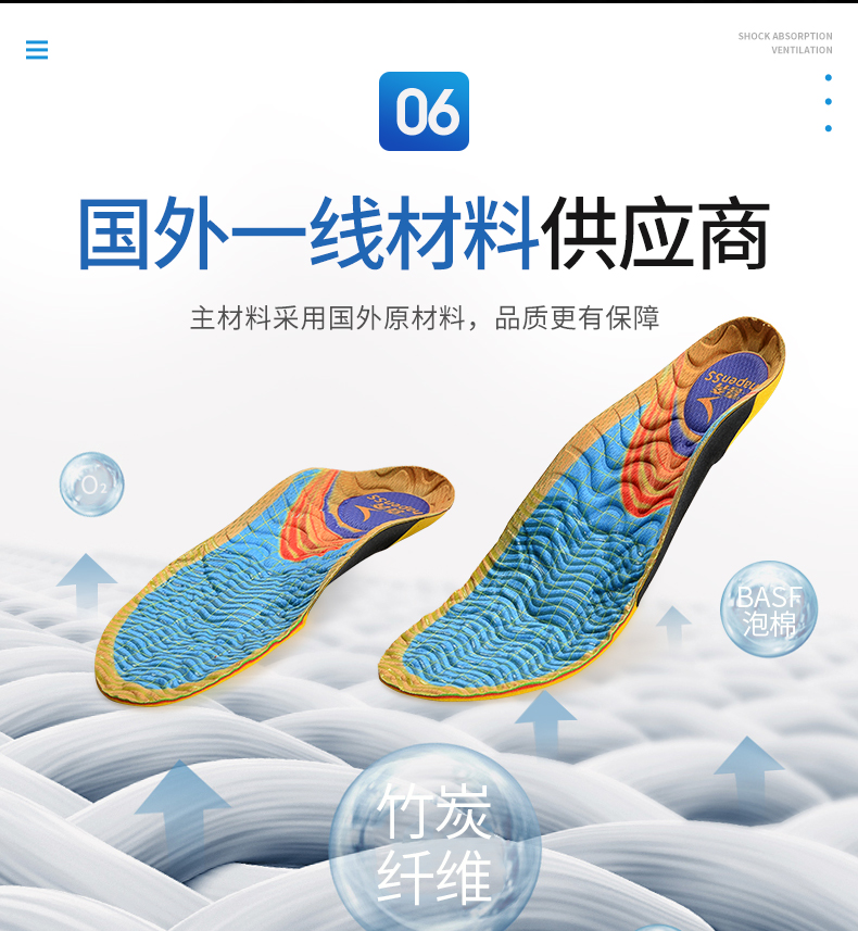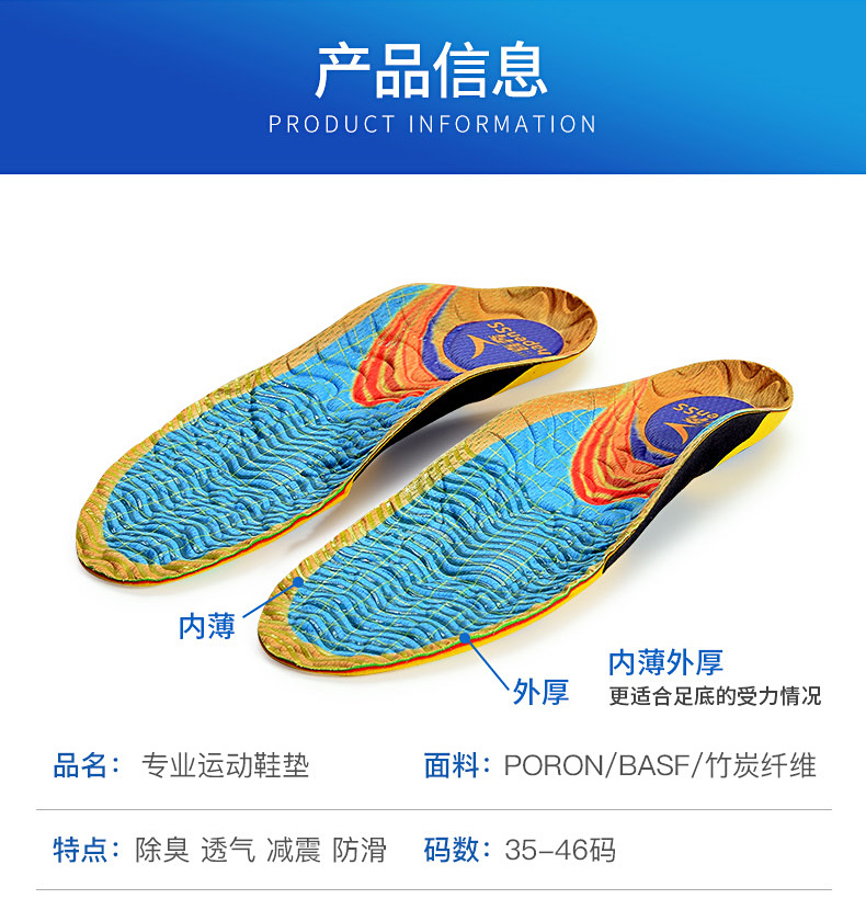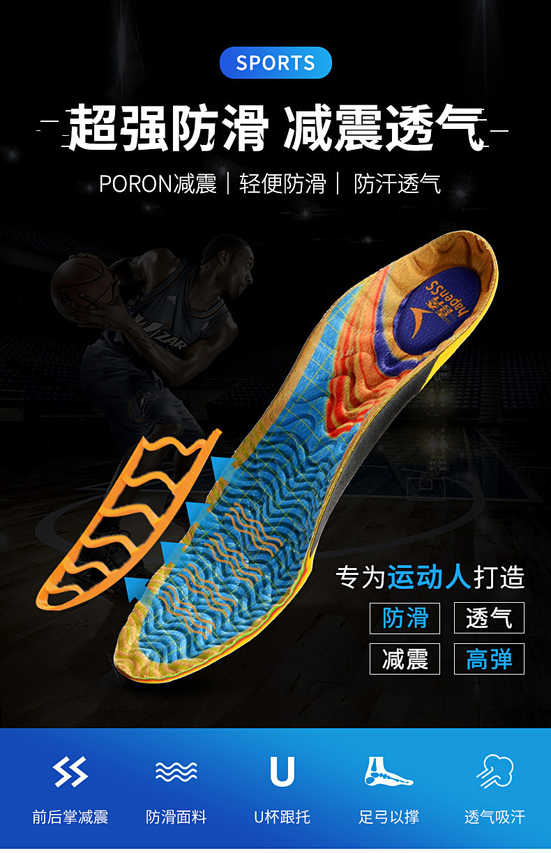 后跟部位采用美国波龙PORON化震垫,双重减震有效减轻足部落地的压力,保护足部关节,高能量吸收,高缓冲,前后减震,具有优异的抗压缩形変,是压缩残留变形非常小的材料。
