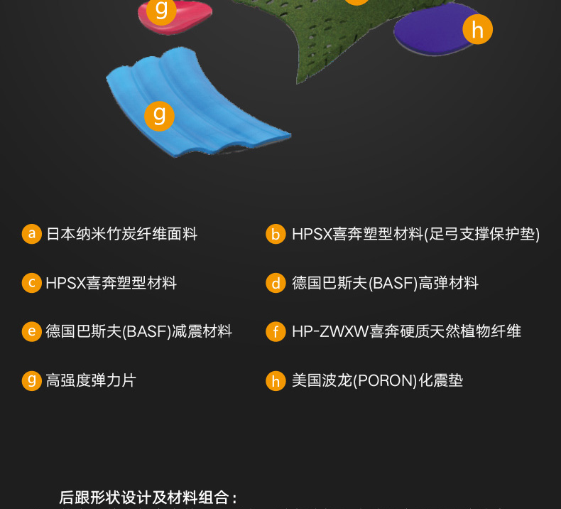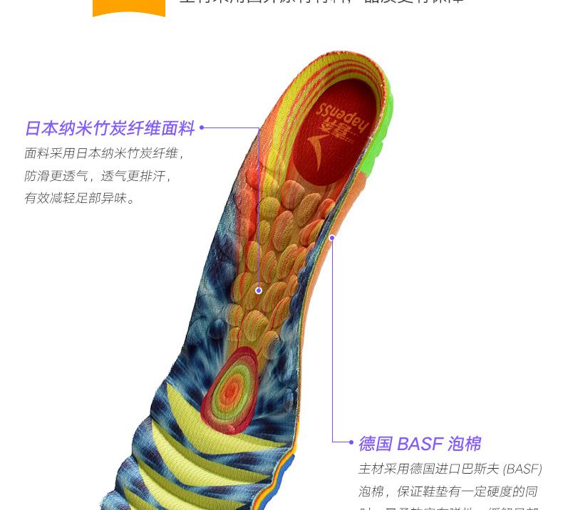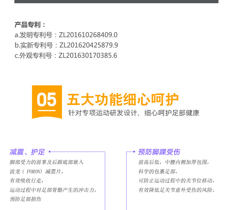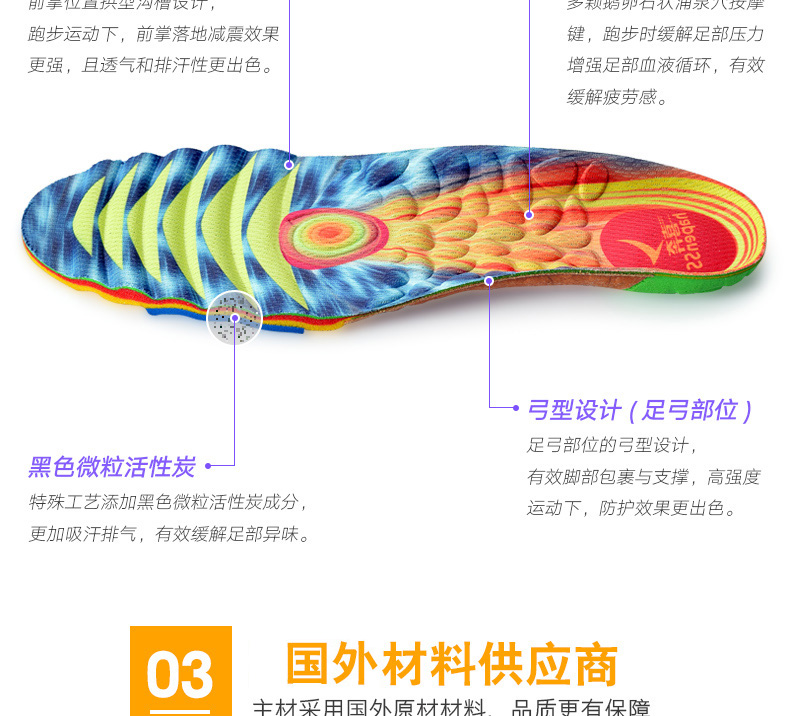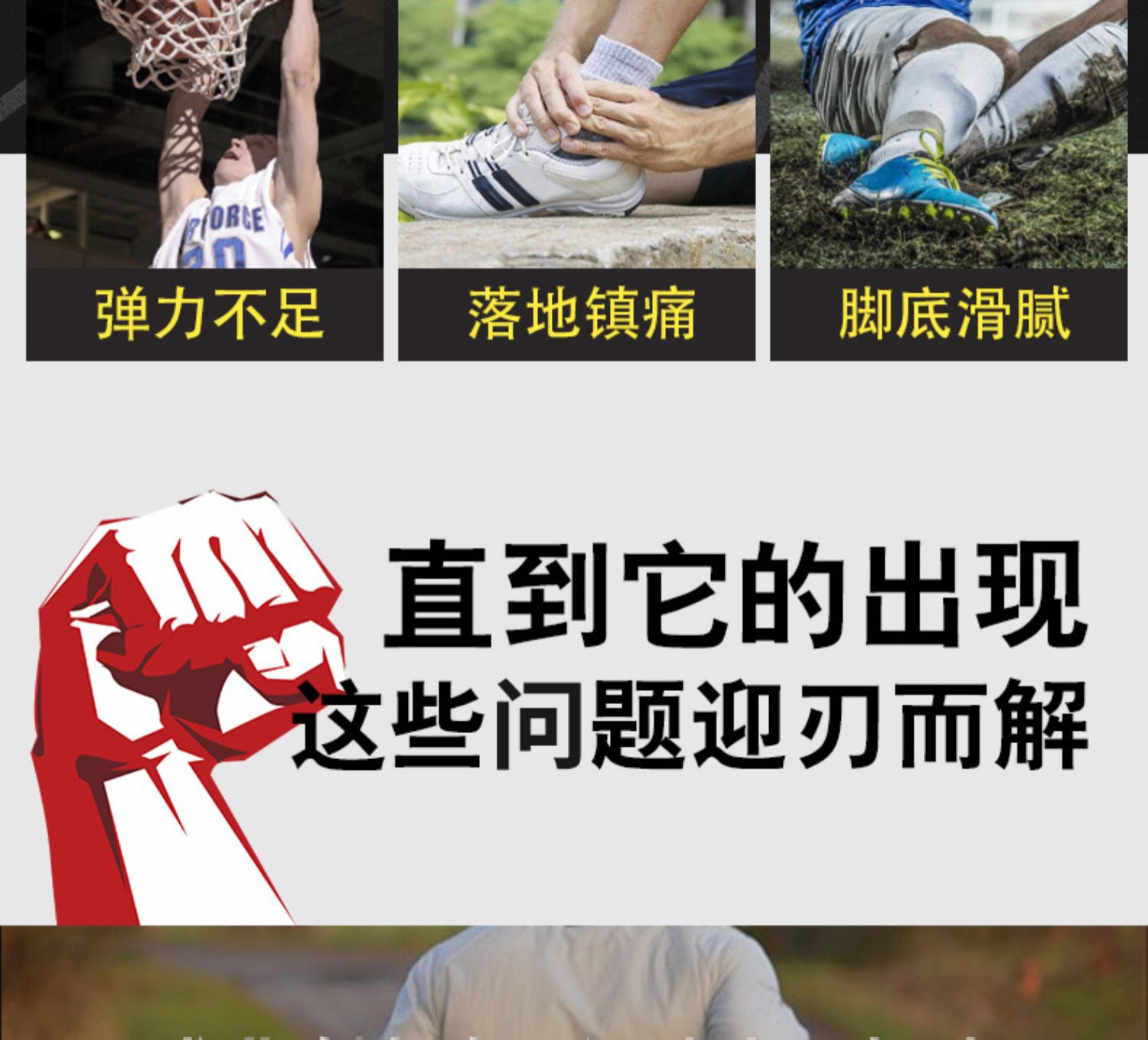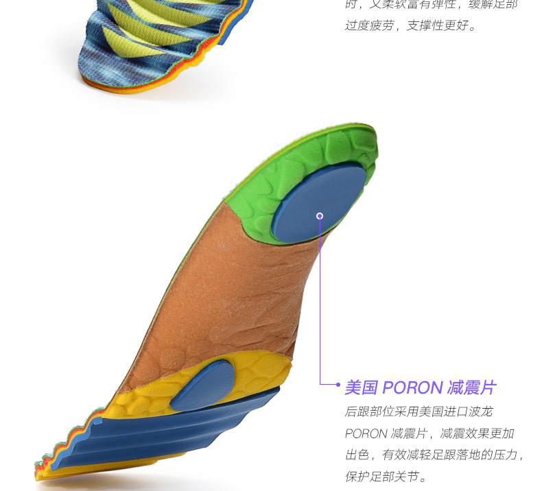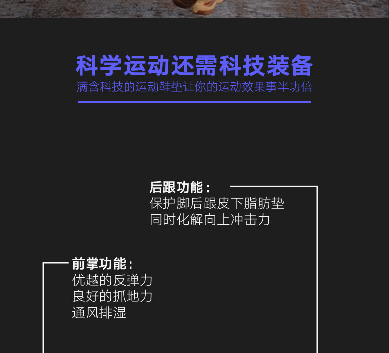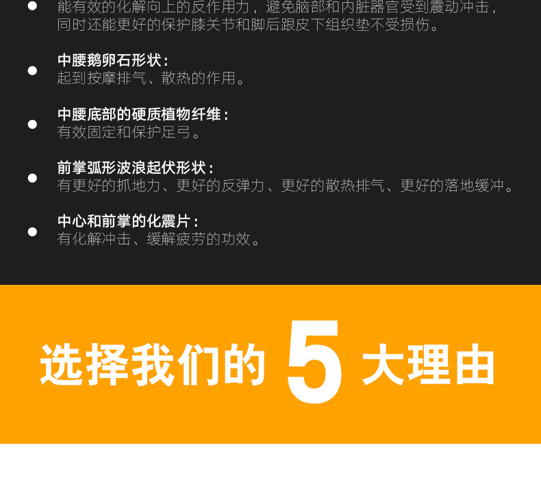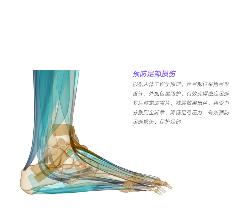保护脚后跟皮下脂肪垫,同时化解向上沖击力,优越的反弹力,良好的抓地力,通风排湿,保护足弓、通风散热。