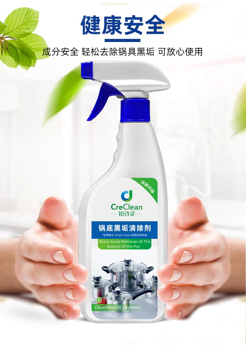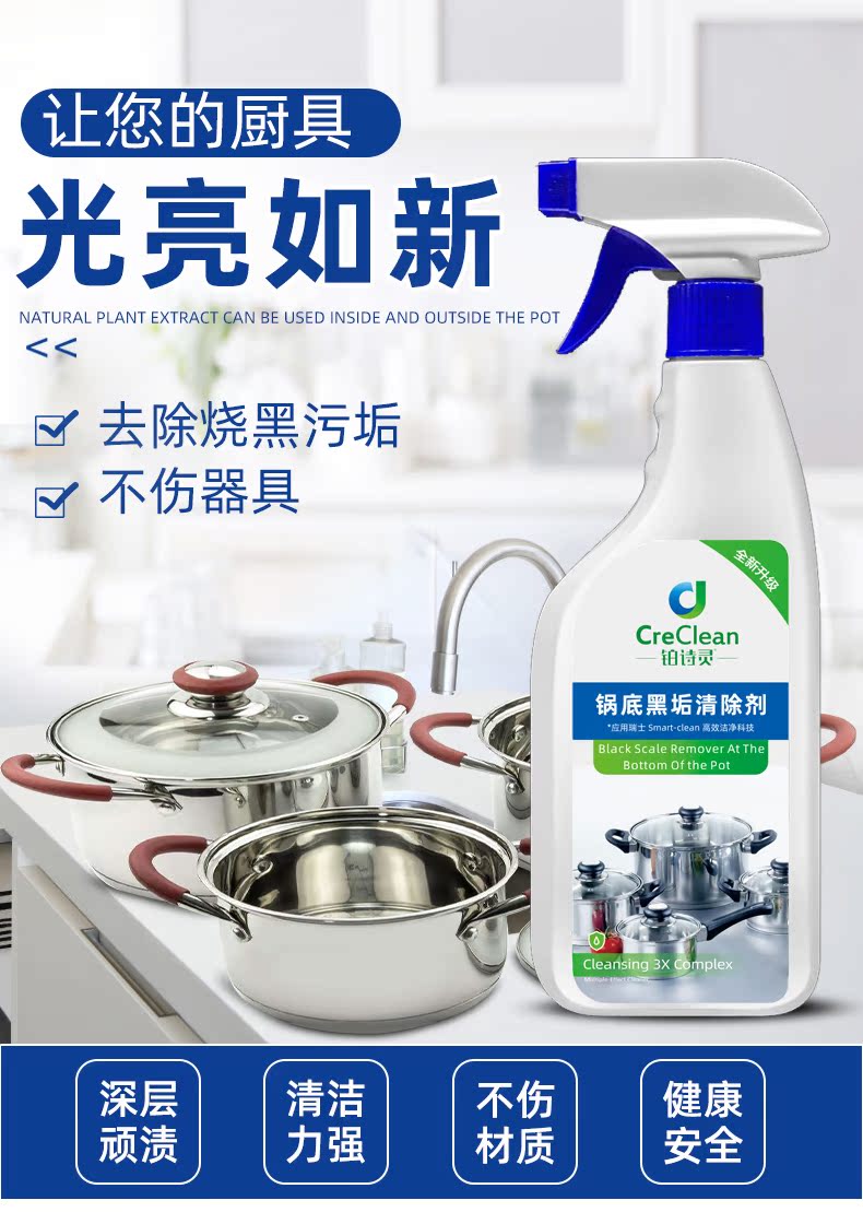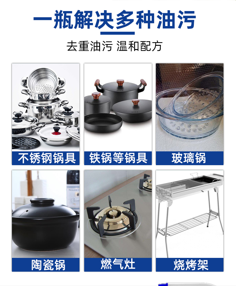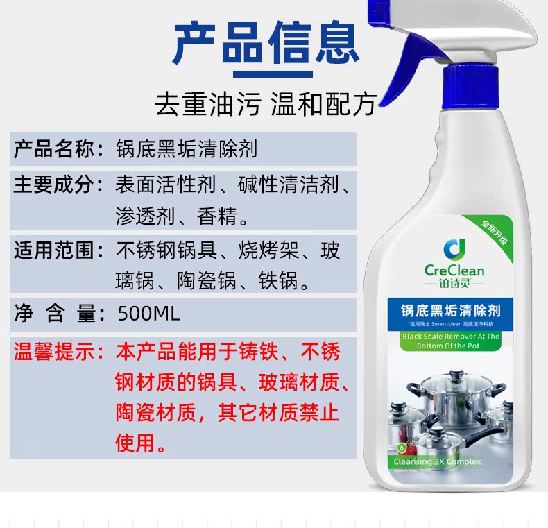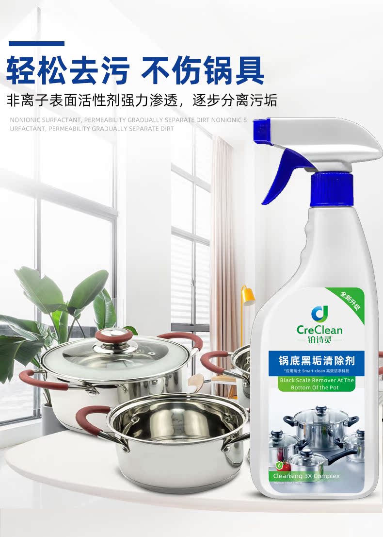 一瓶解决多种油污!深层顽渍清洁力强,不伤材质健康安全。针对烧焦黒渍清洗,焕然一新表面比光泽。非离子表面活性剂强力渗透,逐步分离污垢。成分安全轻松去除锅具黑垢。