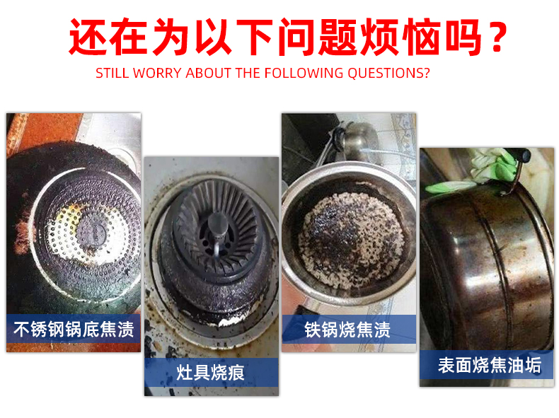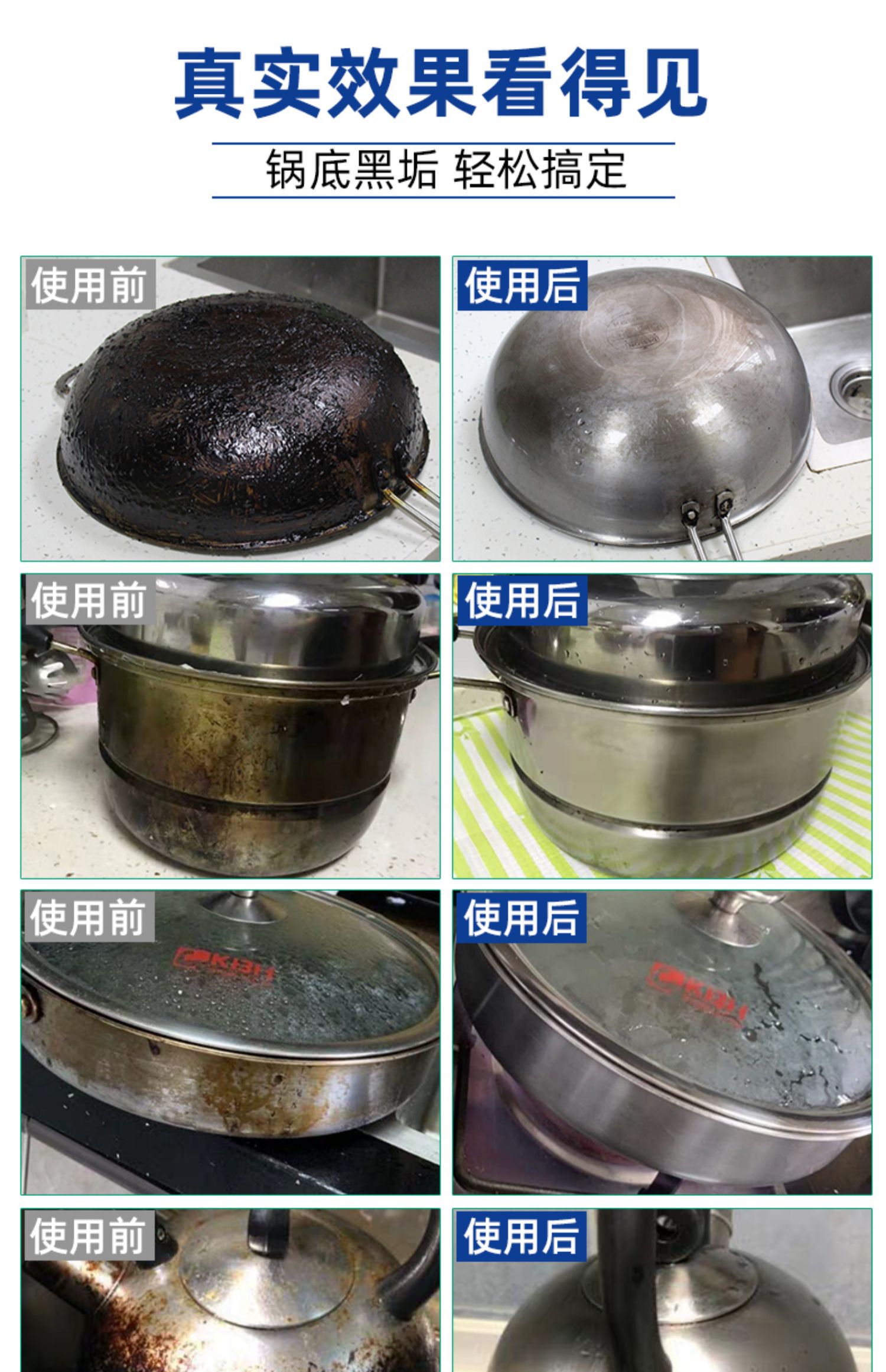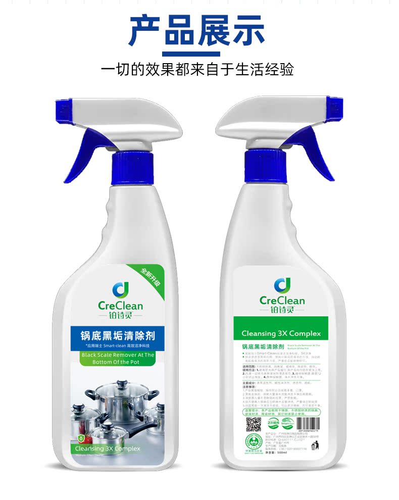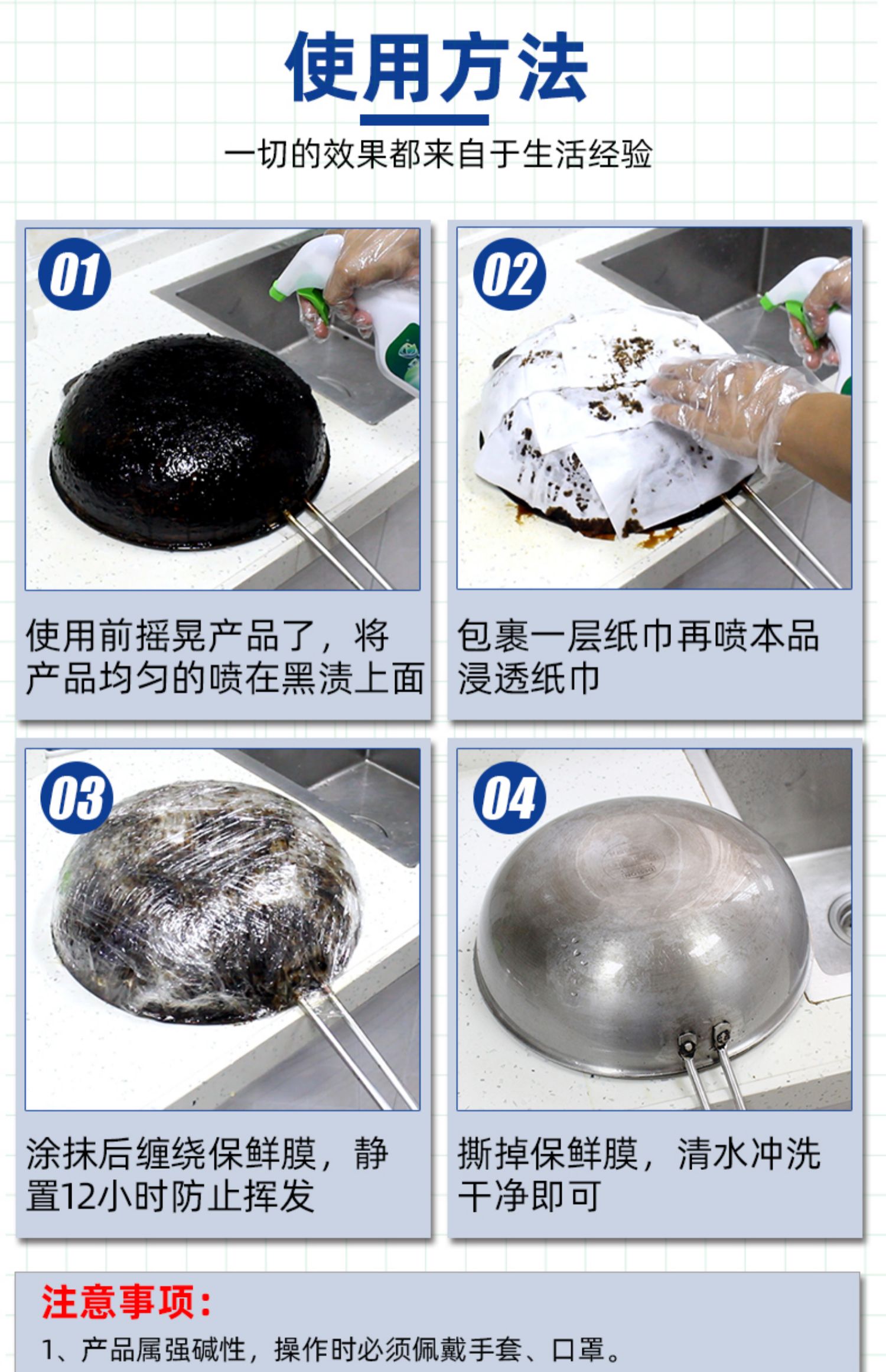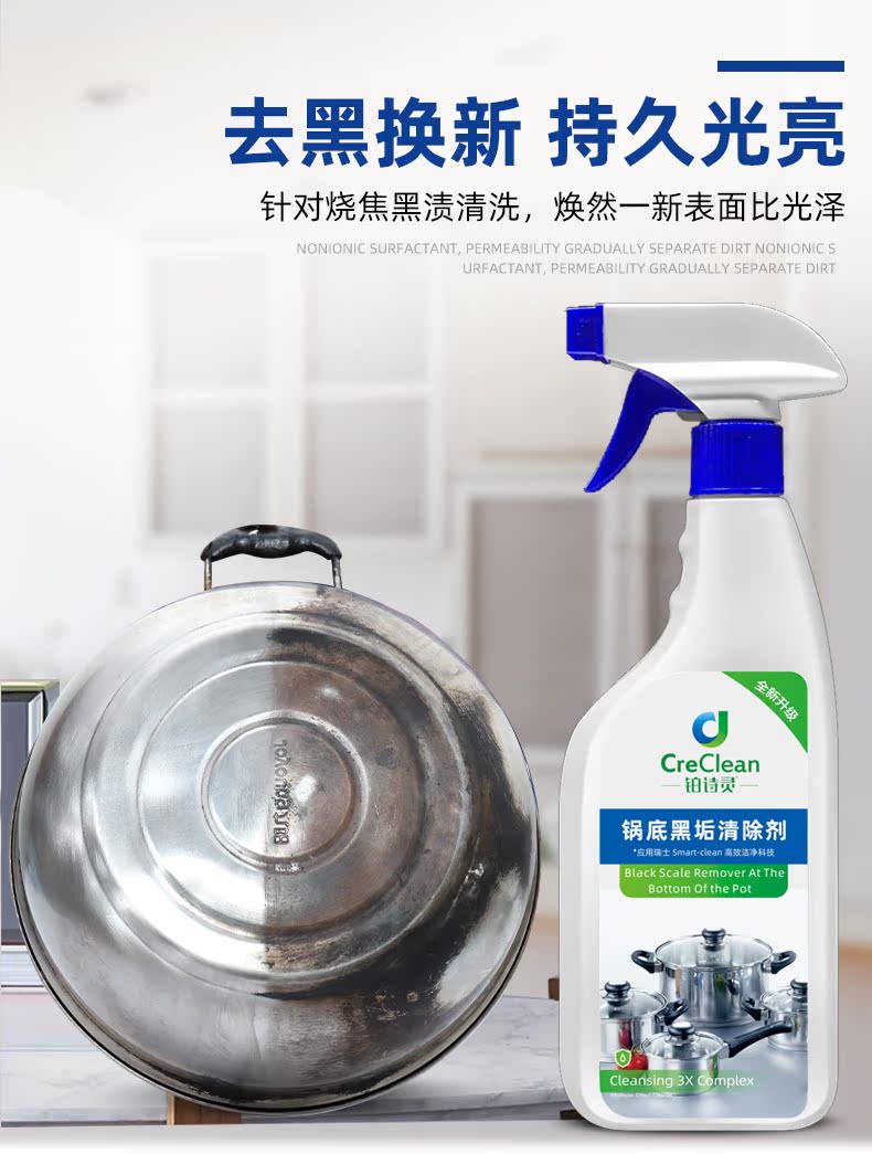 一瓶解决多种油污!深层顽渍清洁力强,不伤材质健康安全。针对烧焦黒渍清洗,焕然一新表面比光泽。非离子表面活性剂强力渗透,逐步分离污垢。成分安全轻松去除锅具黑垢。