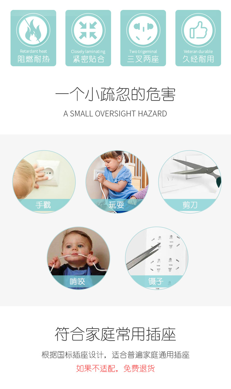【凯德氏】美国品牌,绝缘防触电,光华无毛刺不伤肤,采用ABS绝缘材质,安全无毒,三叉两座经久耐用,阻燃材质,离火既灭,紧密贴合宝宝打不开,不适配可退,让宝宝远离伤害【赠运费险】