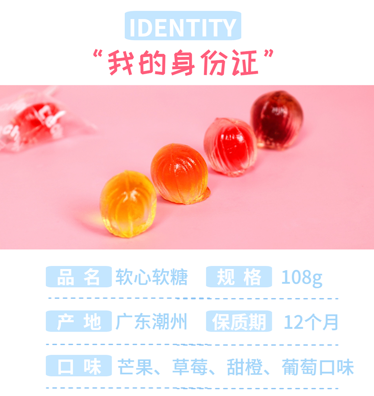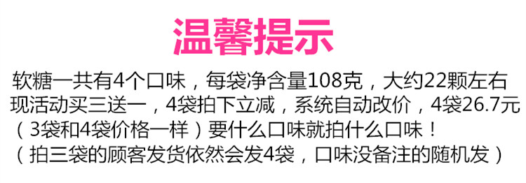【买三送一】线下各大超市同步有售,夹心软糖,四种口味可以选择.每一口都是浓郁的果香味,口感Q弹有嚼劲,0脂肪0反式脂肪酸,独立包装,添加15%的浓缩果汁,不用担心吃胖哦,随时随地想吃就吃~