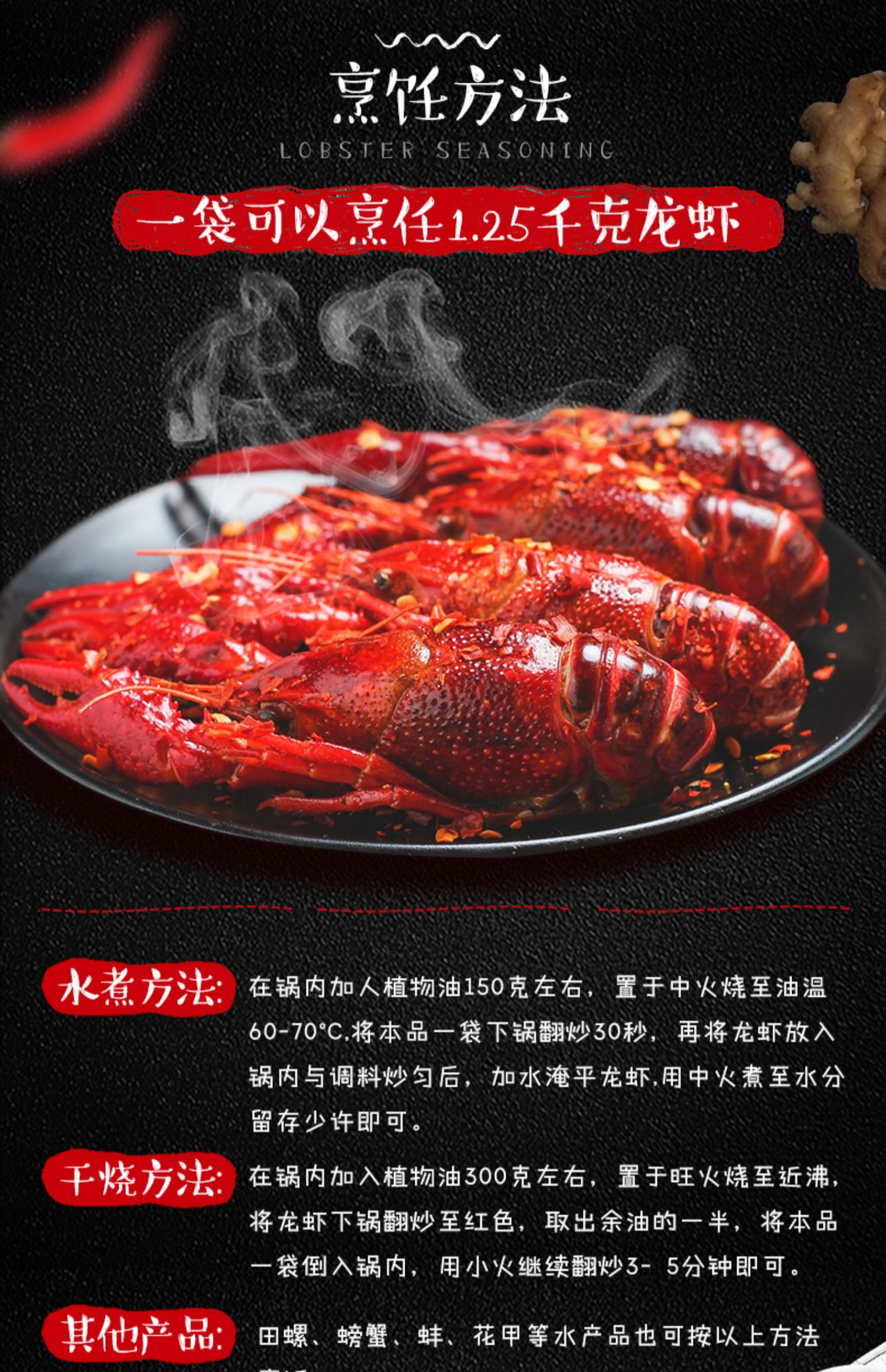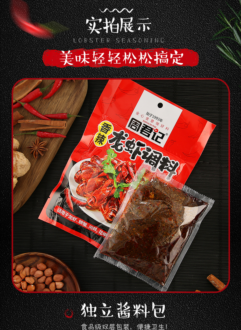周君记麻辣小龙虾调料香辣爽口,香味浓郁,制作简便,营养美味,告别黑暗料理,在家轻松享美食,炒龙虾,香辣蟹,花甲都美味,简单美味触手可及。
