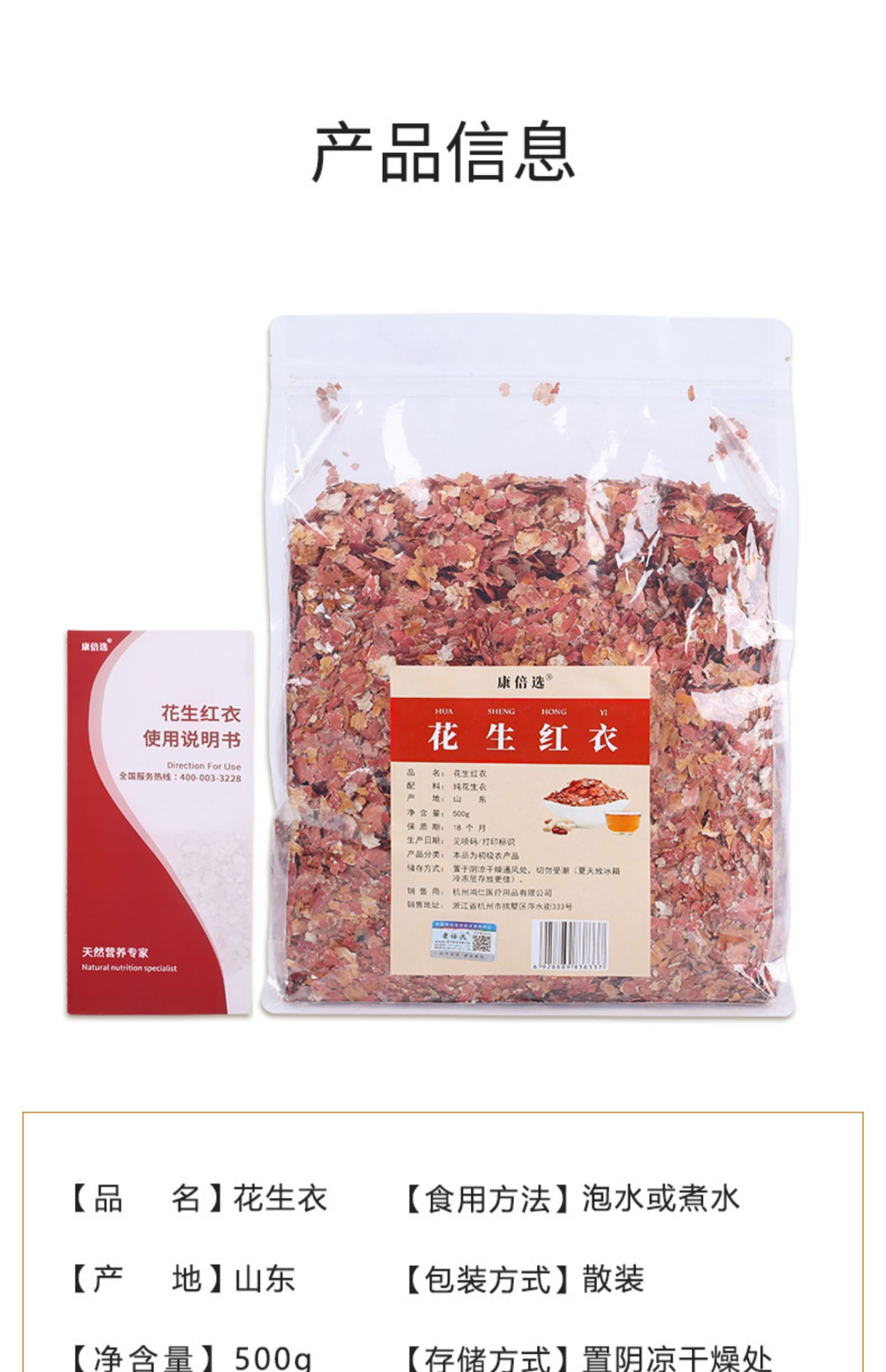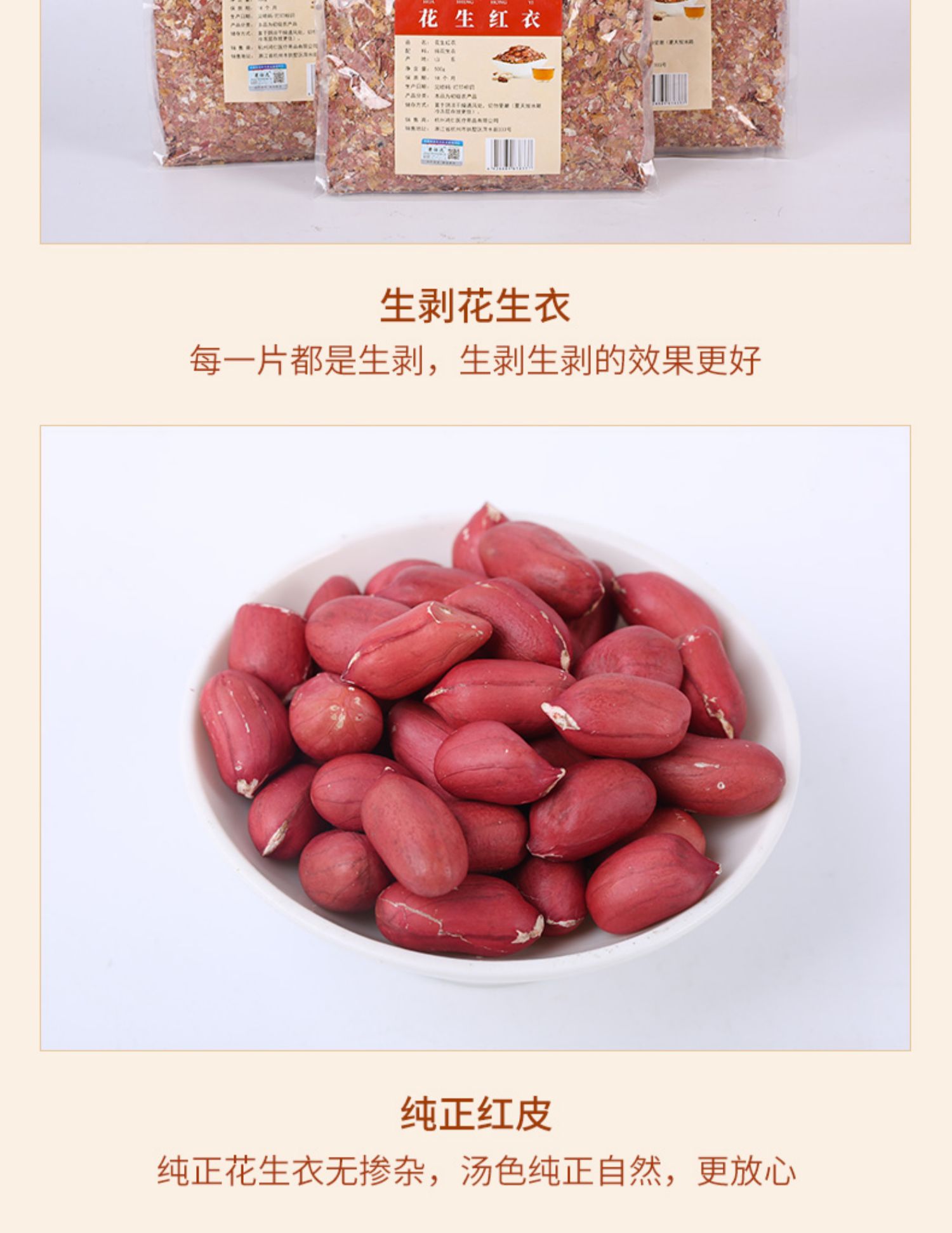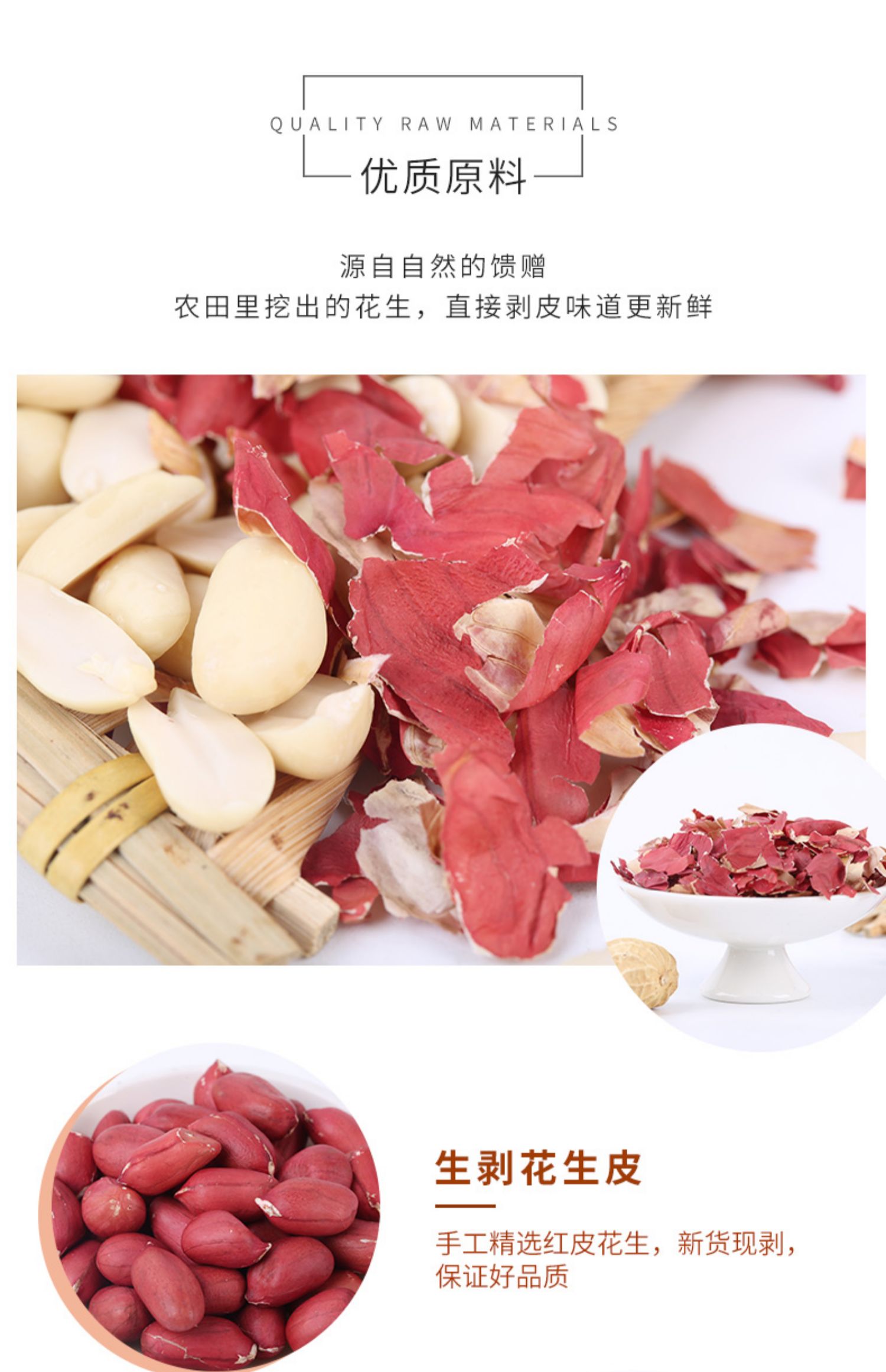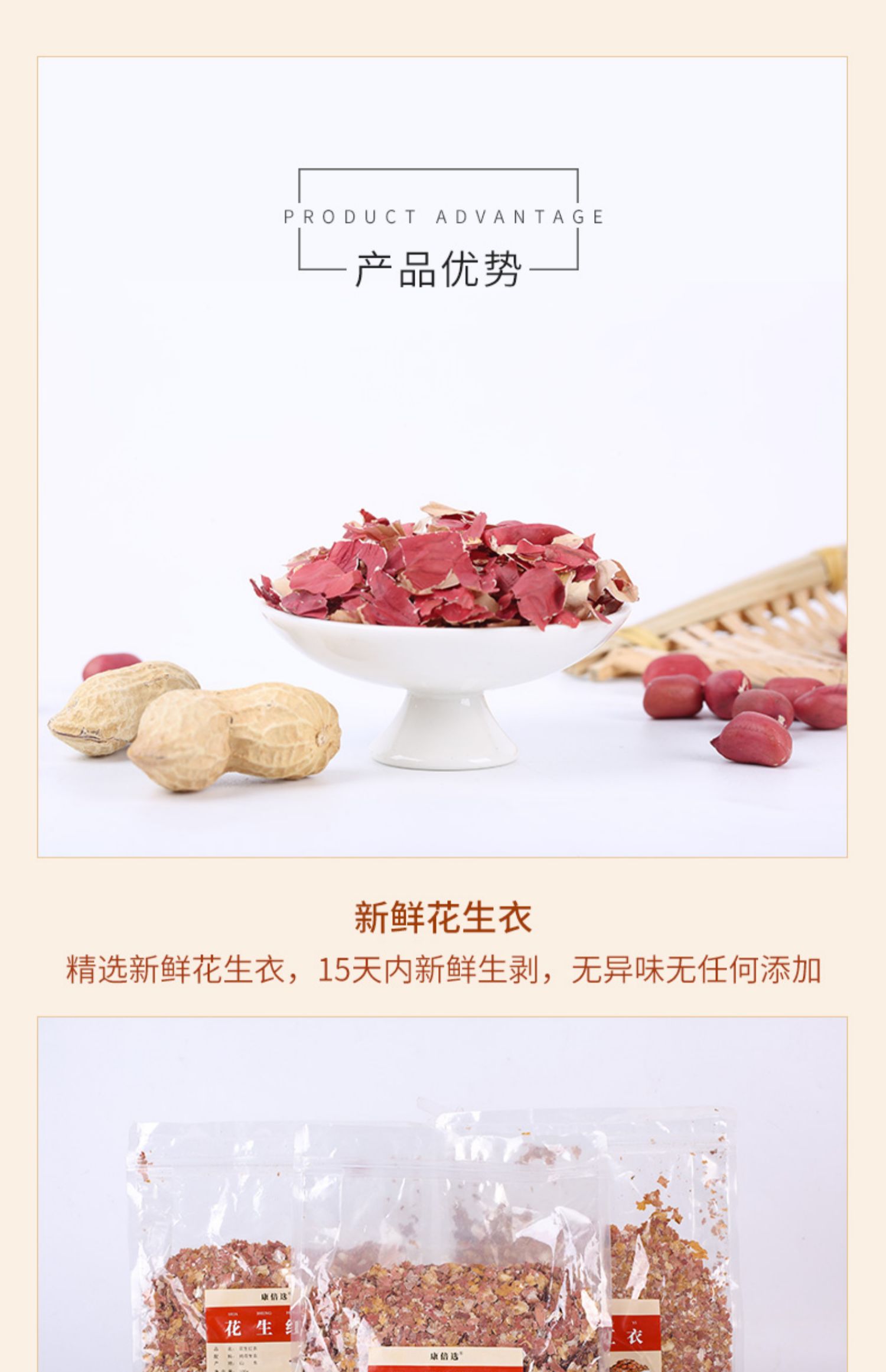 红皮花生衣!采用机器生剥花生皮,皮内营养保存好,无油味蛤蜊味,色泽鲜艳味道鲜美,拿来煮水泡水皆可,坚持食用,血小板升升升!