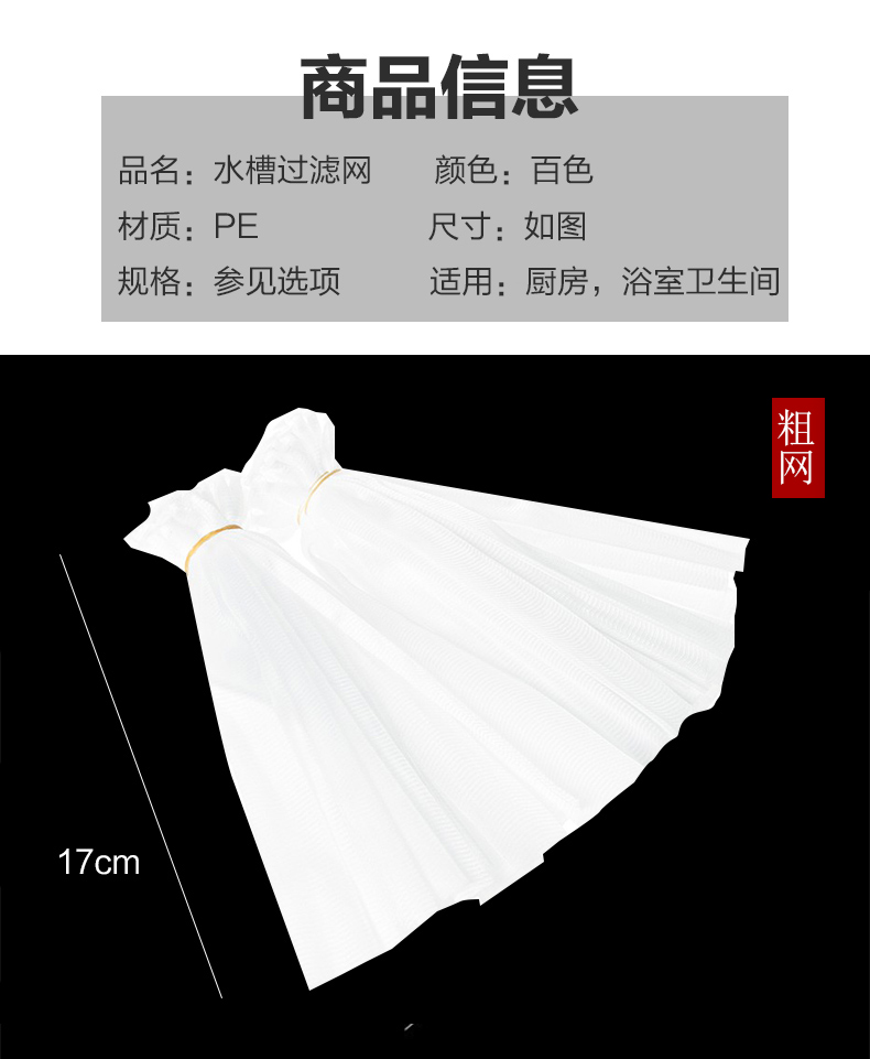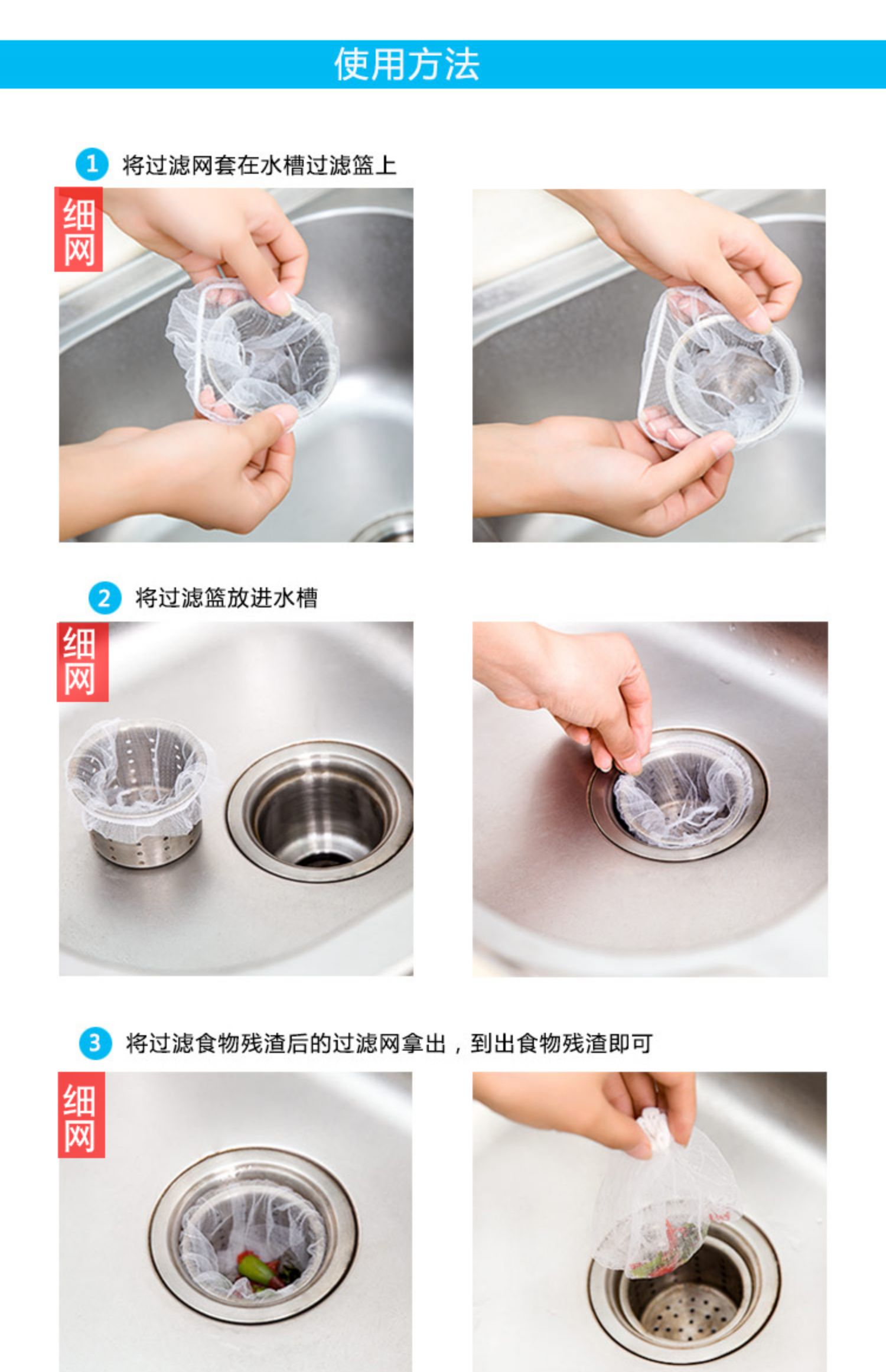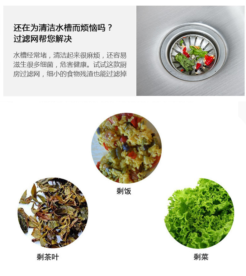 厨房水槽防堵过滤网,采用高密度织法,有效过滤各种杂物,简单方便,避免下水道堵塞,适合各种大小水槽,残渣饭粒统统过滤下来,轻松一拎,再也不用清洗水槽了!【赠运费险】