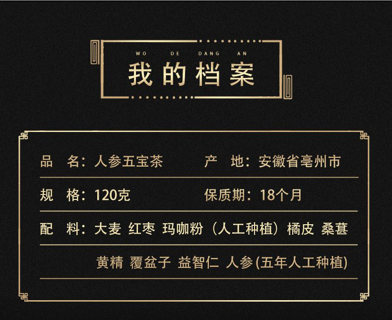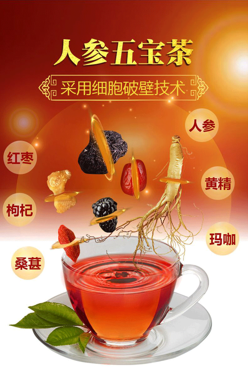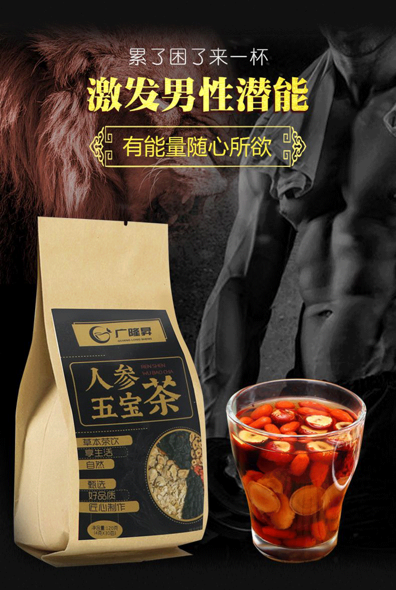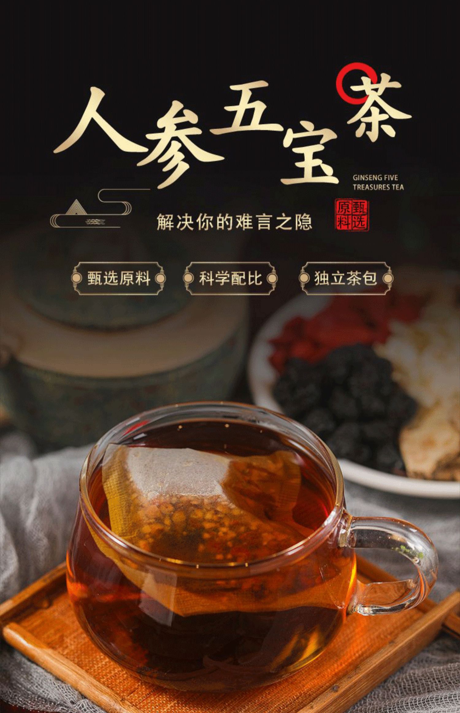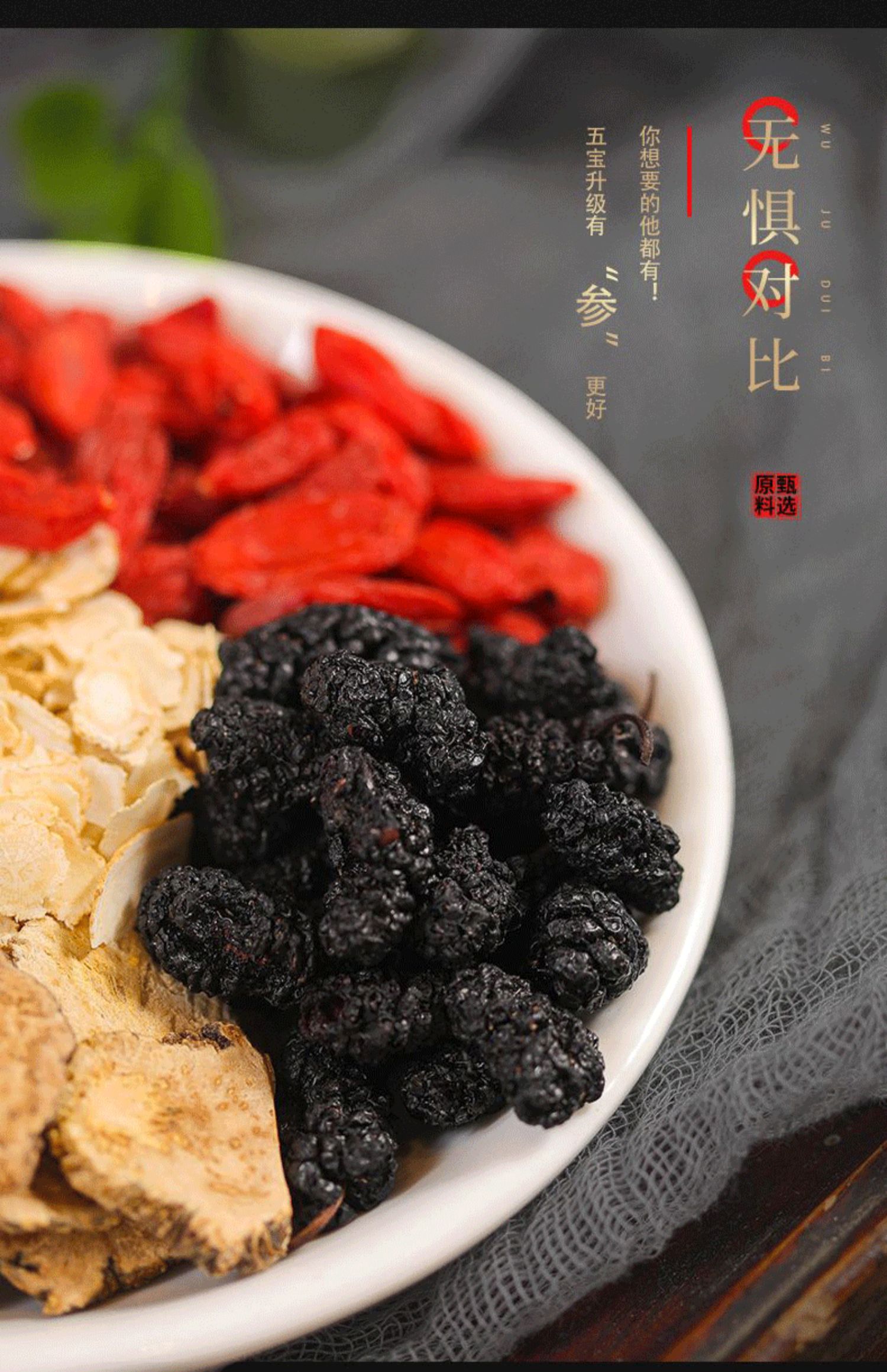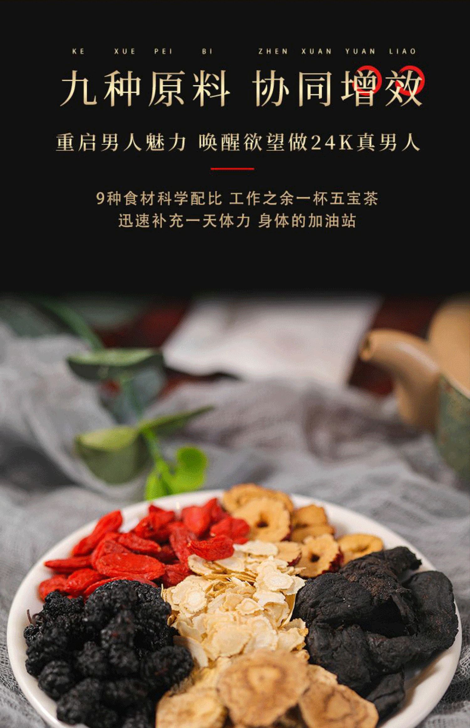 【正品男人五宝茶】精选人参,玛咖,枸杞,桑葚,山药等真材实料!有效解决熬夜,气血亏损,肾虚等疾病!一冲即饮,补气养元又补肾,让你精力充沛信心满满,赶紧入手吧!男女都可喝~