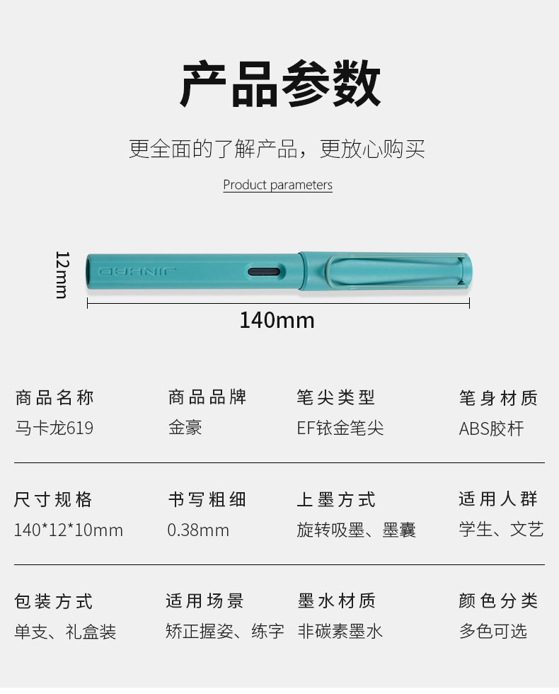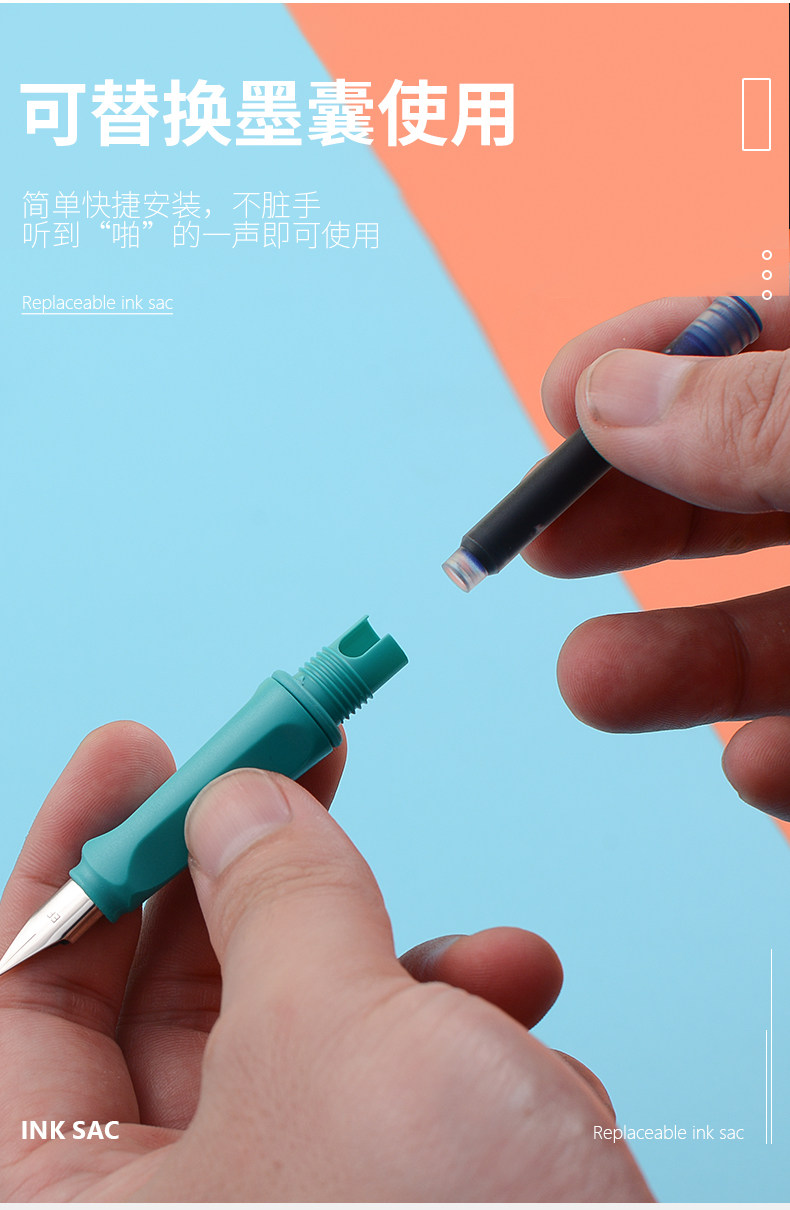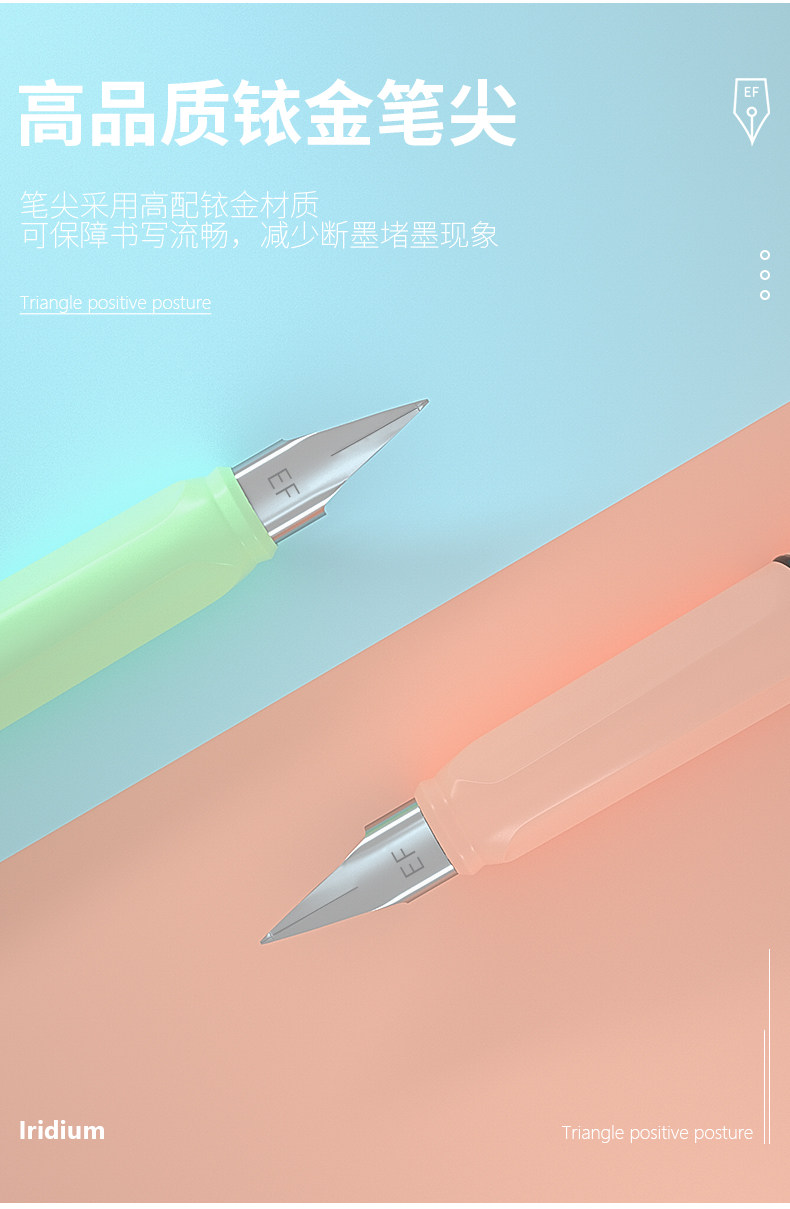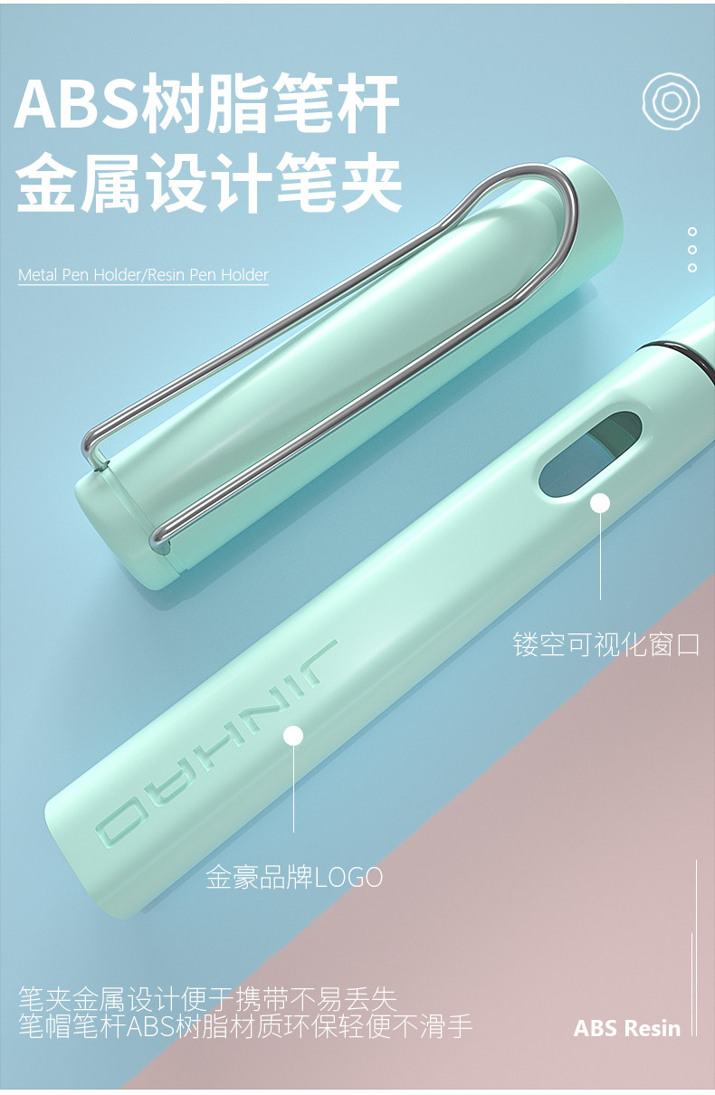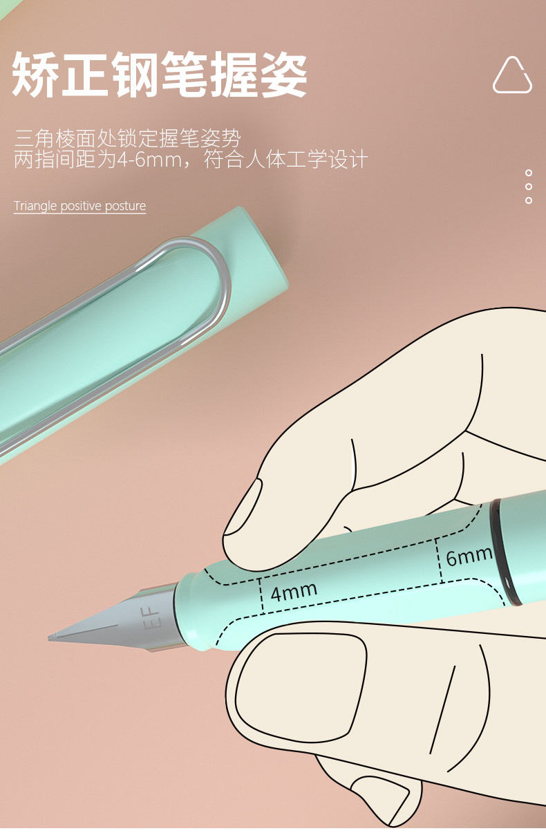 ABS树脂材质笔身,高品质铱金笔尖,减少堵墨断墨现象,符合人体势,镂空可视化墨窗,工学设计,矫正握笔姿高配置钢笔保障长时间书写舒适!