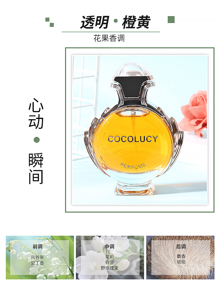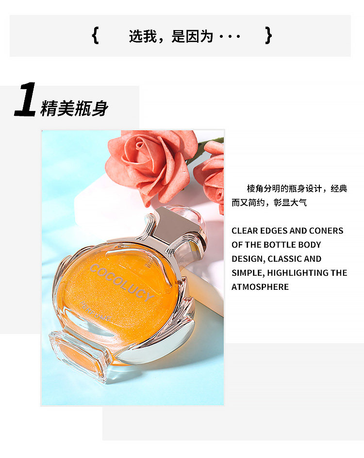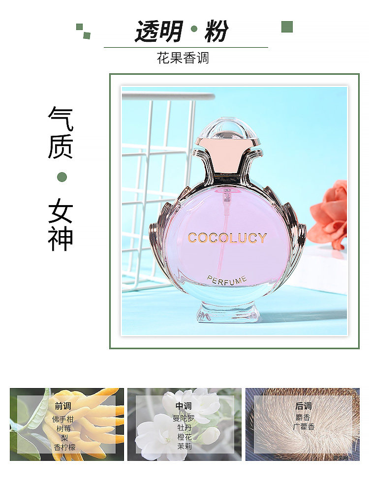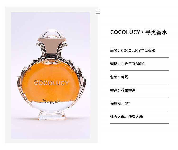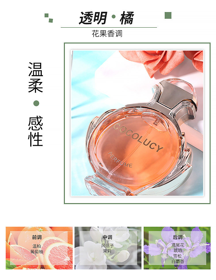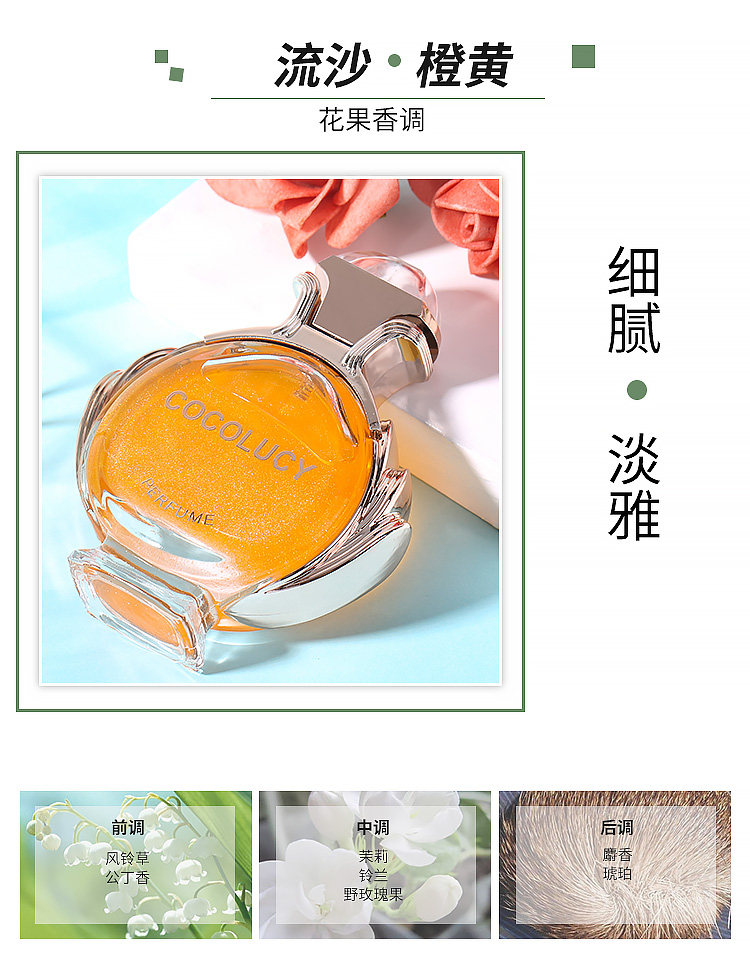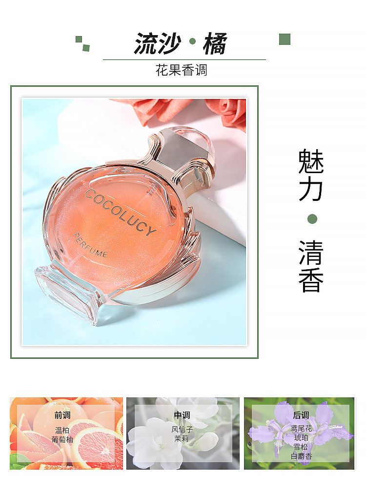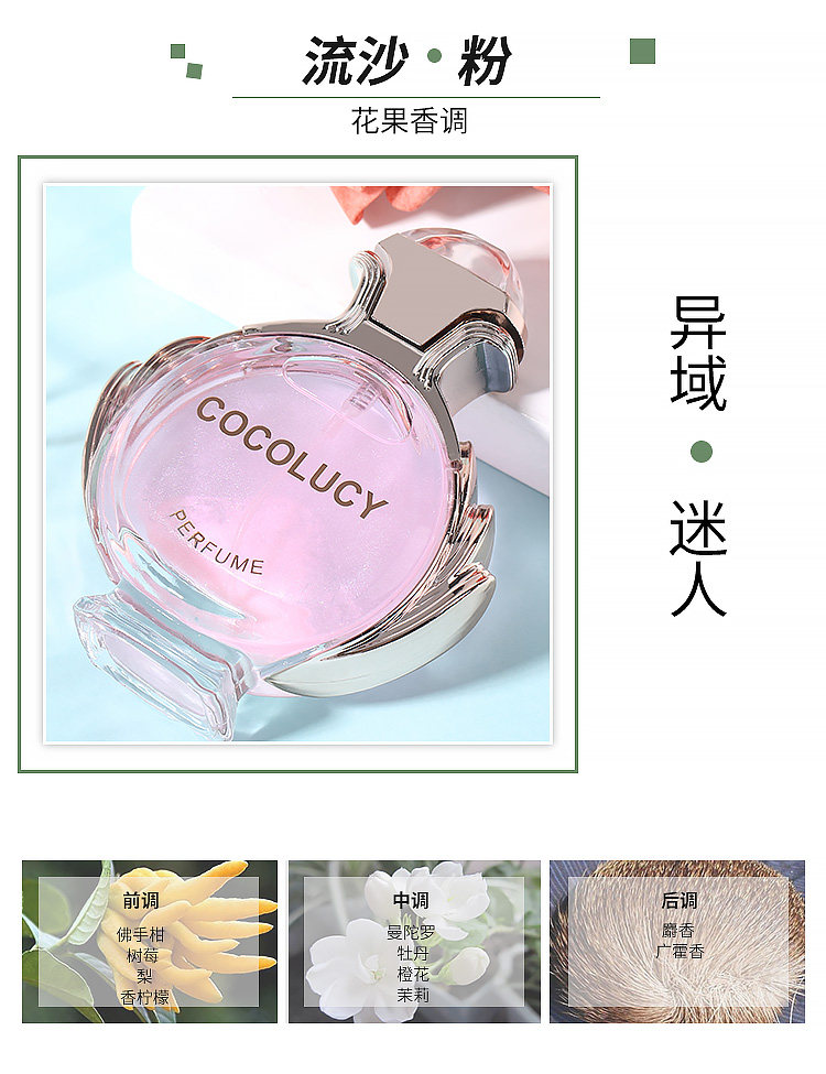 cocolucy网红流沙香水,花果/花香调,多种香味可选。铝制雾化喷头,雾化性好,结构机密,不漏液。瓶身玻璃材质,线条流畅有质感,高端大气上档次,送礼自用都有面【正品保证】