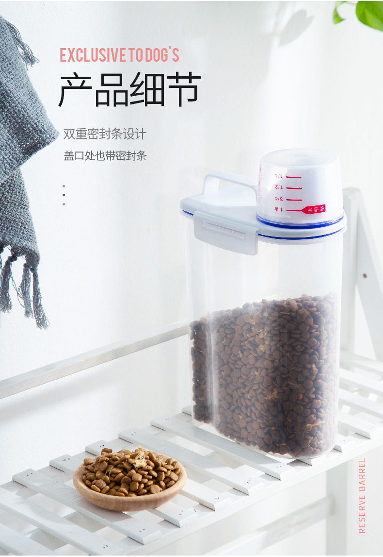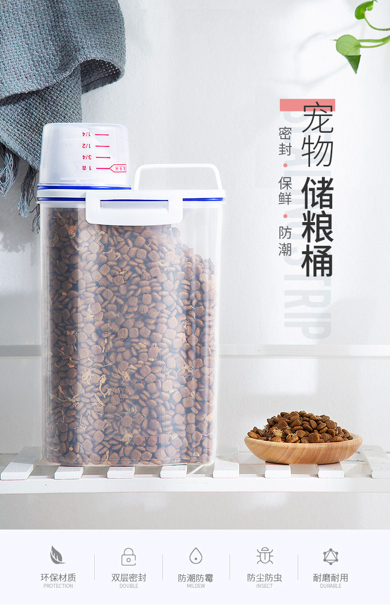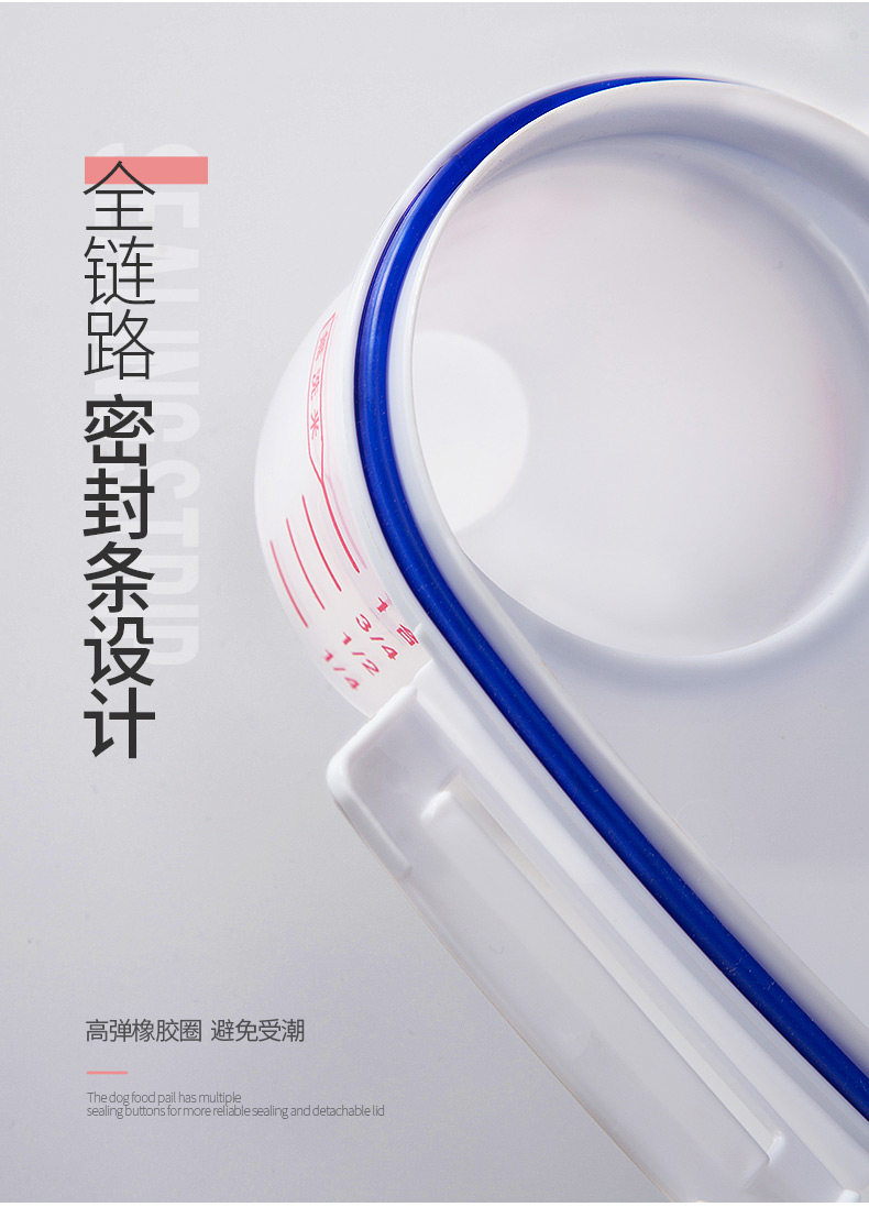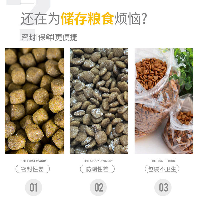 多型号可选,密封防潮,紧密盖装,锁住新鲜,环保材质,双层密封,防尘防虫,耐磨耐用。宠物用品。