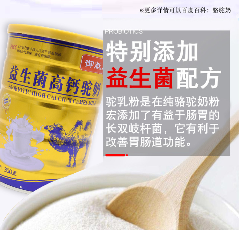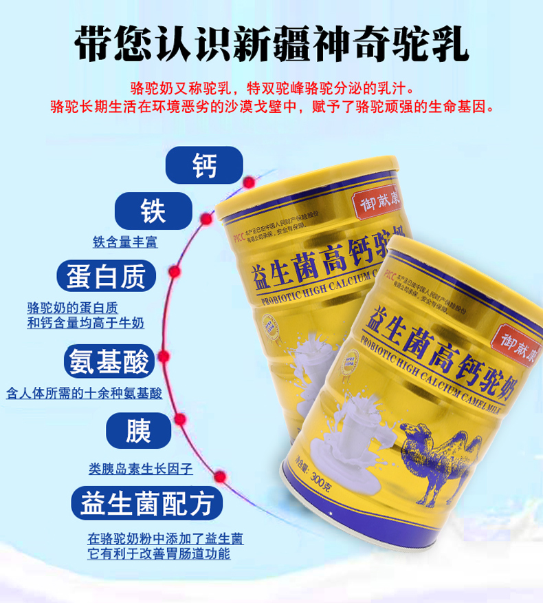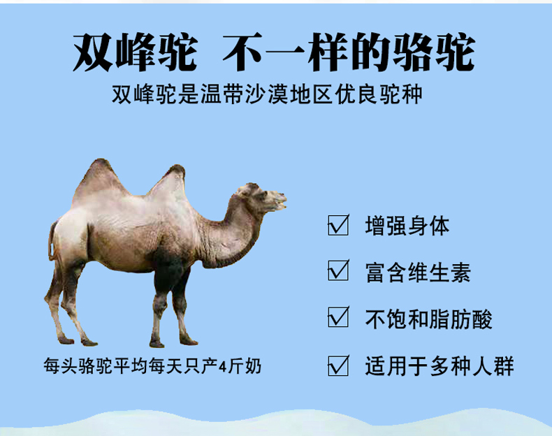 线下专柜爆款,我们不一样,源自中国骆驼之乡“阿拉善”,双峰骆驼产奶较少,营养价值更高,全脂驼乳粉,无任何添加,安全健康,有天然胰岛素钙、铁,蛋白质含量高,适合各个年龄段吸收【七天无理由退换】