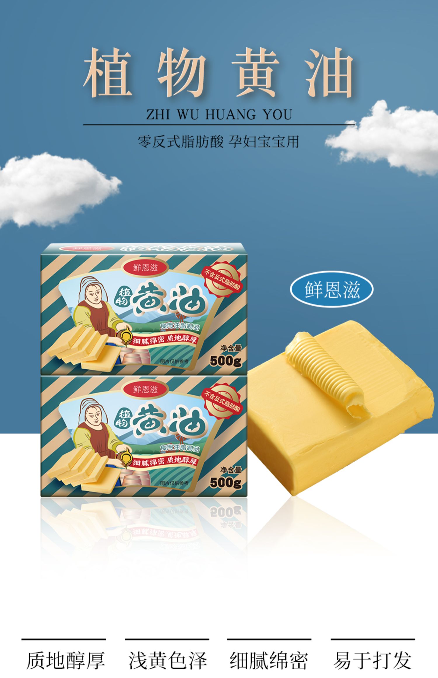 植物黄油500g~细腻绵密,轻松打发!奶味香浓,气味纷香诱人,用途广泛,味道纯正,多种用途,玩转烘焙,不含反式脂肪酸,孕妇宝宝可食用!