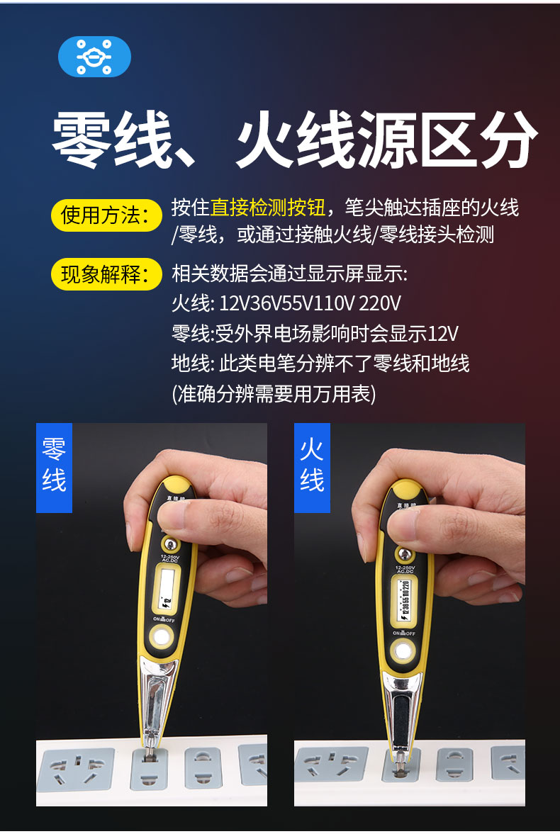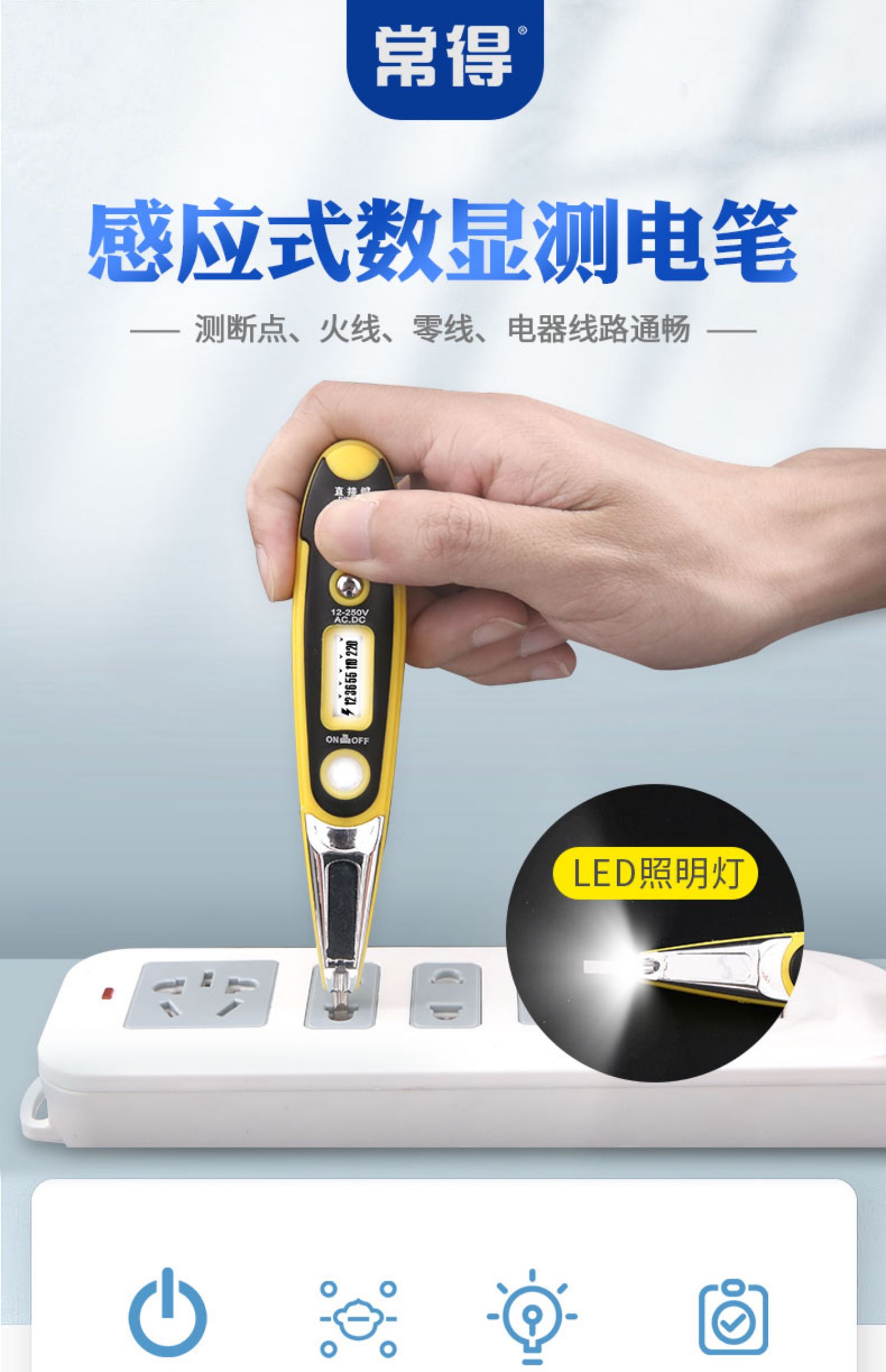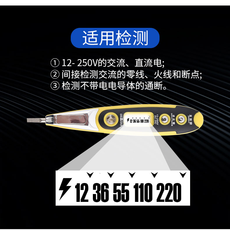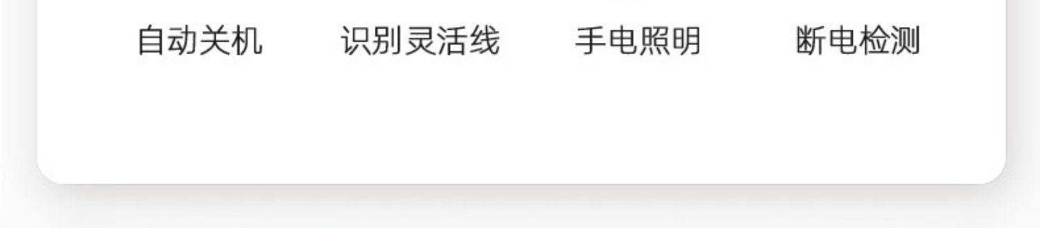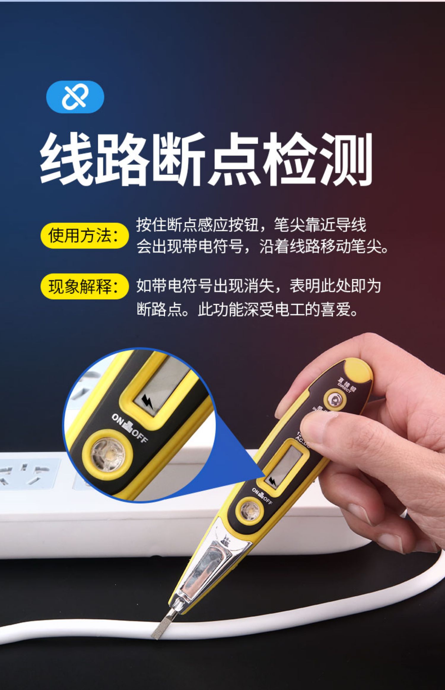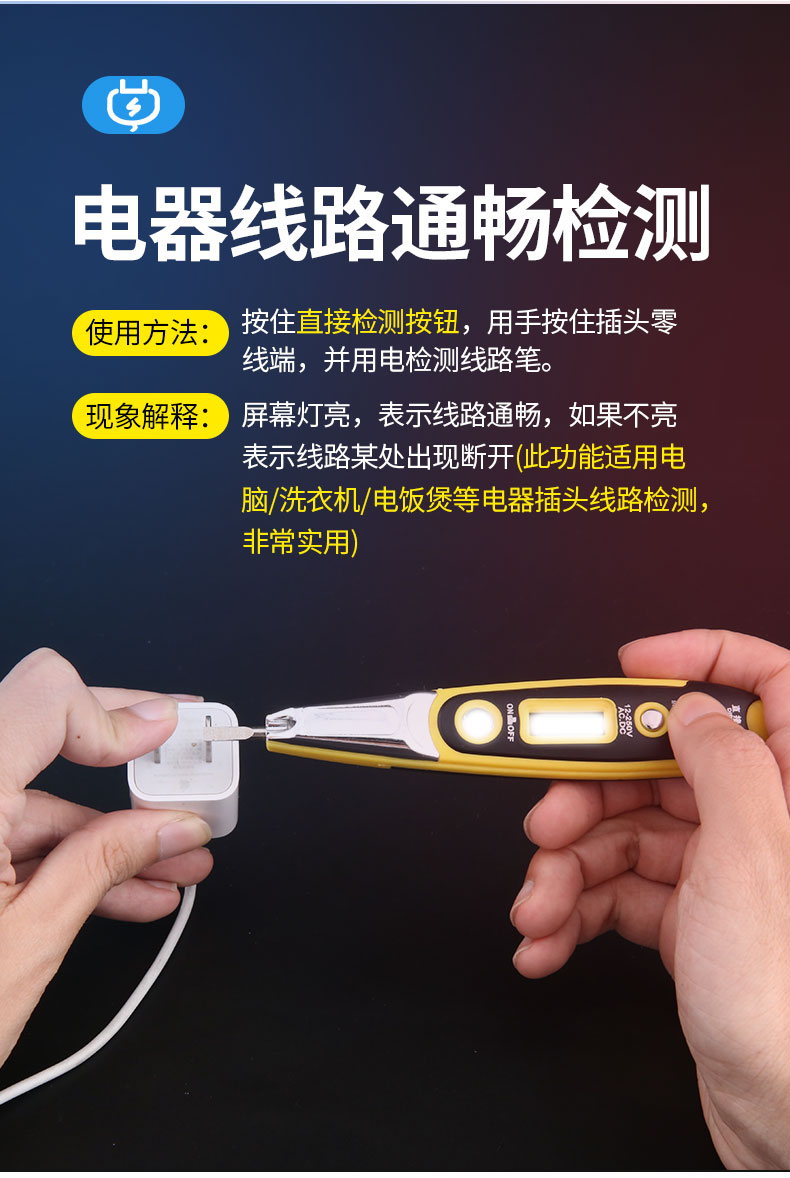 自动检测功能,感应数显,火线零线检测,感应断点检测,可照明灯使用,方便快捷。