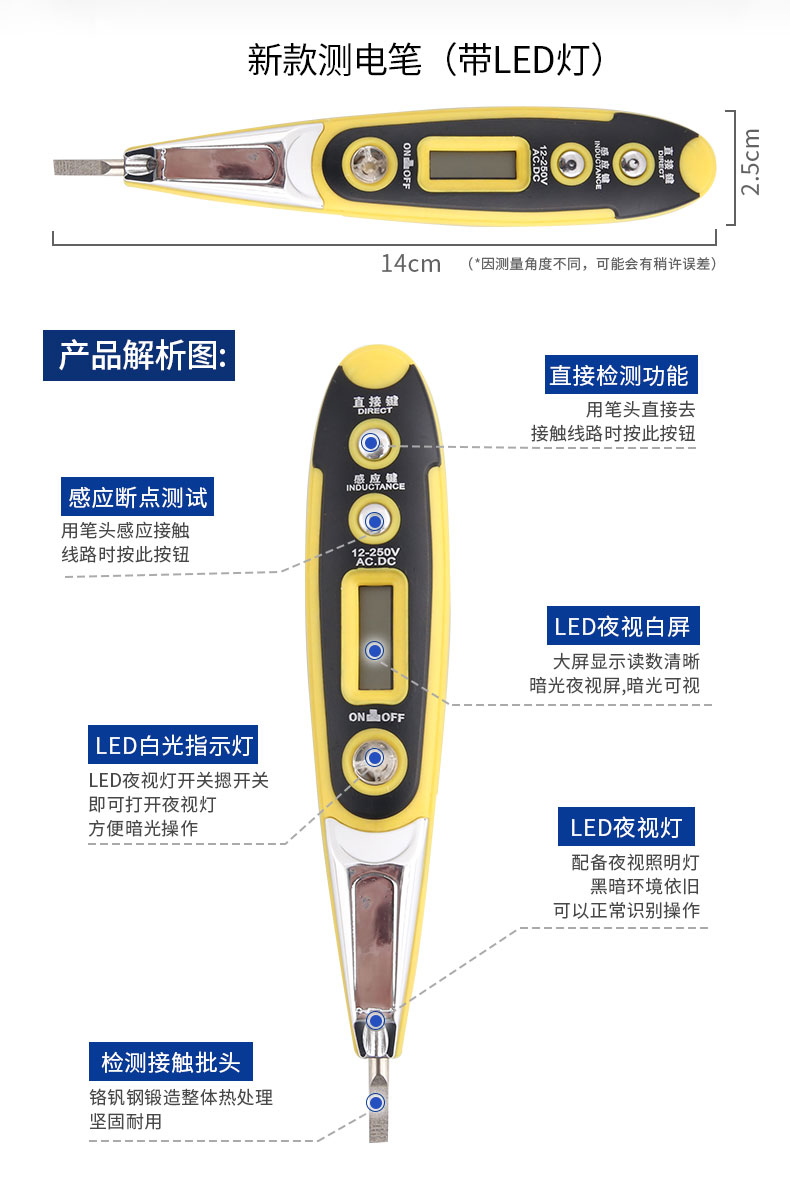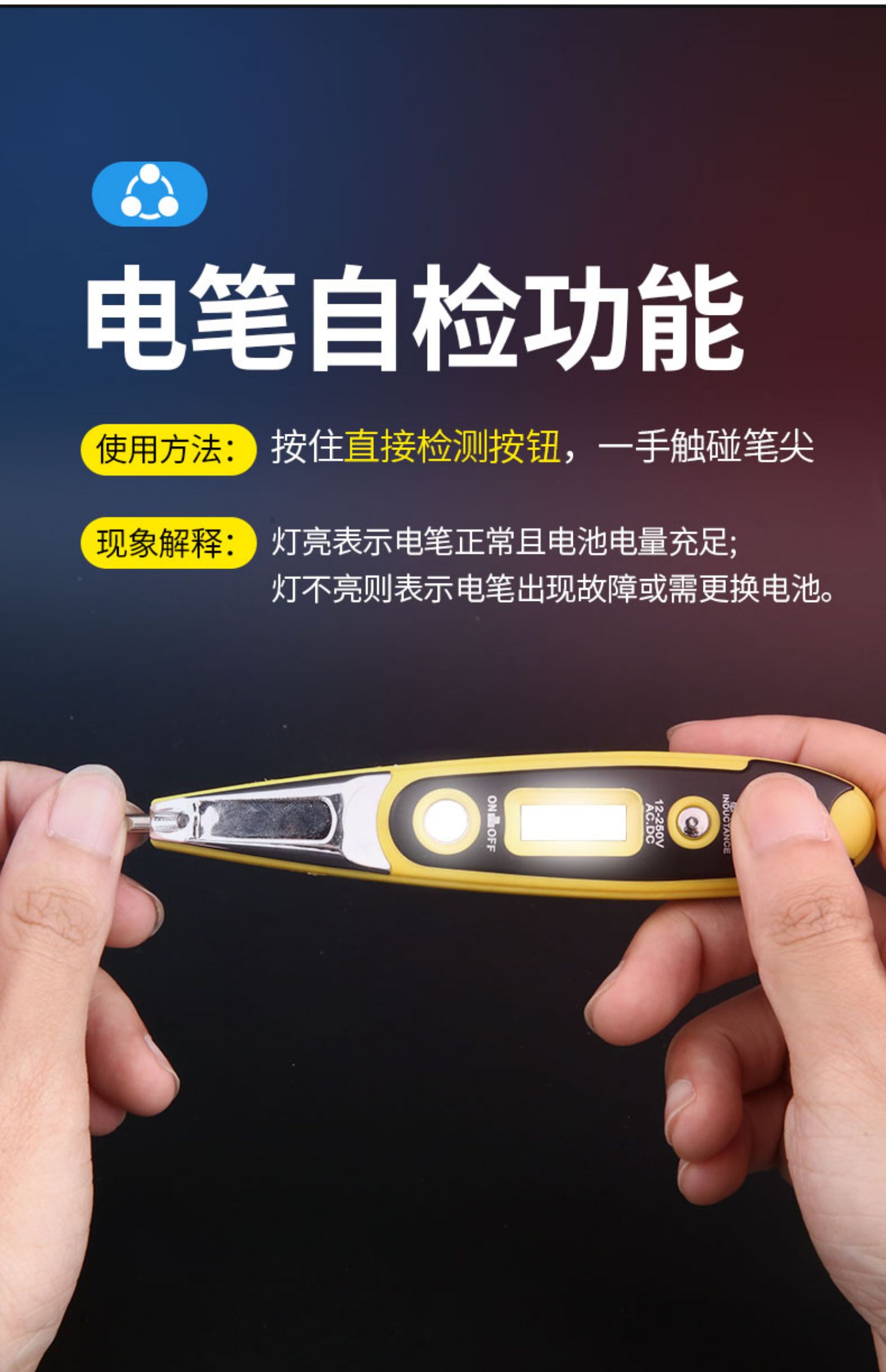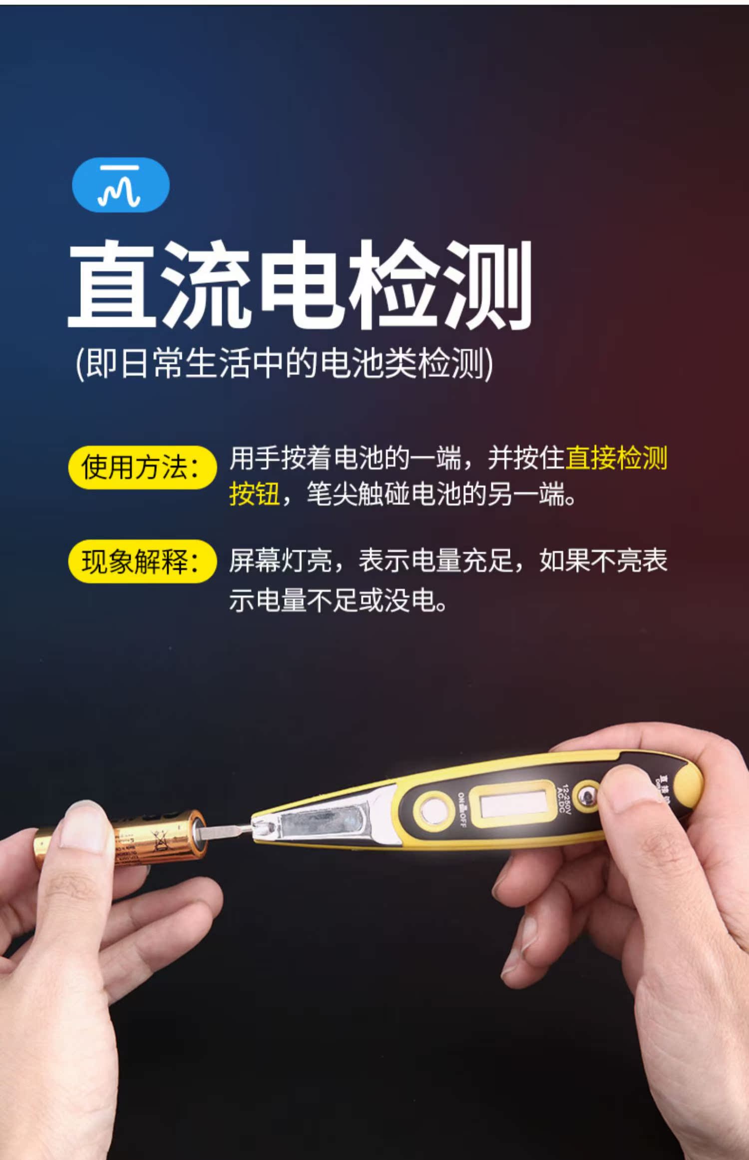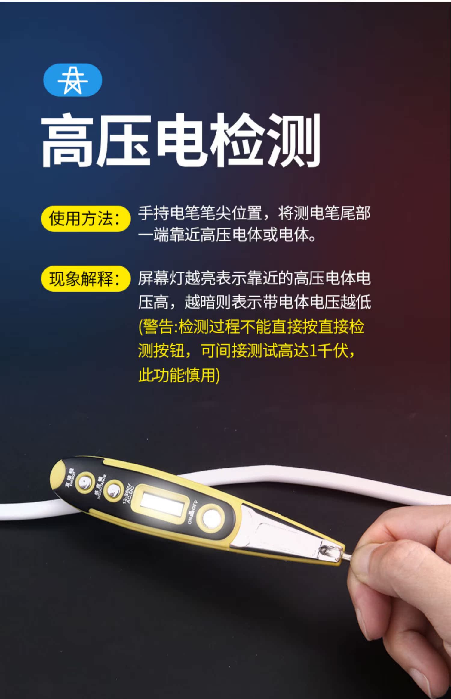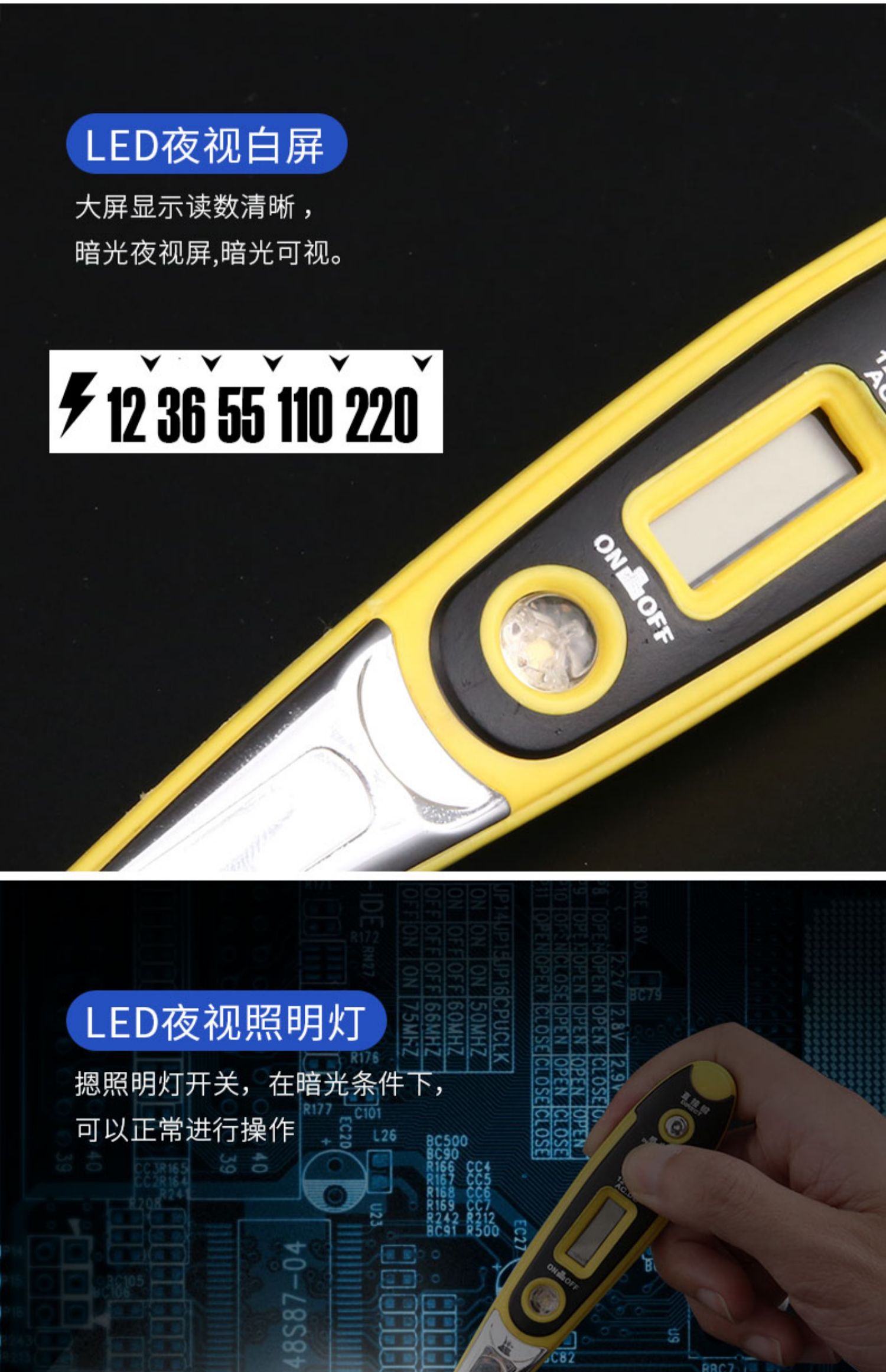自动检测功能,感应数显,火线零线检测,感应断点检测,可照明灯使用,方便快捷。