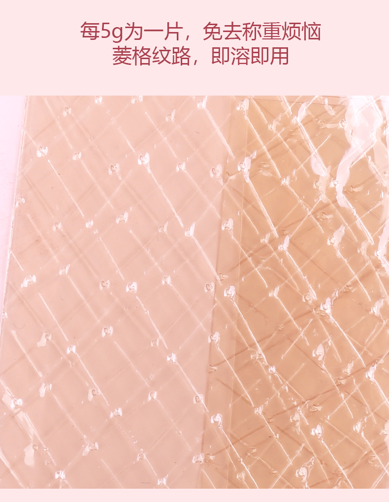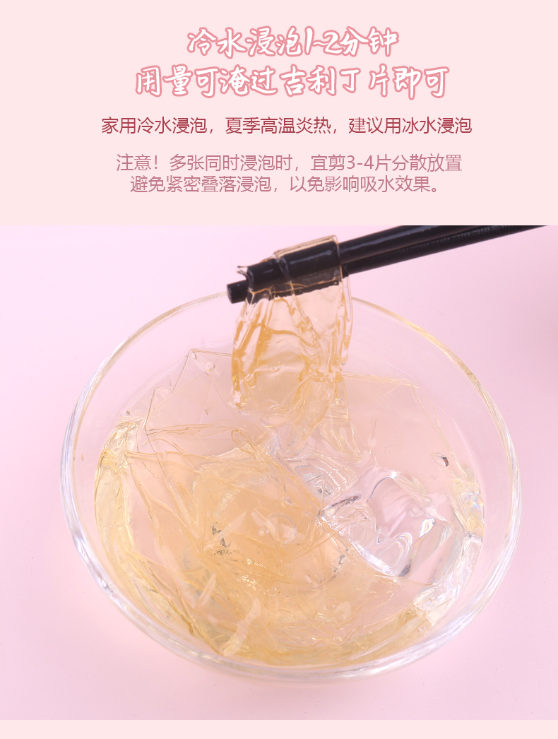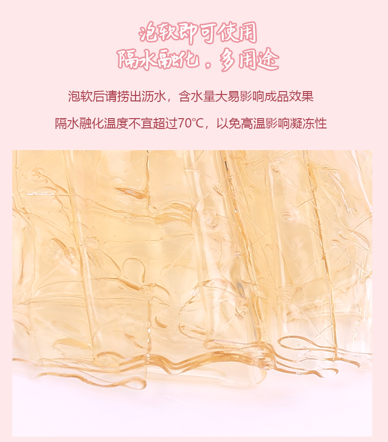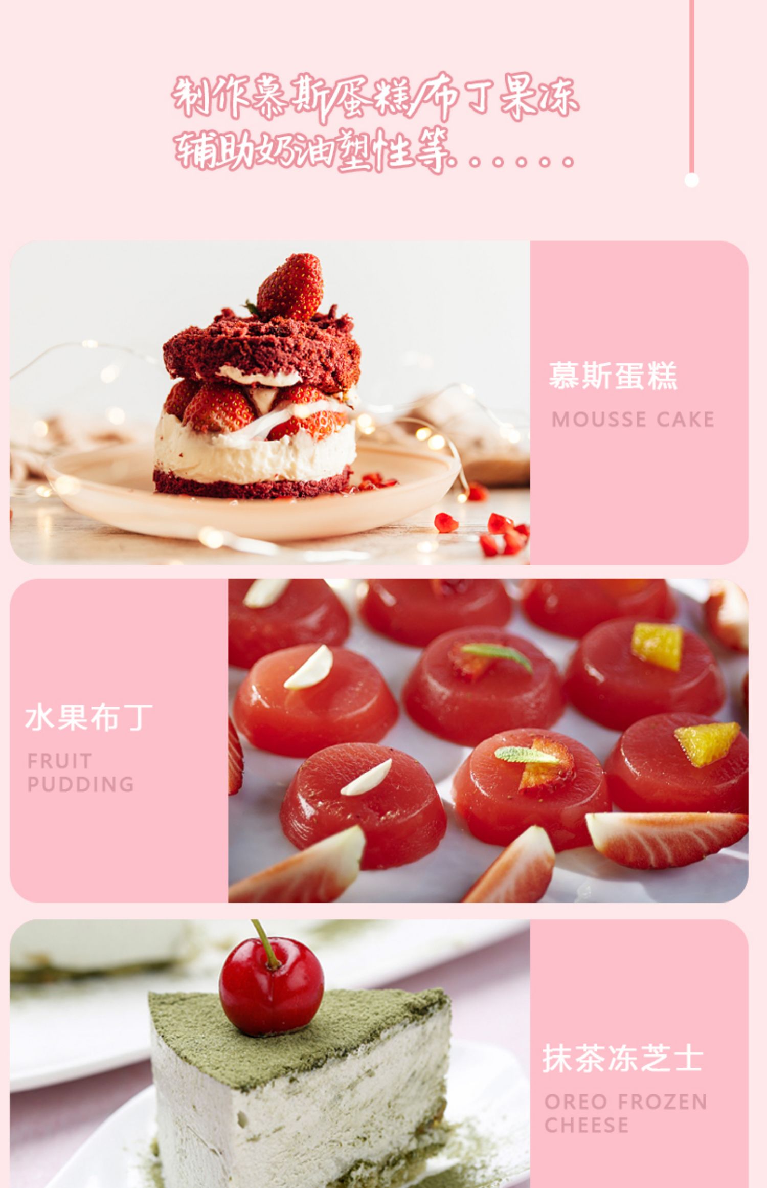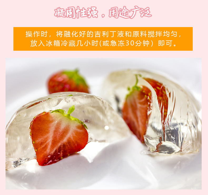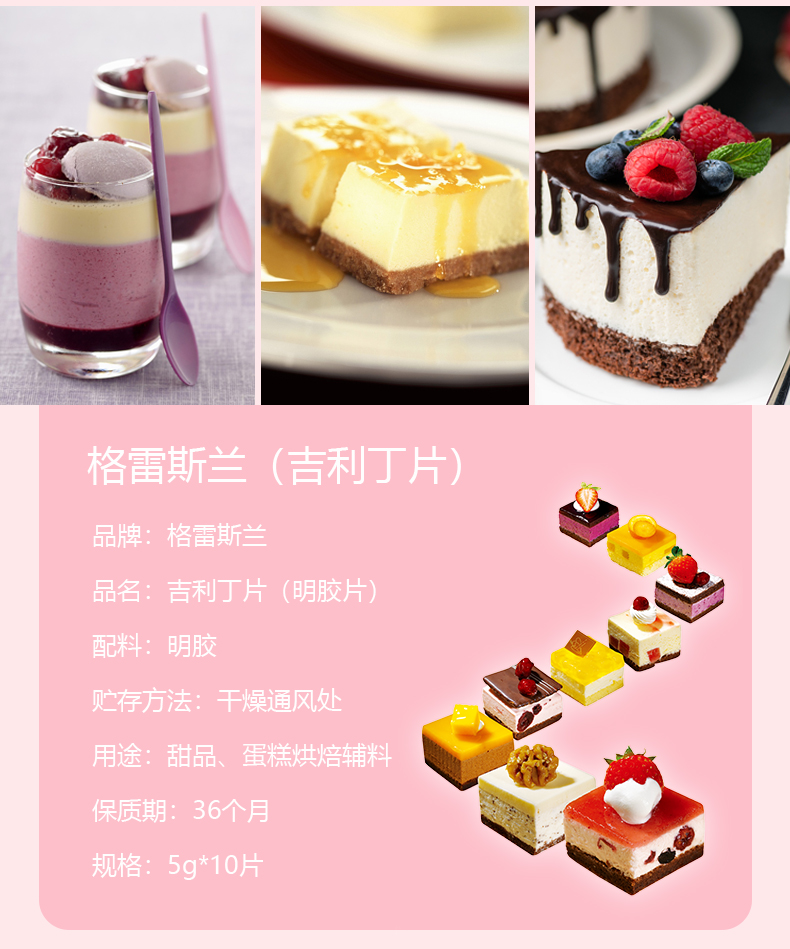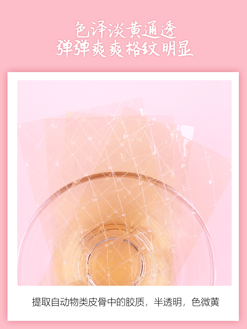 真牛骨提取,凝固力强。吉利丁又称明胶或者鱼胶,它是从动物的骨头提炼出来的胶质,主要成分为蛋白质。每片5g,无需称量,浸泡后能整片捞出。